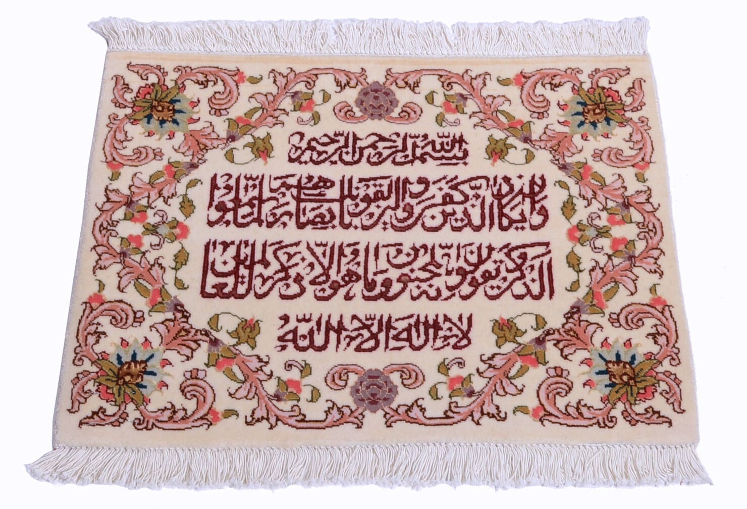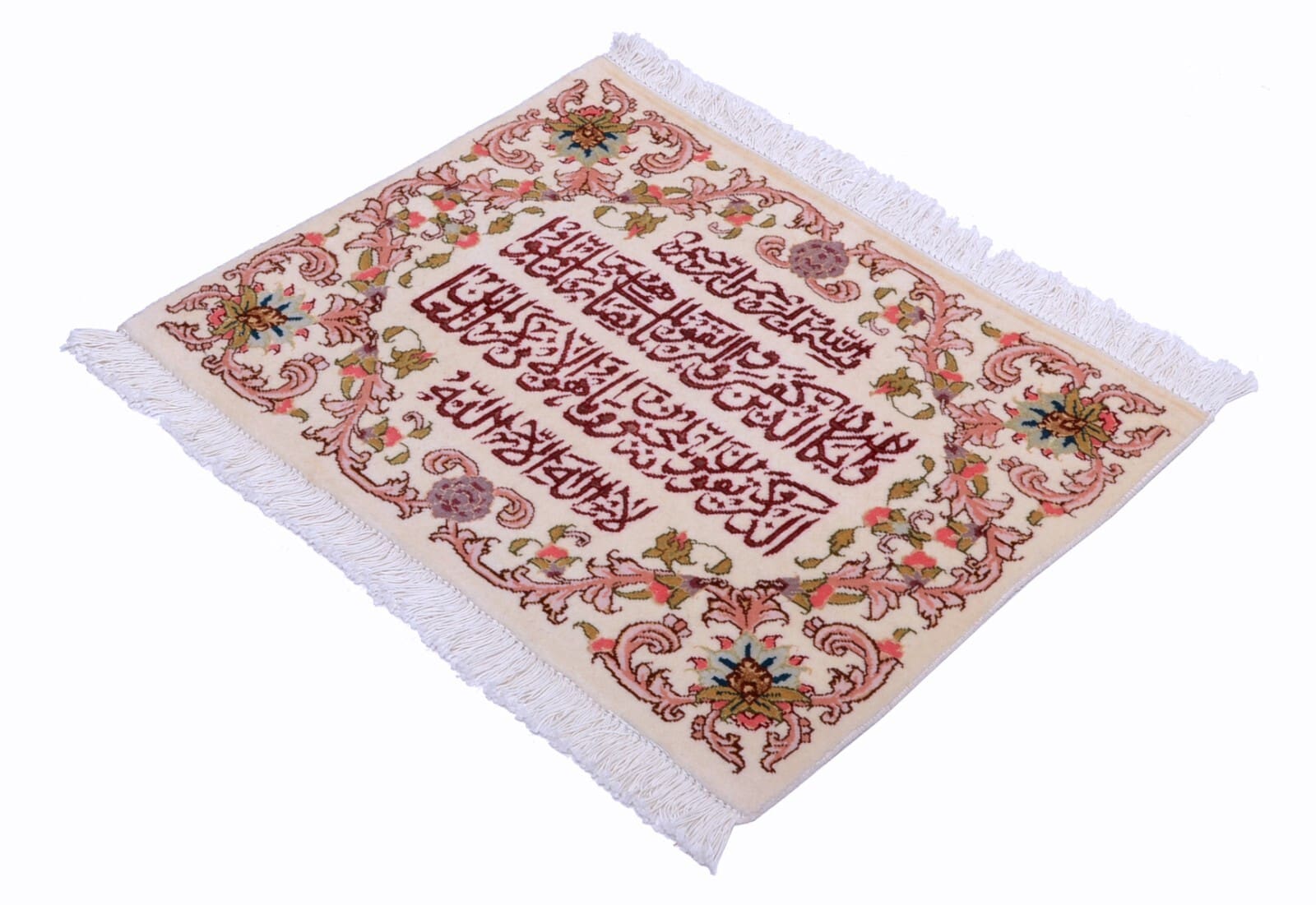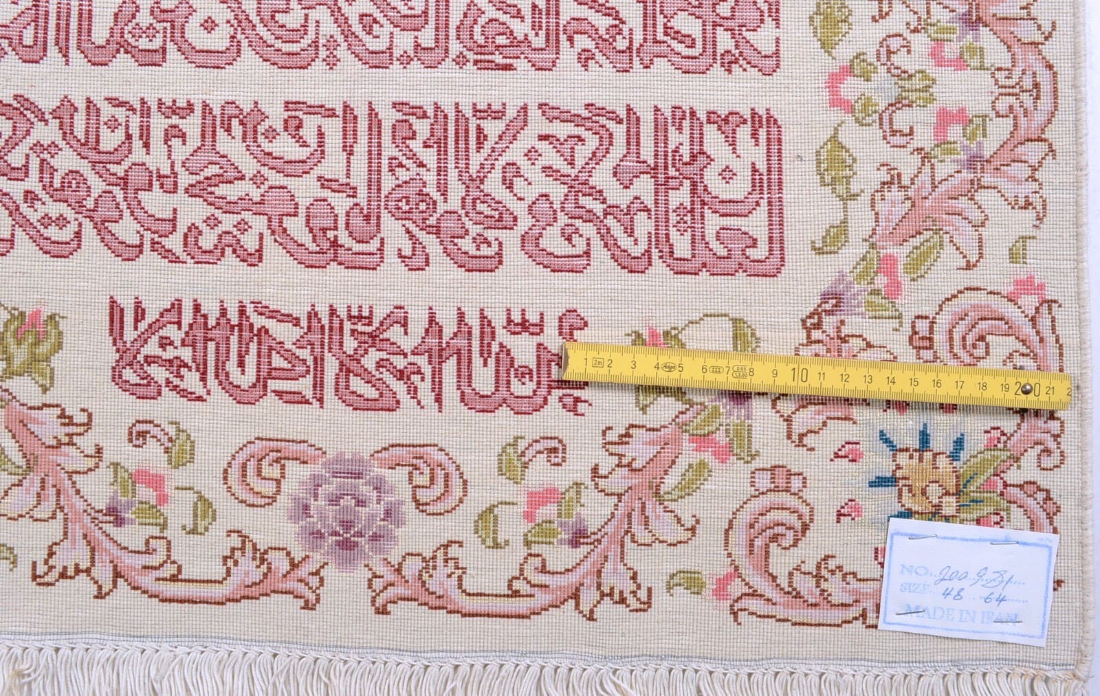 Handgeknüpfter Orientteppich | Herkunft: Persien | Größe: 49 x 65 cm | Knotendichte: 450.000 – 500.000 Knoten/m² | Material: 95% Schurwolle, 5% Seide | Zustand: Neu mit Etikett | Muster: Floral mit Kalligrafieschrift | Dicke: ca. 8 mm | Gewicht: ca. 3 kg/m² | Für Fußbodenheizung geeignet | Stil: Traditionell Orientalisch/Persisch