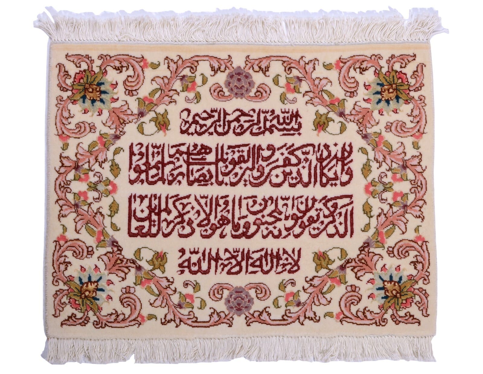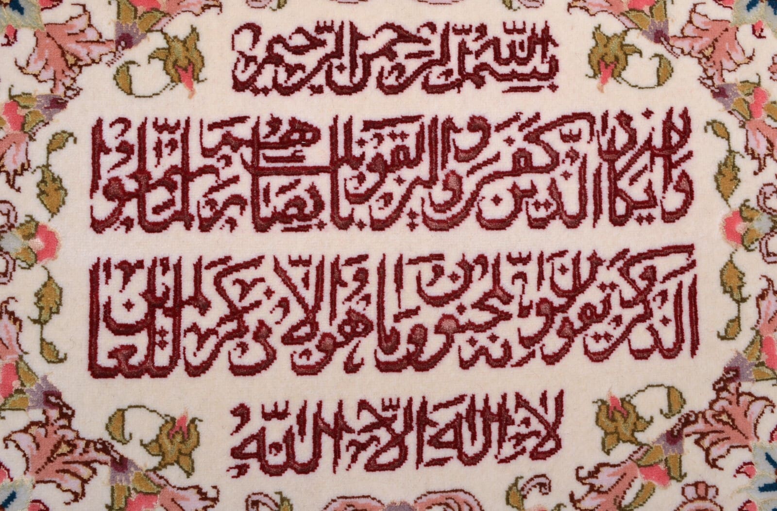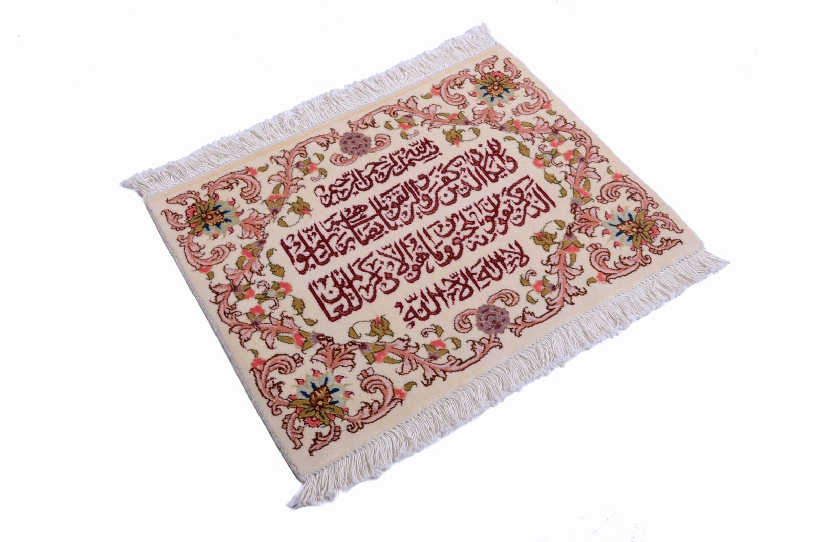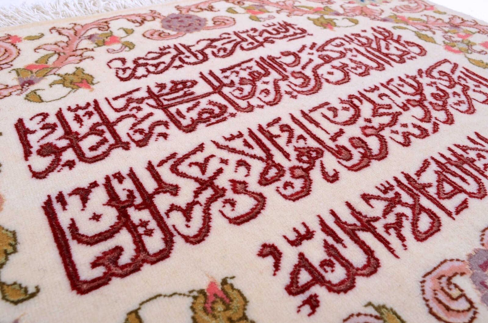 Handgeknüpfter Orientteppich | Herkunft: Persien | Größe: 49 x 65 cm | Knotendichte: 450.000 – 500.000 Knoten/m² | Material: 95% Schurwolle, 5% Seide | Zustand: Neu mit Etikett | Muster: Floral mit Kalligrafieschrift | Dicke: ca. 8 mm | Gewicht: ca. 3 kg/m² | Für Fußbodenheizung geeignet | Stil: Traditionell Orientalisch/Persisch