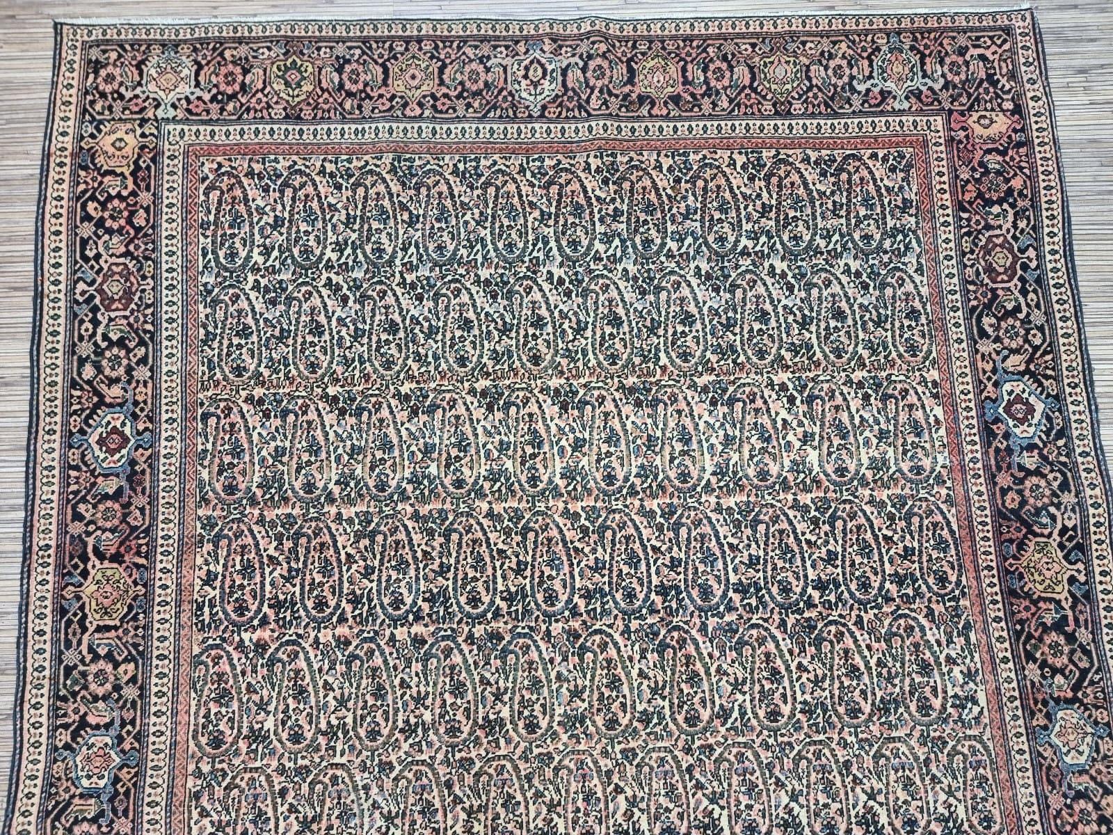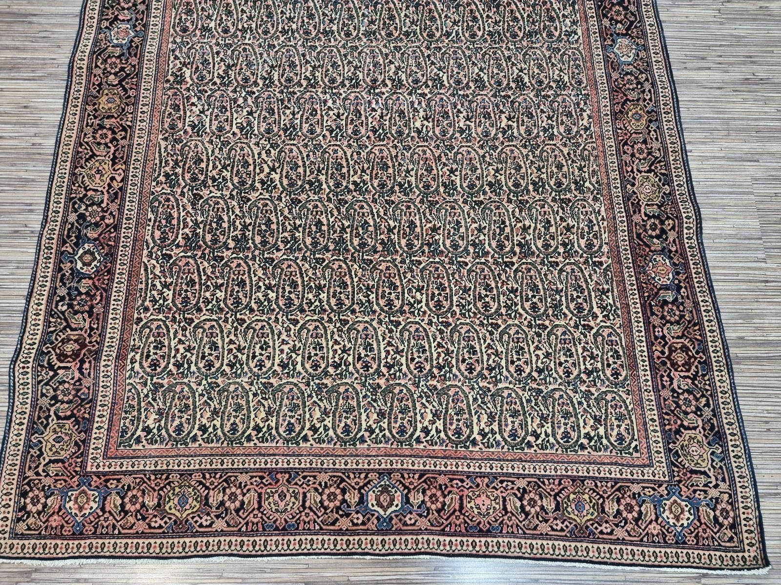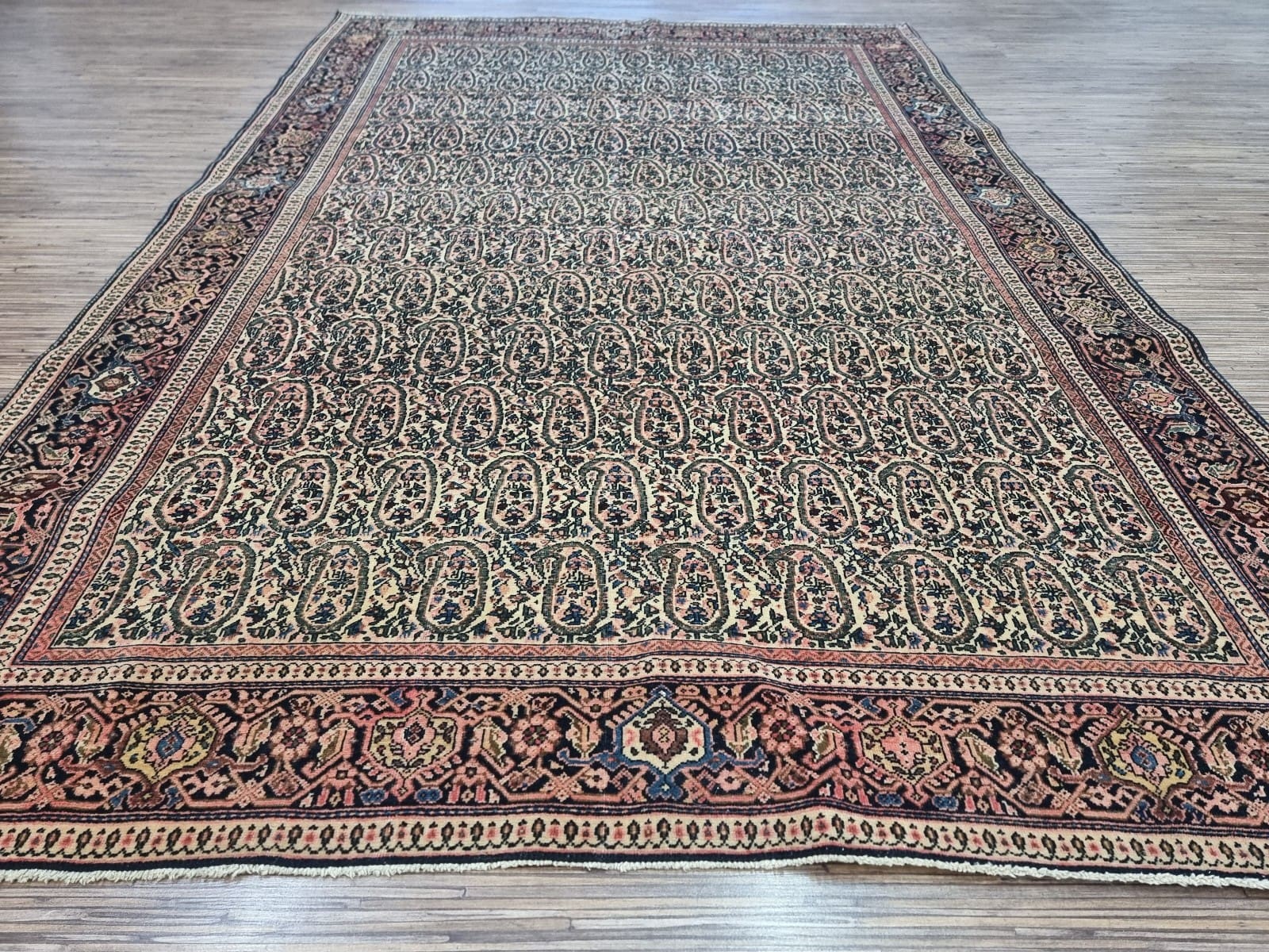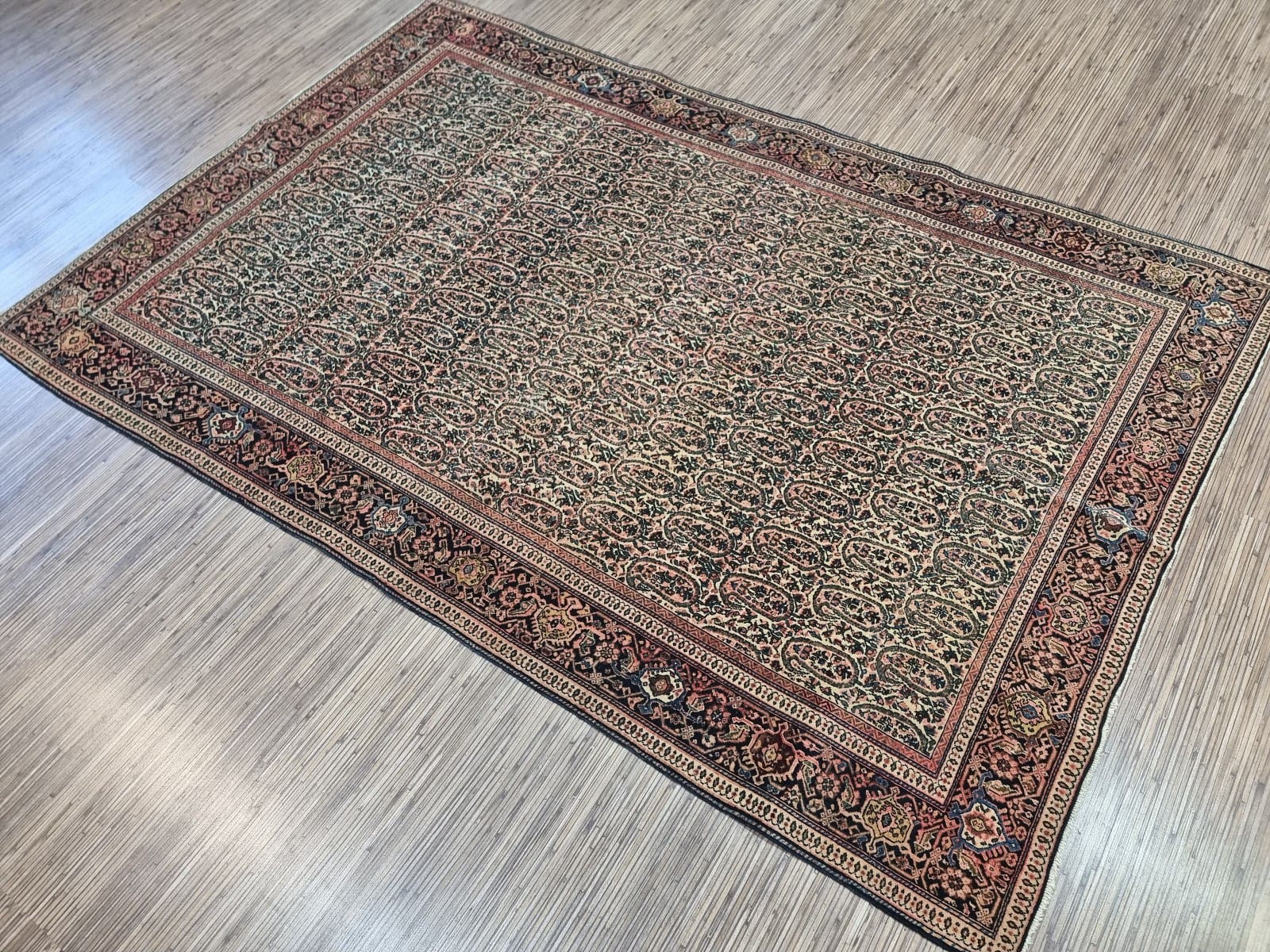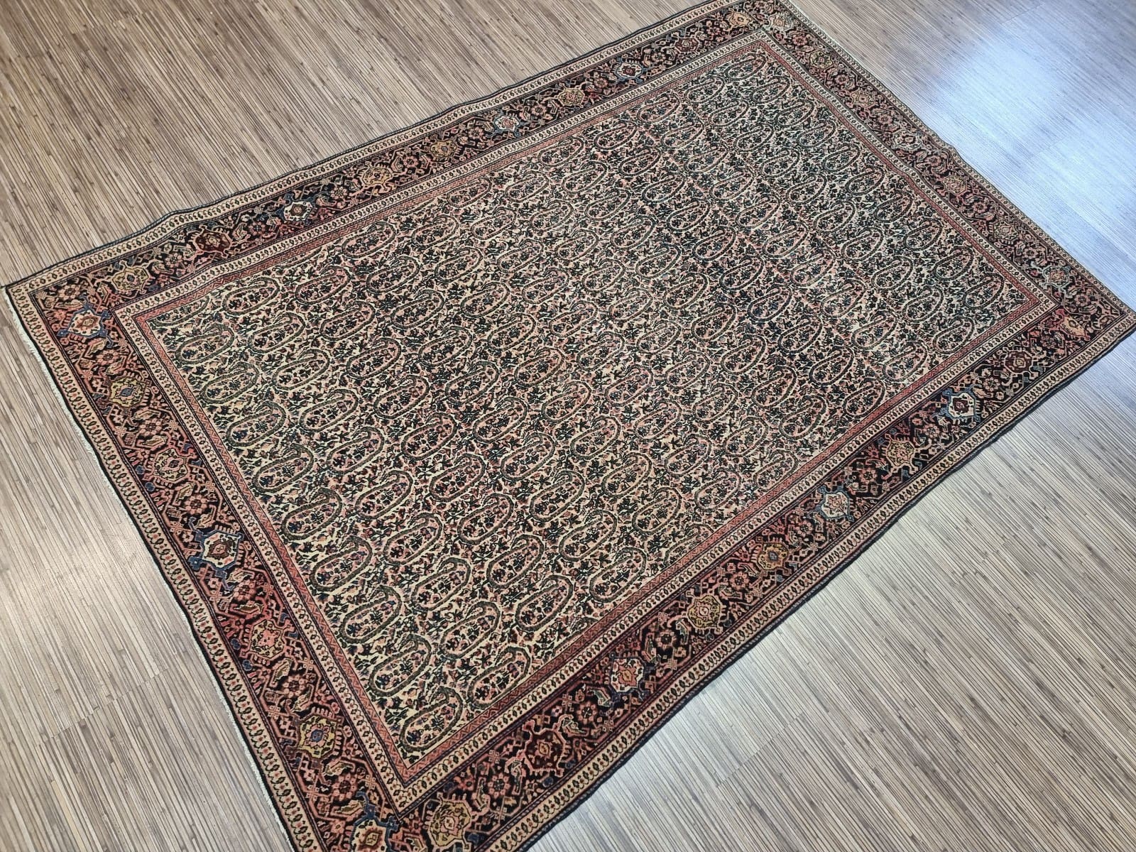 Ein wichtiger Aspekt des Original Antiken Persischen Ferahan ist sein Zustand. Aufgrund seiner sorgfältigen Herstellung und der hochwertigen Materialien ist dieser Teppich in einem bemerkenswert guten Zustand. Dabei zeigt er die typischen Zeichen von Alter und Geschichte, die einen antiken Teppich noch wertvoller machen. Die Wooltextur entwickelt mit der Zeit eine schöne Patina, die ihn besonders attraktiv und charmant macht.