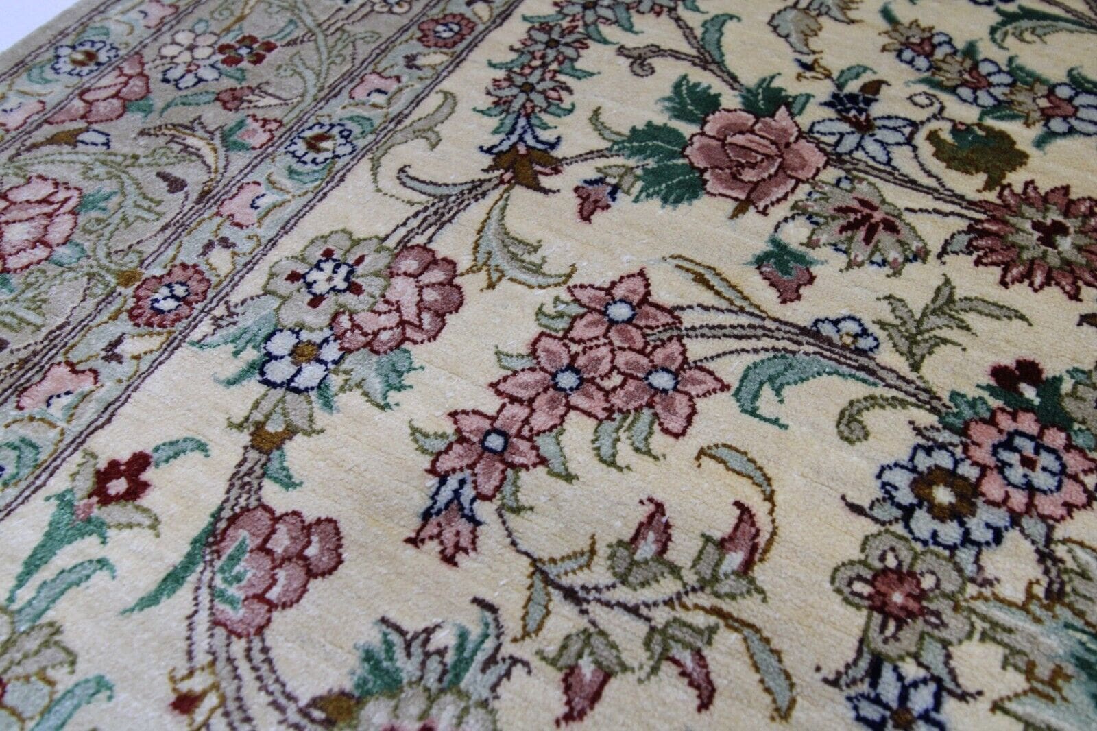 Original Handgeknüpfter Perserteppich Ghom | Größe: 116 x 76 cm | Material: 100% reine Seide | Knotendichte: Hochwertige Verarbeitung | Zustand: Neuwertig, Top Qualität | Muster: Geblümt | Stil: Orientalisch | Herkunft: Iran | Geeignet für: Alle Zimmer | Besonderheiten: Für Fußbodenheizung geeignet, handgeknüpft, umweltfreundlich, waschbar