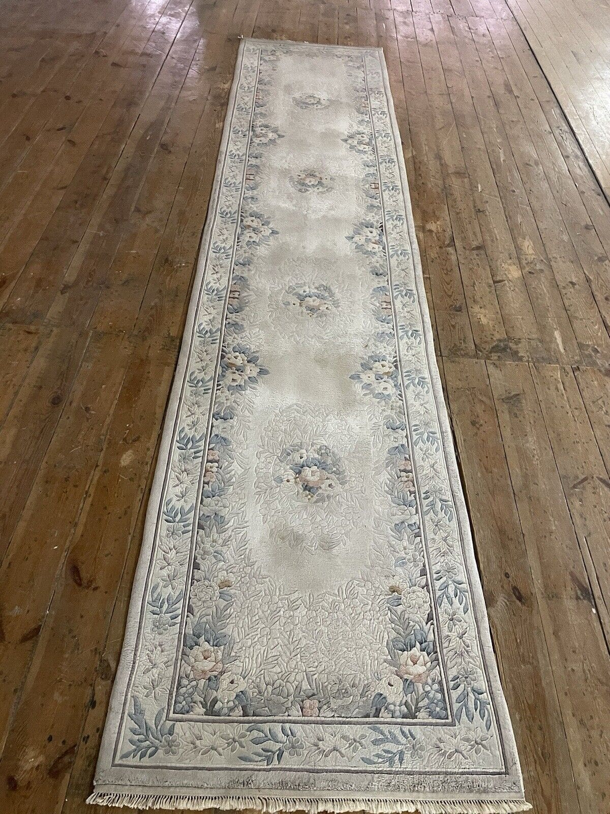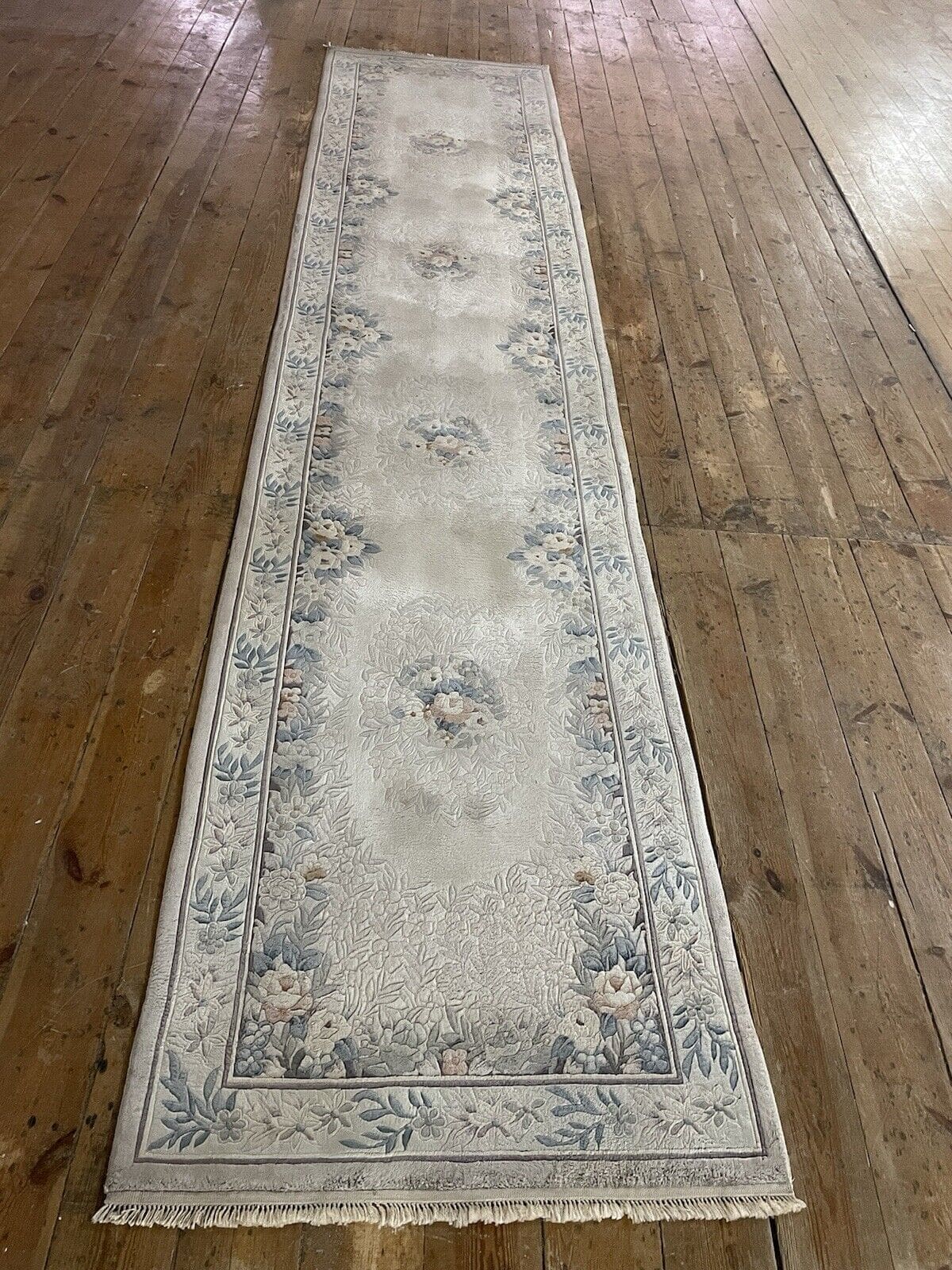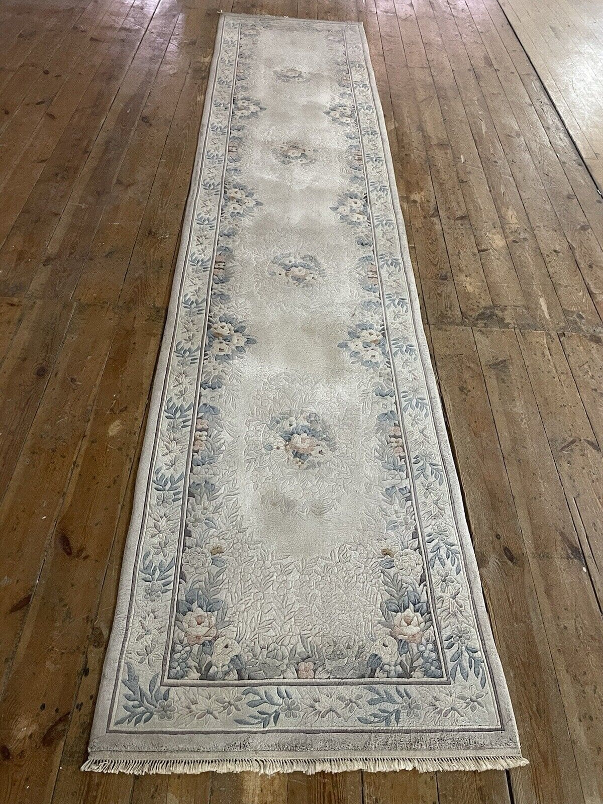 Original Peking Läufer | Material: 100% reine Seide | Knotendichte: Handgeknüpft | Größe: 350×76 cm | Florhöhe: 4 mm | Muster: Traditionell orientalisch | Farbe: Grau Beige | Zustand: Neu ohne Etikett | Herkunft: China | Stil: Luxuriöser Designklassiker