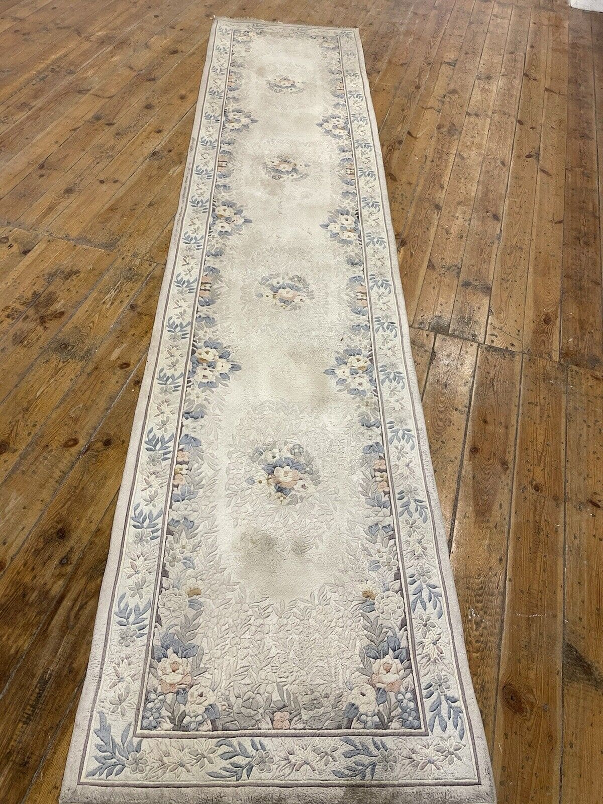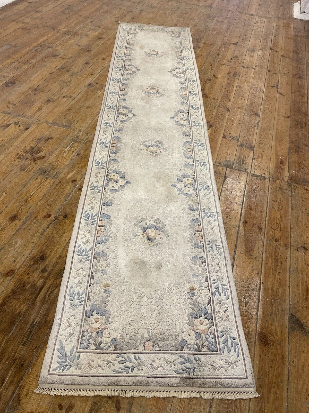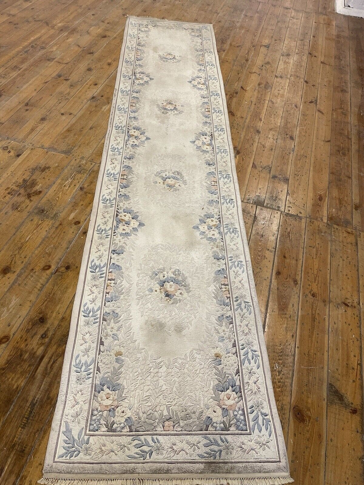Original Peking Läufer | Material: 100% reine Seide | Knotendichte: Handgeknüpft | Größe: 350×76 cm | Florhöhe: 4 mm | Muster: Traditionell orientalisch | Farbe: Grau Beige | Zustand: Neu ohne Etikett | Herkunft: China | Stil: Luxuriöser Designklassiker