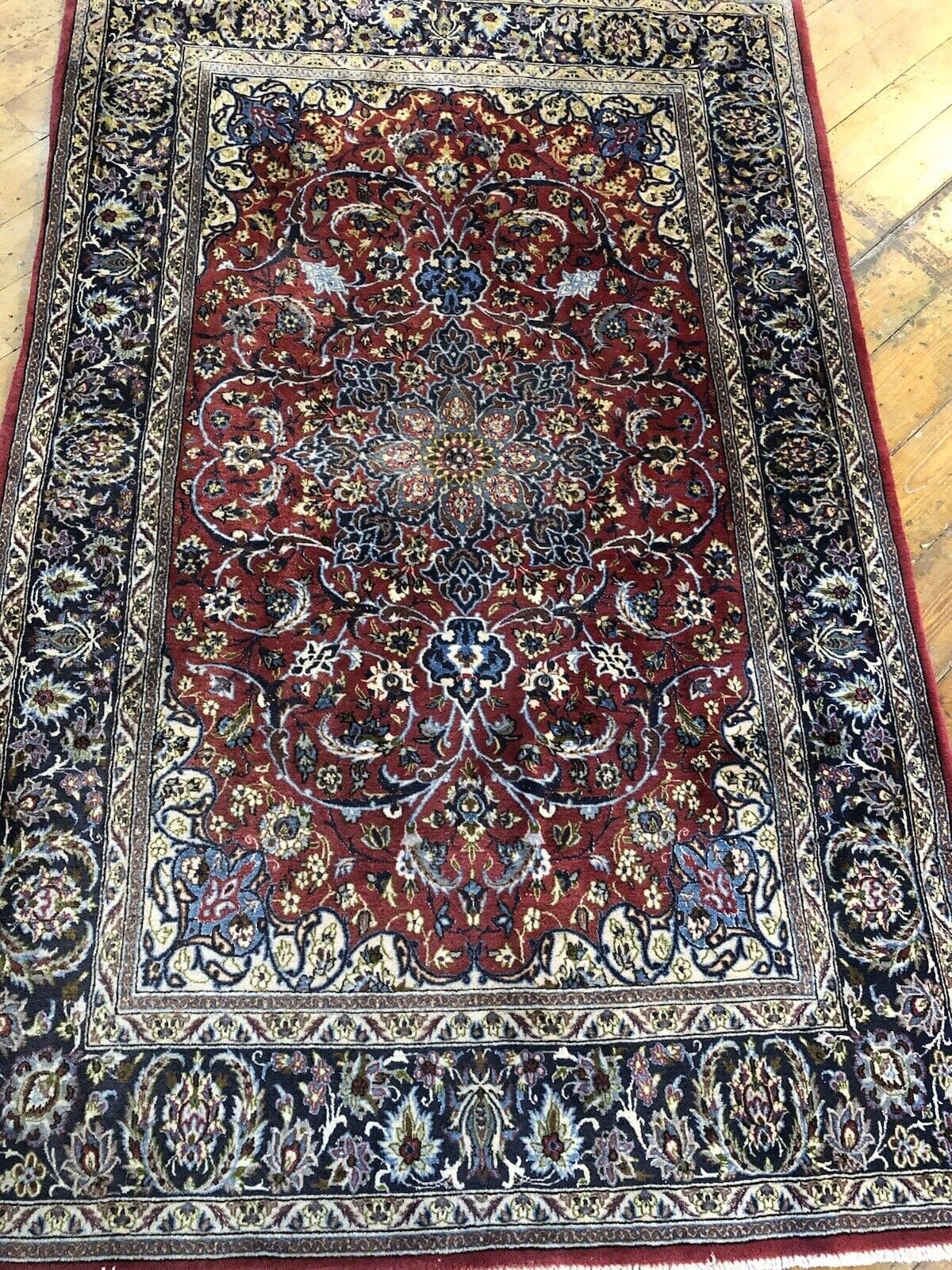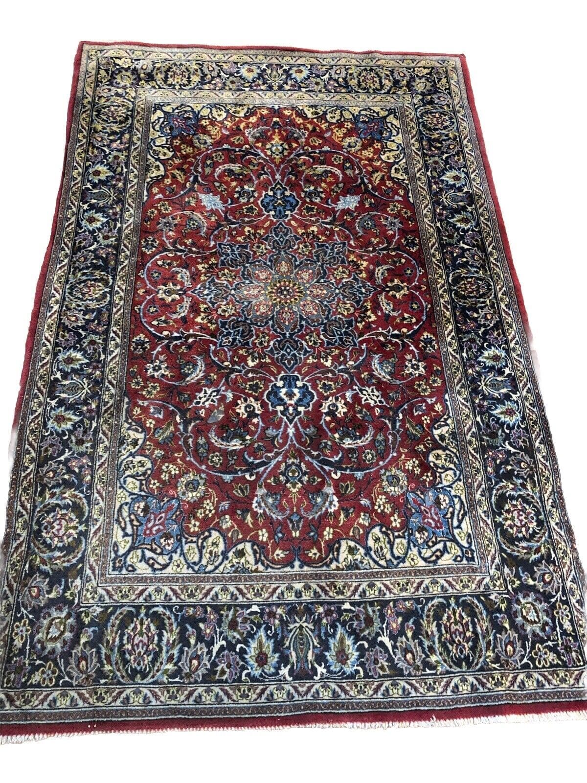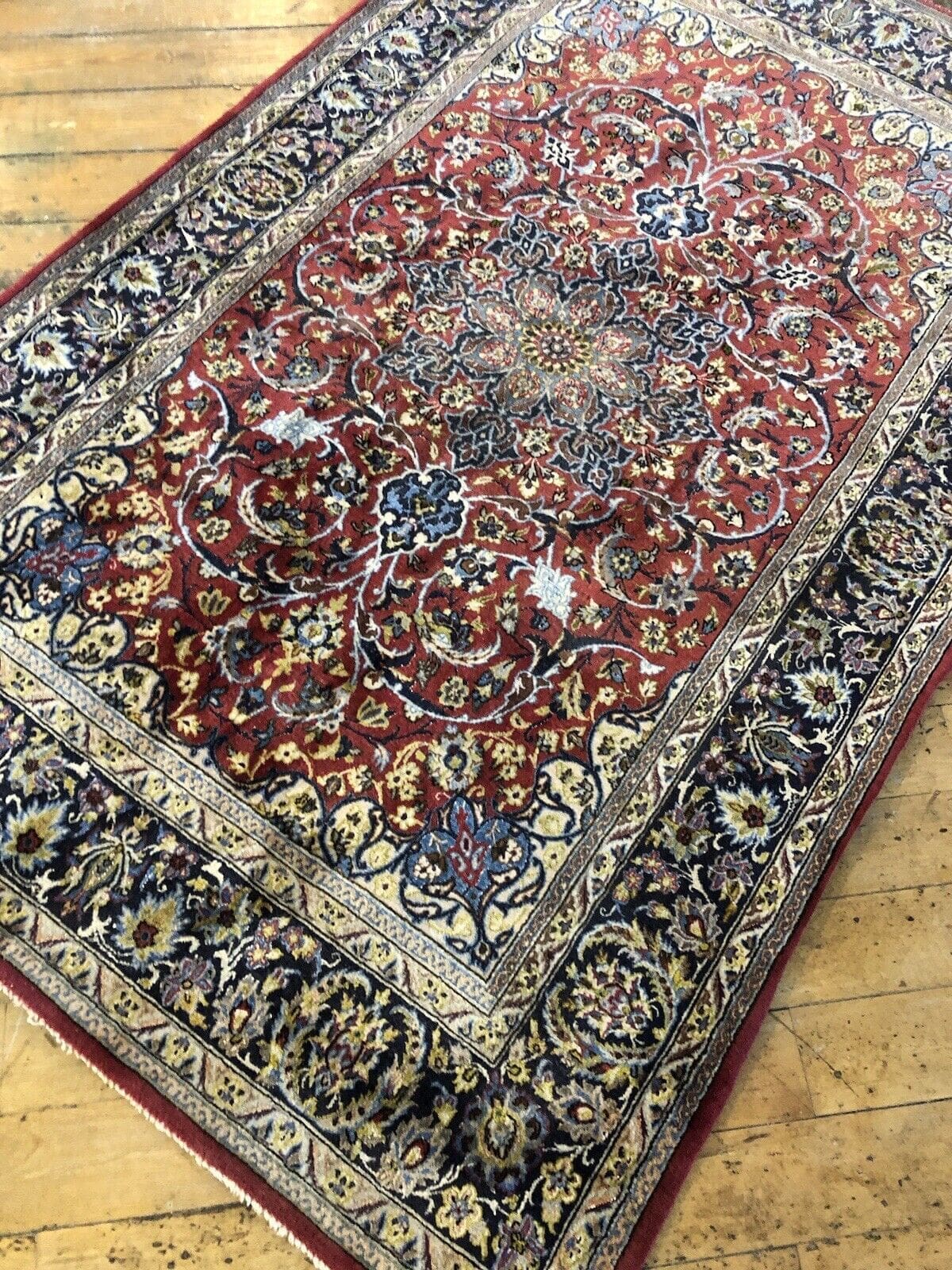 Klassischer Esfahan-Perserteppich | Knotendichte: 700.000 Knoten/m² | Material: Kaschmir, Wolle, Baumwolle | Größe: 150 x 90 cm | Florhöhe: 5 mm | In gebrauchtem Zustand | Für Fußbodenheizungen geeignet | Farbe: Warmes Alt Rot | Spätes 20. Jahrhundert (1970-1999) | Stil: Elegant und traditionell