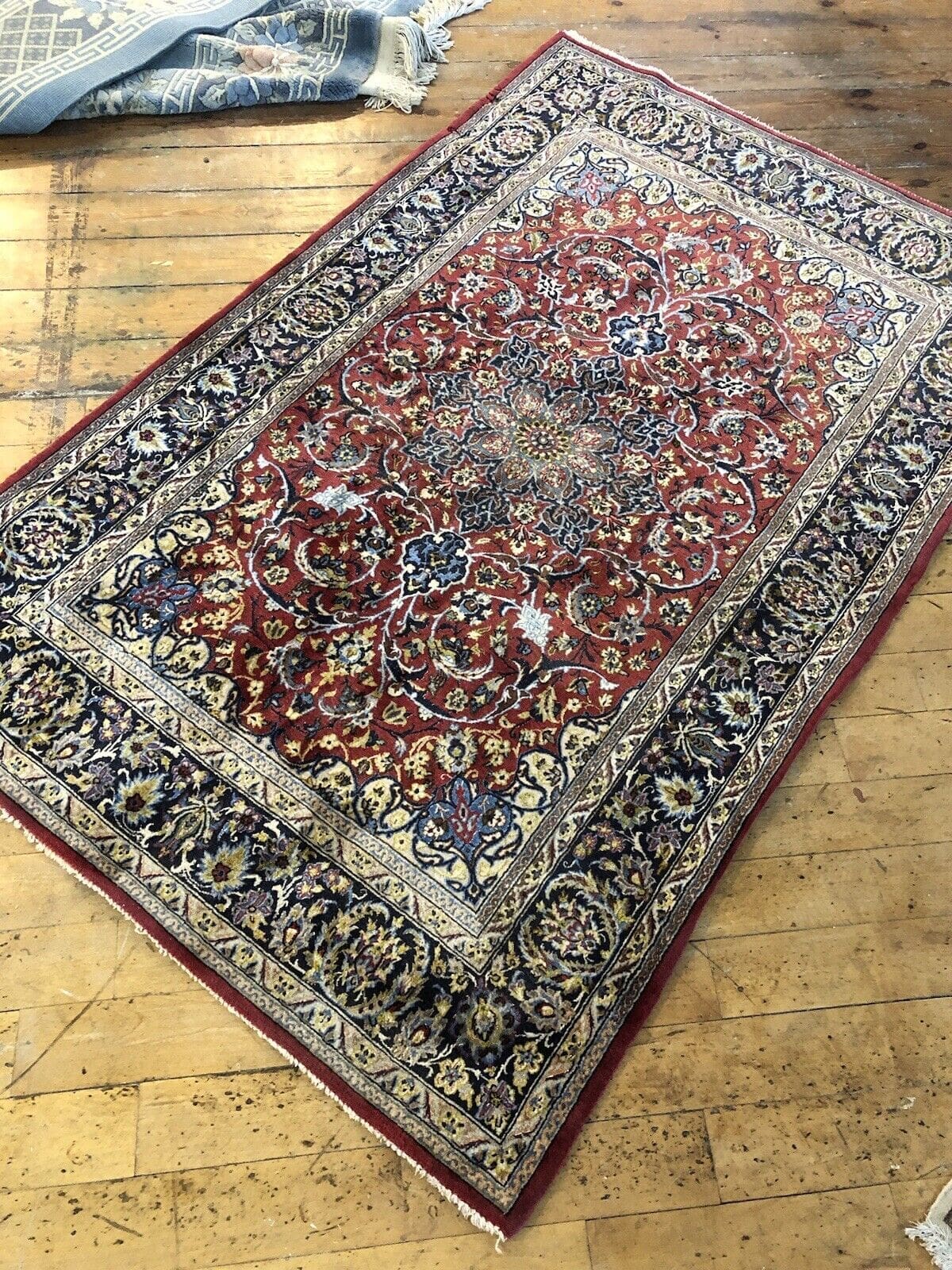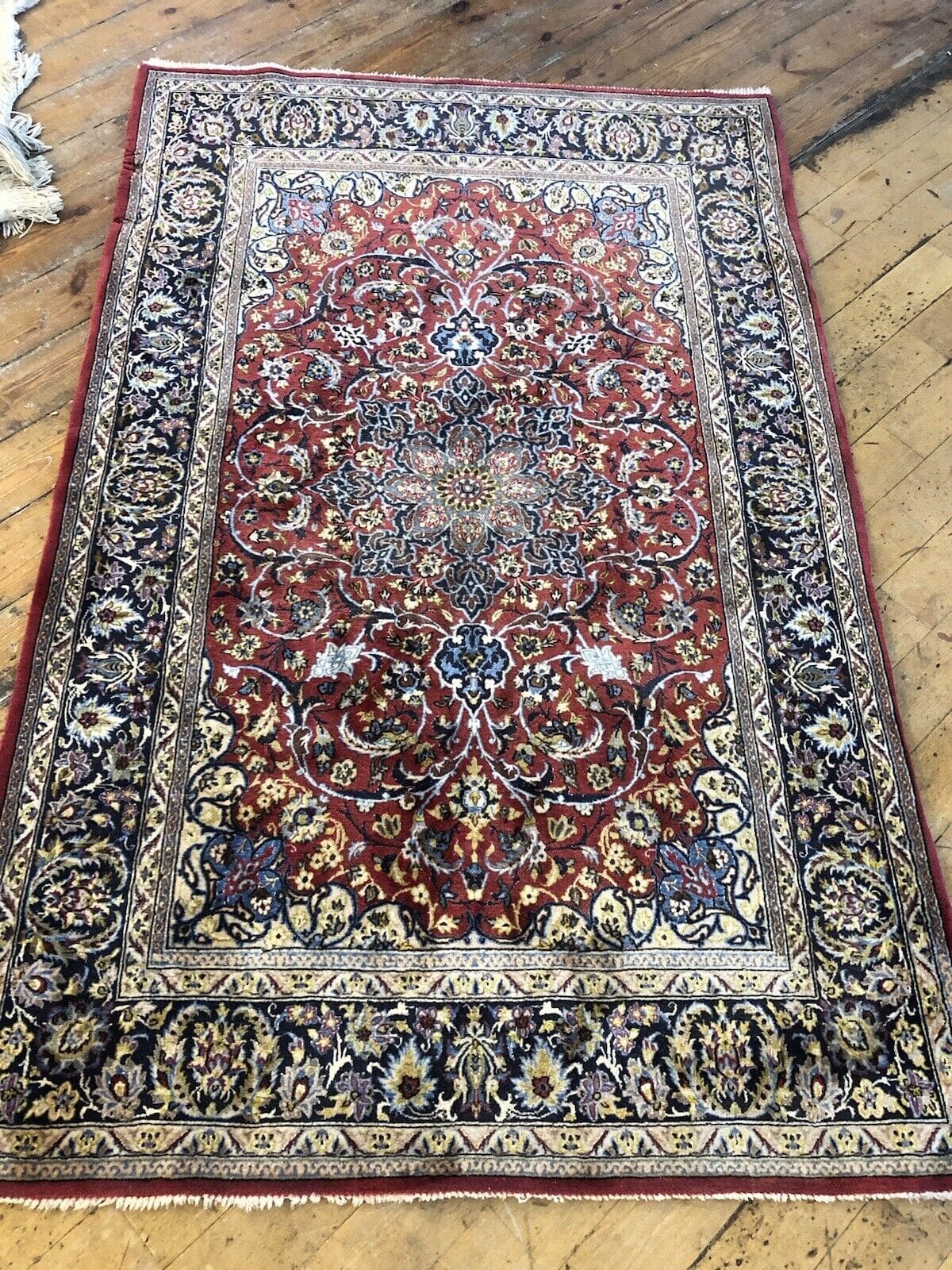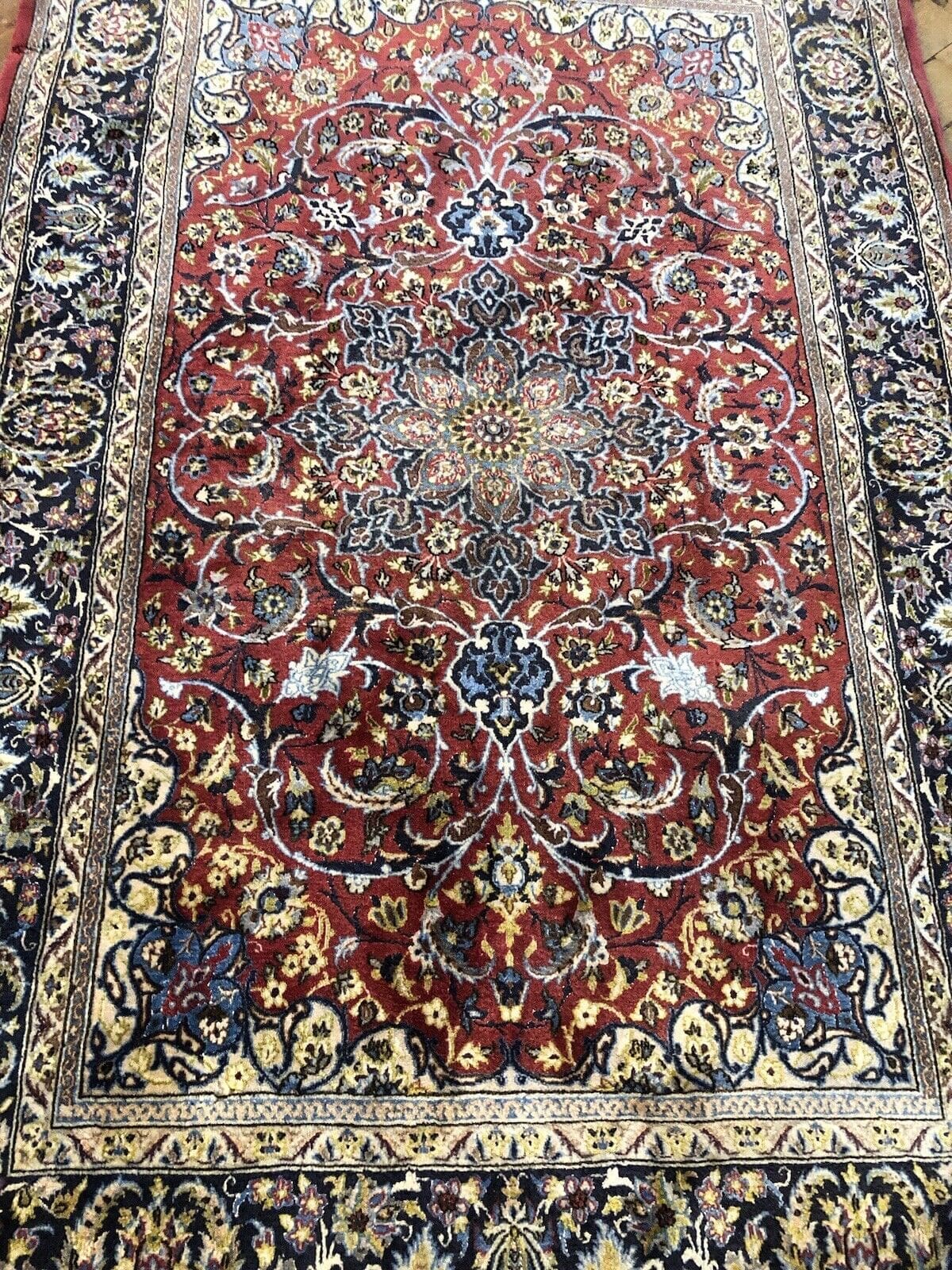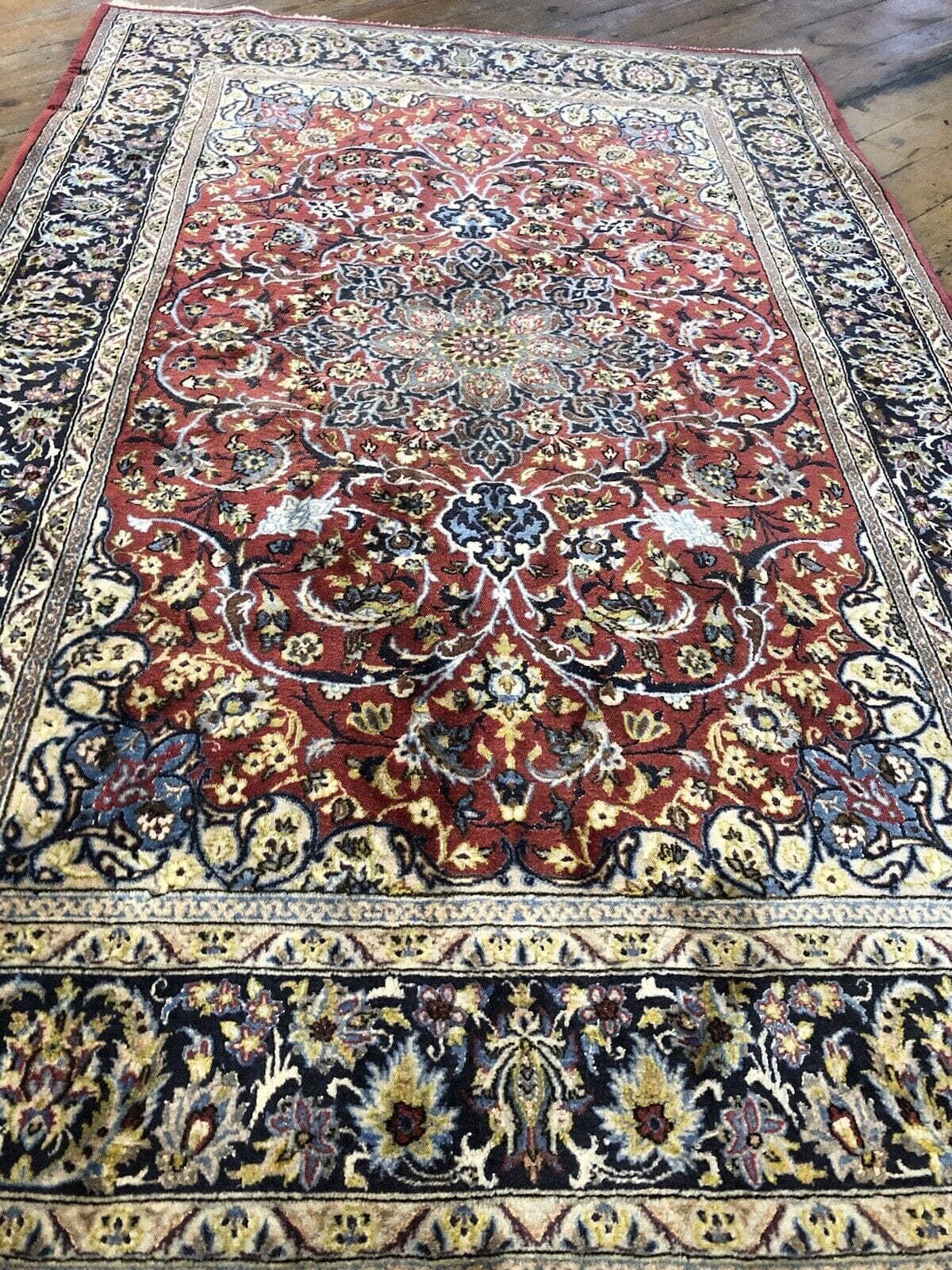 Klassischer Esfahan-Perserteppich | Knotendichte: 700.000 Knoten/m² | Material: Kaschmir, Wolle, Baumwolle | Größe: 150 x 90 cm | Florhöhe: 5 mm | In gebrauchtem Zustand | Für Fußbodenheizungen geeignet | Farbe: Warmes Alt Rot | Spätes 20. Jahrhundert (1970-1999) | Stil: Elegant und traditionell