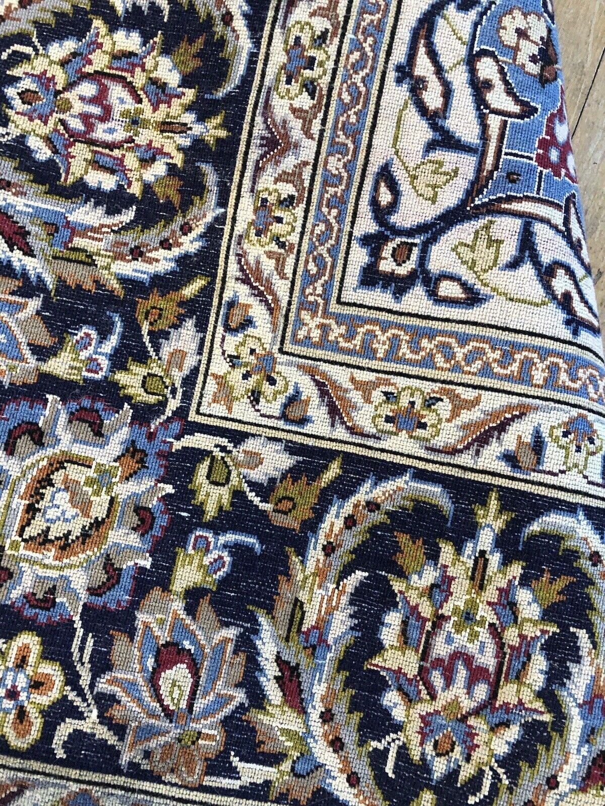In der historischen Provinz Isfahan beispielsweise, aus der viele exquisite Teppiche stammen, ist die Teppichknüpfung seit dem 16. Jahrhundert eine hochgeschätzte Kunstform. Isfahani-Teppiche zeichnen sich durch opulente florale Muster und leuchtende Farben aus, die auch bei diesem Teppich zu finden sind. Das Wissen um die Kunst des Teppichknüpfens wird oft von Generation zu Generation weitergegeben, was diesen Teppich nicht nur zu einem Wohnaccessoire macht, sondern auch zu einem Stück lebendiger Geschichte.