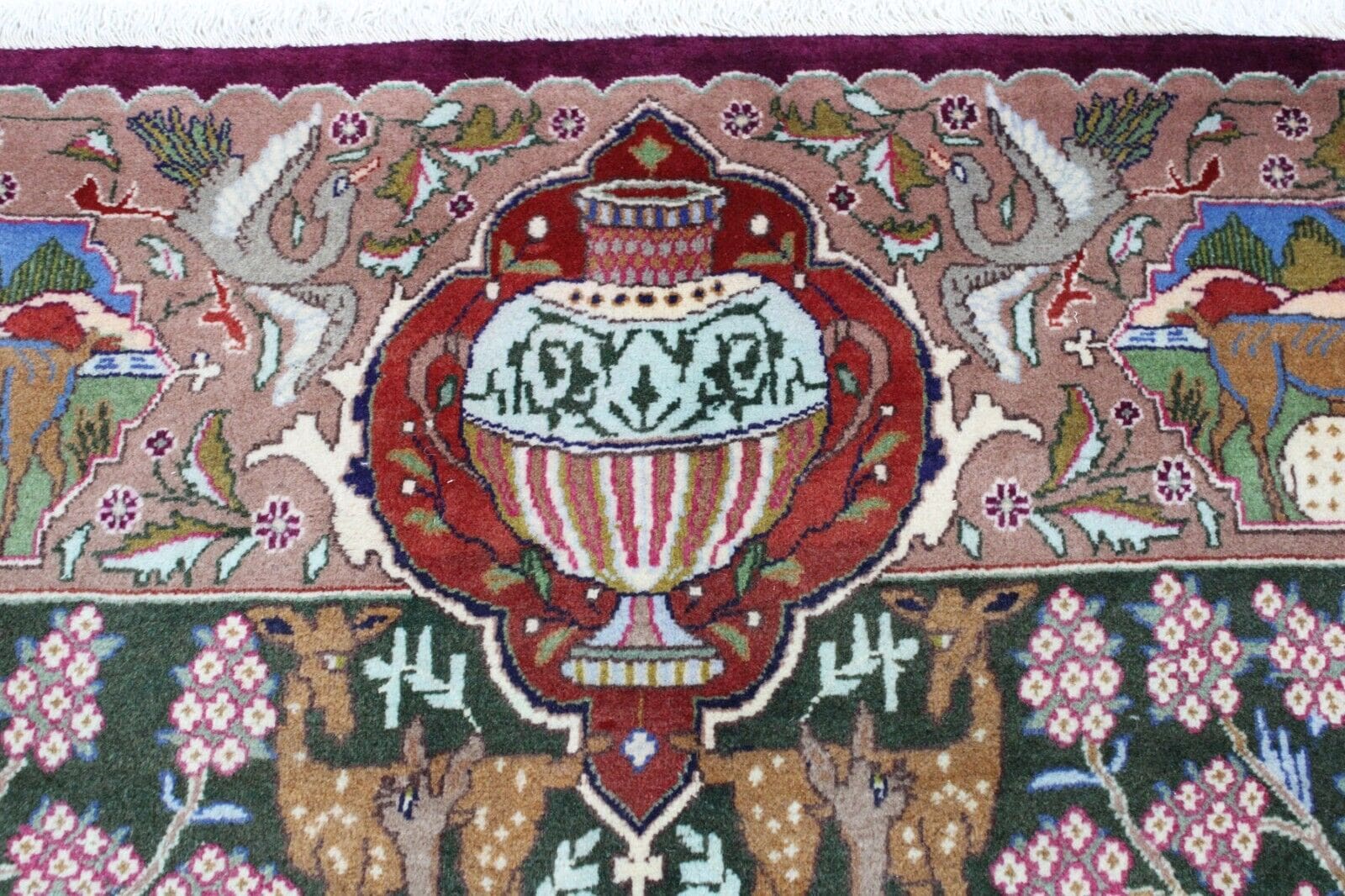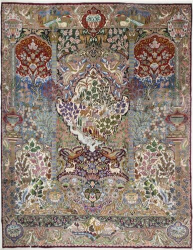 Der Teppich ist aus hochwertigen Materialien gefertigt, die typischerweise für Perserteppiche verwendet werden. Traditionell werden für die Herstellung Wolle und Seide genutzt, wobei Wolle für die Verbindung von Strapazierfähigkeit und Komfort sorgt. Die Knotendichte dieses Teppichs ist besonders hoch, was ihm eine außergewöhnliche Langlebigkeit verleiht. Die weichen Fasern und die akribische Knotentechnik sorgen dafür, dass jeder Teppich nicht nur schön anzusehen, sondern auch angenehm anzufassen ist.