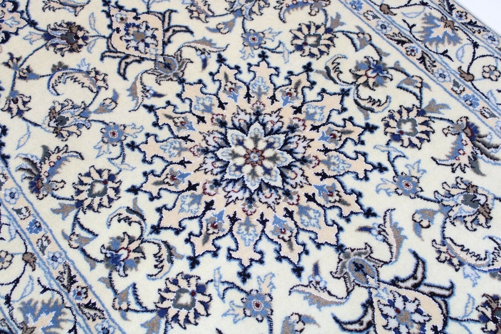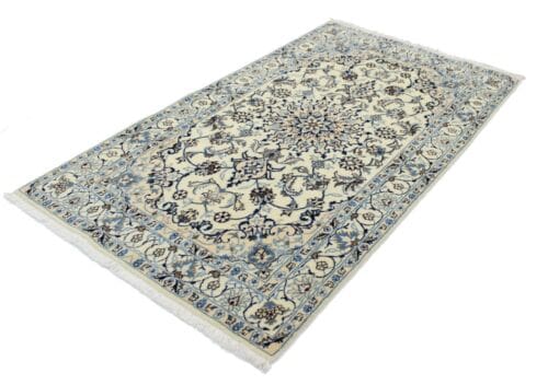 Das Design des Original Perserteppichs Nain ist klassisch und elegant. Typisch sind die harmonischen Farbgebungen in sanften Blau-, Creme- und Erdtönen, die den Teppich zu einer wahren Augenweide machen. Die floralen Motive sind präzise und detailreich eingearbeitet, was das Kunstwerk zusätzlich aufwertet. In der Regel stellen die Muster sowohl traditionelle als auch zeitgenössische Designs dar und sind somit vielseitig einsetzbar. Egal, ob im modernen oder klassischen Einrichtungsstil – dieser Teppich wird zum Blickfang in jedem Raum.