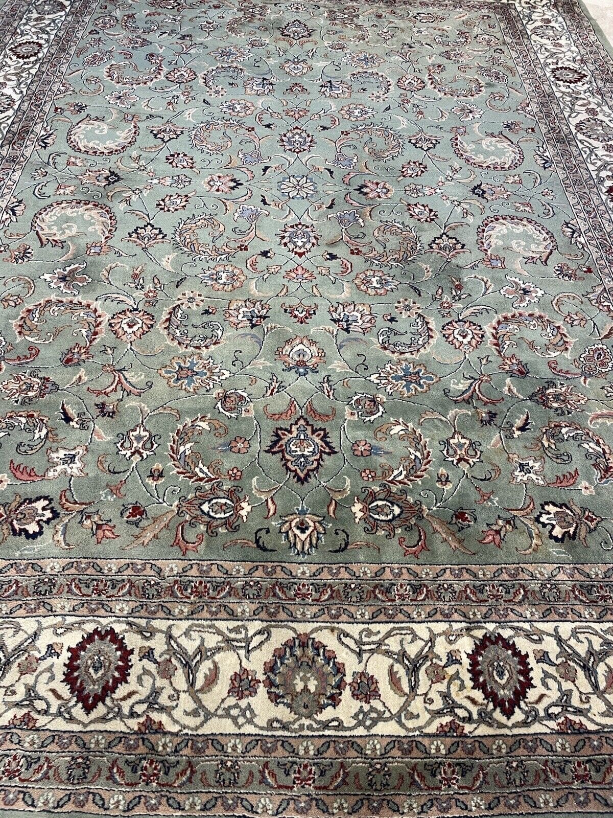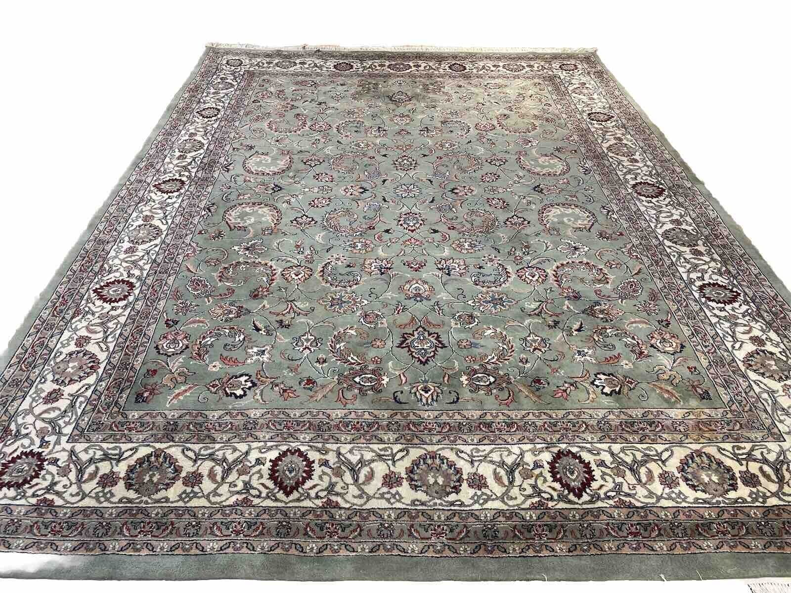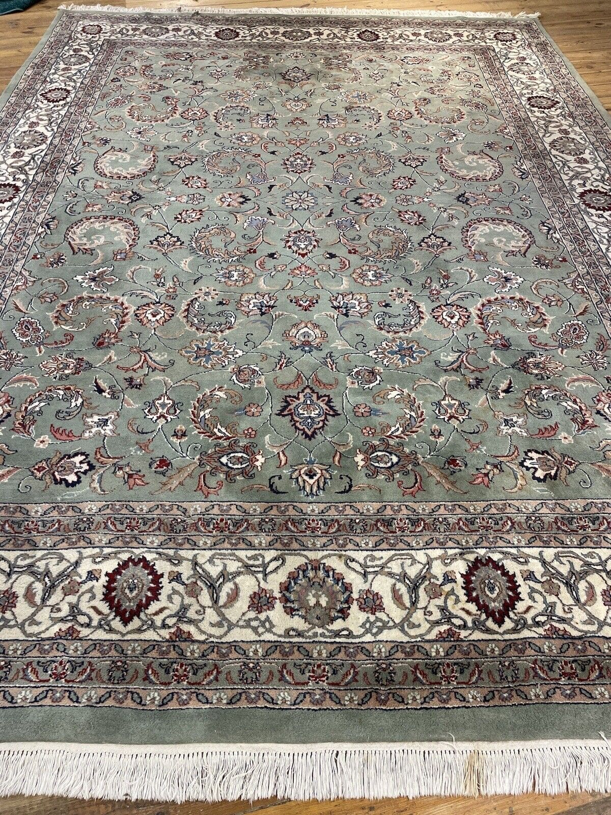 Original Kaschmir Teppich | Handgeknüpft mit reiner Schurwolle | Knotendichte: 350.000 Knoten/m² | Größe: 365 x 275 cm | Farbe: Pastell Grün | Zustand: Neu mit Etikett | Stil: Traditionell persisch | Florhöhe: 14 mm | Geeignet für Fußbodenheizung | Regionales Design: Täbriz | Kettfaden: Baumwolle | Muster: Durchgemustert | Form: Rechteckig