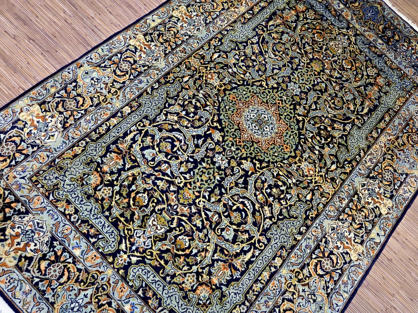 Der Zustand des Teppichs ist sehr gut. Er wurde frisch professionell gewaschen, was nicht nur seine Schönheit hervorhebt, sondern auch seine Langlebigkeit sichert. Die Knotendichte ist ein wichtiger Faktor bei der Bewertung von Orientteppichen. In diesem Fall beträgt die Knotendichte 150 Raj, was einer ungefähren Dichte von 30.000 Knoten pro Quadratmeter entspricht. Dies ist ein hervorragender Wert, der die Detailgenauigkeit und die Komplexität des Designs widerspiegelt. Der Teppich ist zudem für alle Zimmer geeignet und bringt eine warme, einladende Atmosphäre in jeden Raum.