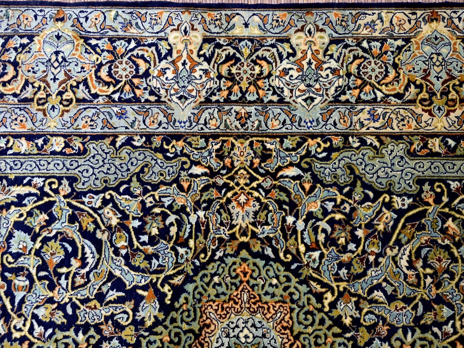 Der Teppich stammt aus der Region Keschan, einer bekannten Provinz im Iran, die für ihre exquisite Teppichproduktion berühmt ist. Keschan Teppiche zeichnen sich durch ihre feinen Muster und die Verwendung lebendiger Farben aus. Diese Region hat eine lange Tradition in der Teppichknüpfkunst, die bis ins 15. Jahrhundert zurückreicht. Die Teppiche aus Keschan sind oft mit floralen und geometrischen Mustern verziert, die kulturelle und historische Einflüsse widerspiegeln. Die Qualität und die technischen Fähigkeiten der Handwerker in dieser Region tragen dazu bei, dass Keschan Teppiche international geschätzt werden.