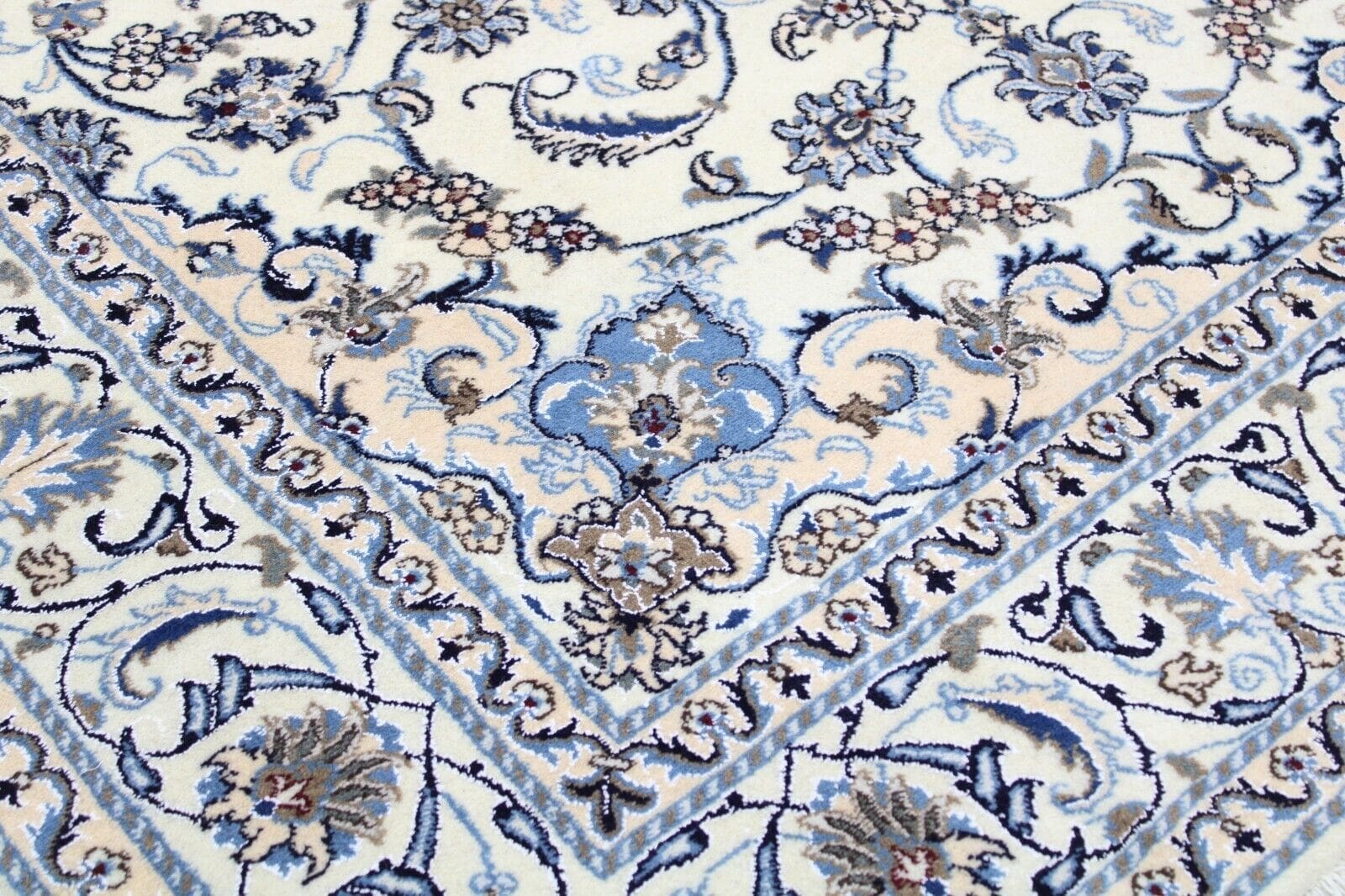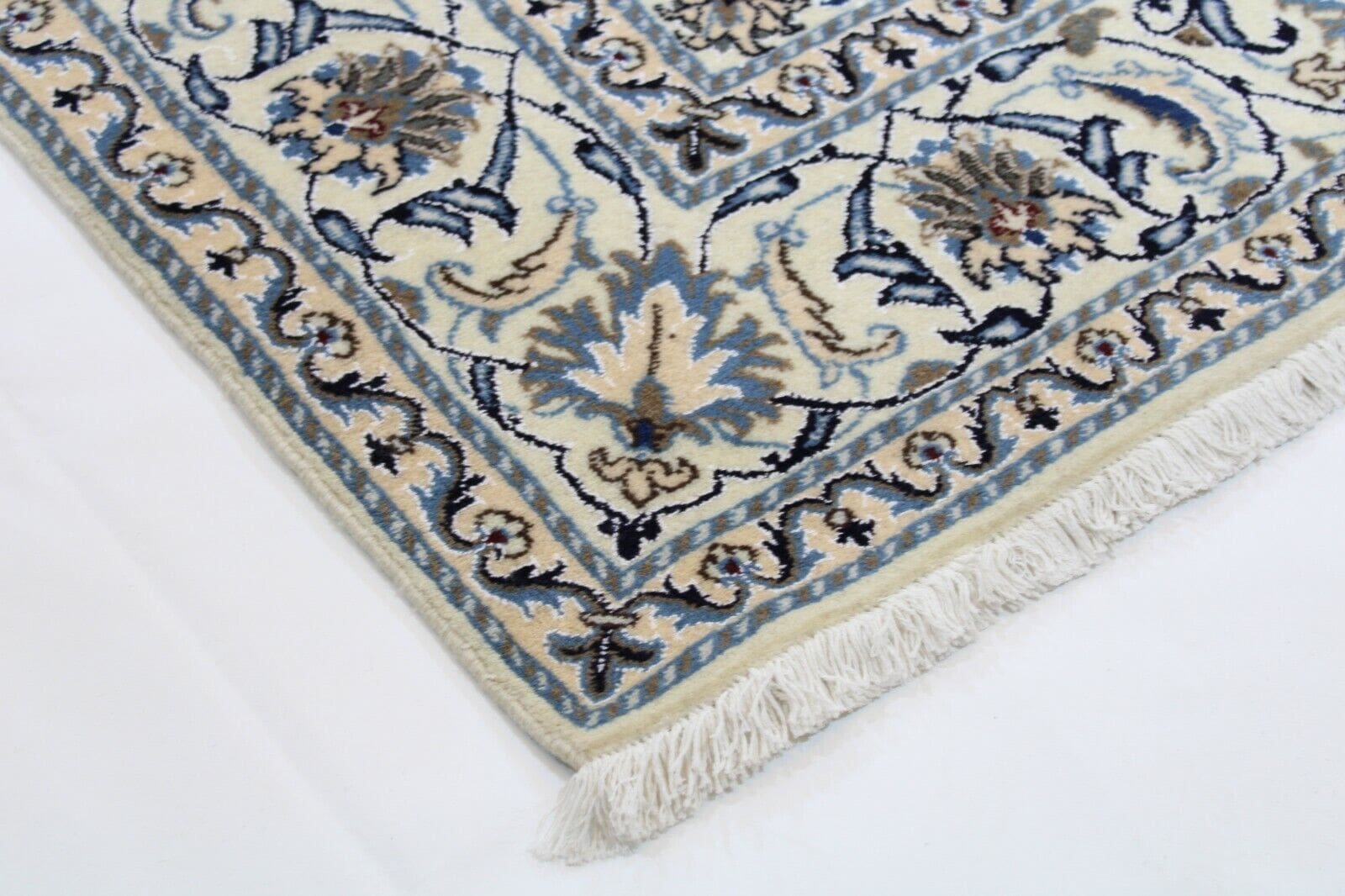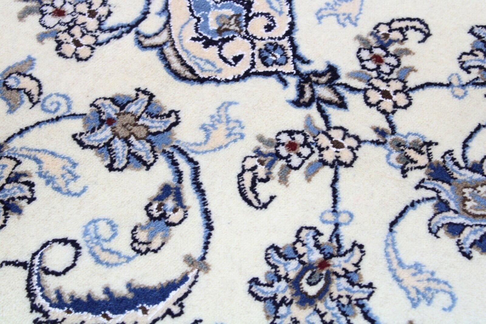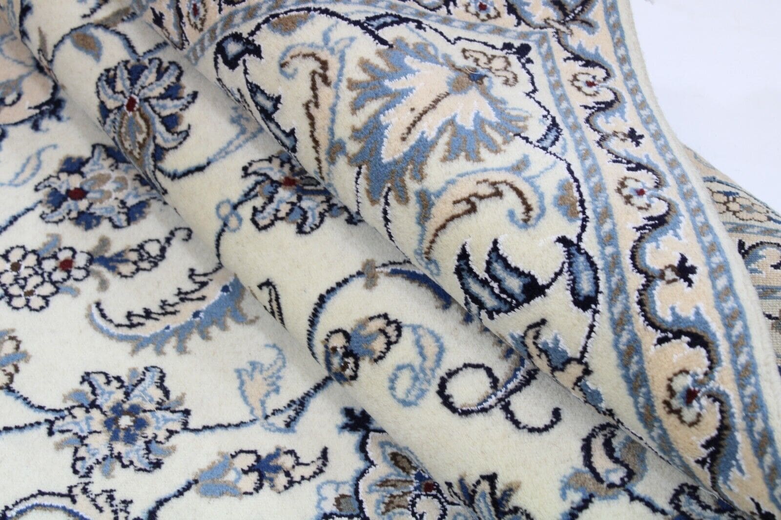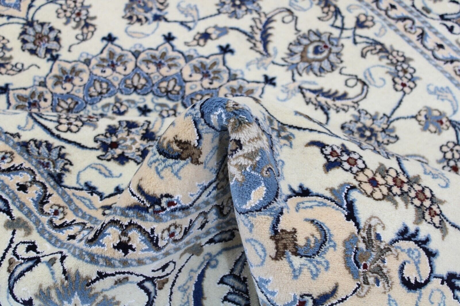 Die Muster auf einem Nain Perserteppich sind das Ergebnis jahrhundertealter Tradition und künstlerischer Ausdrucksform. Sie umfassen häufig florale Motive und geometrische Designs, die sowohl klassisch als auch modern interpretiert werden können. Die harmonischen Farbkombinationen – häufig in sanften Blau- und Beigetönen – schaffen einen beruhigenden und eleganten Look, der sich mühelos in verschiedene Einrichtungsstile integrieren lässt.