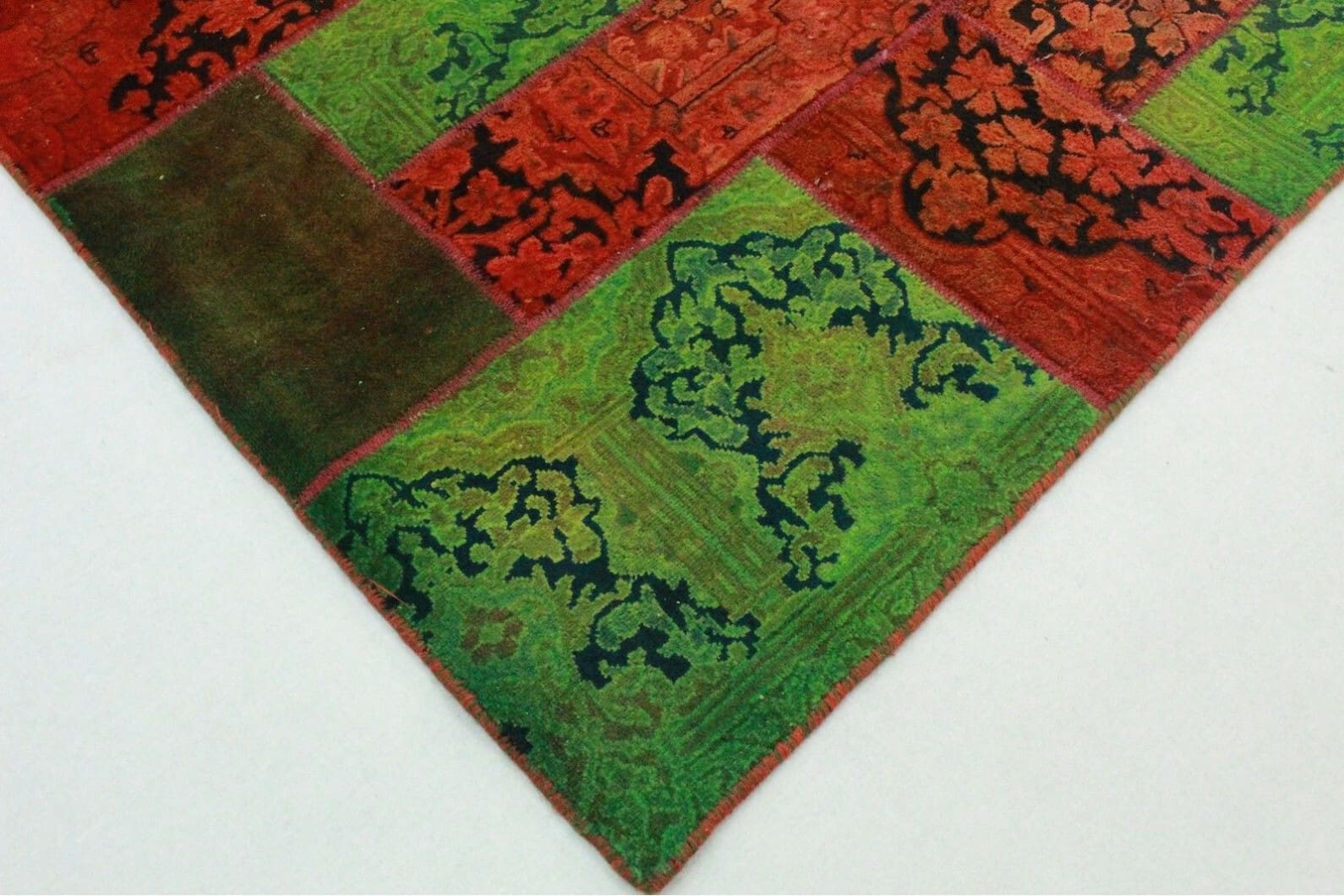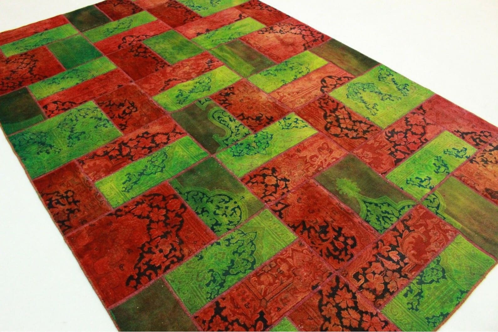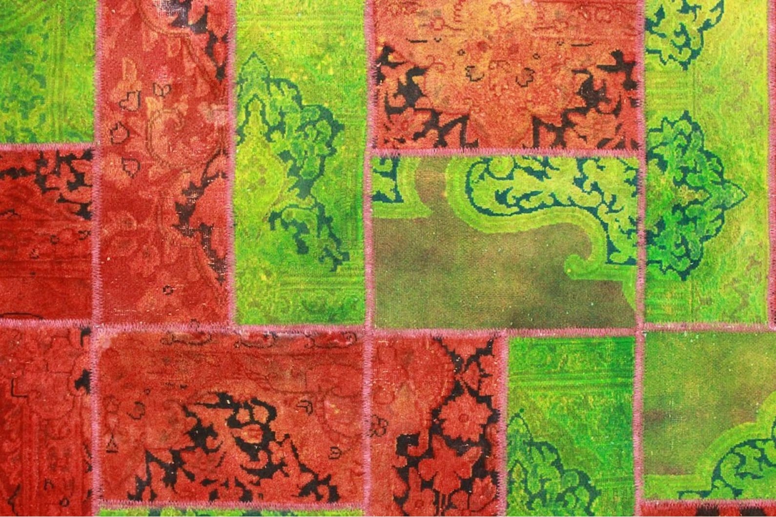 Handgeknüpfter Patchwork Teppich | Größe: 310×221 cm | Material: Handgesponnene Wolle und Baumwolle | Muster: Auffällige, mehrfarbige Designs in Grün und Rot | Zustand: Neu mit Etikett | Herkunft: Orient | Geeignet für Fußbodenheizung | Stil: Modern und Vintage | Alter: 20 – 50 Jahre