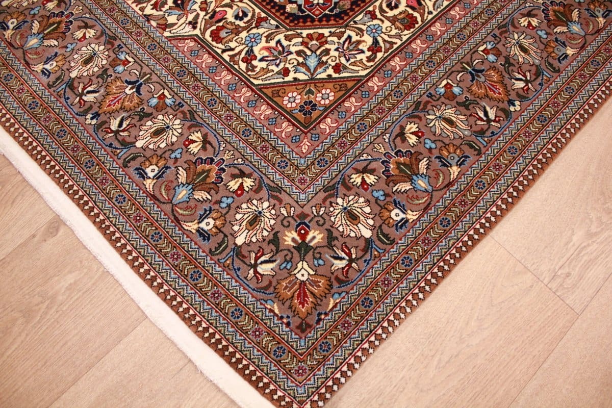 Dieser Teppich stammt aus der Stadt Ghom, einer der bekanntesten Teppichzentren im Iran. Ghom ist für seine reiche Teppichtradition berühmt, die sich über Jahrhunderte entwickelt hat. Die Stadt hat eine besondere Bedeutung in der schiitischen Islamkultur und ist oft ein Zentrum für künstlerische und religiöse Ausdrücke. Die Teppiche aus Ghom zeichnen sich durch ihre komplexen Designs und die Verwendung seltener Farbtöne aus, die durch natürliche Farbstoffe gewonnen werden. Dies macht jeden Teppich zu einem einzigartigen Kunstwerk, das die Kultur und die Geschichte des Irans widerspiegelt.