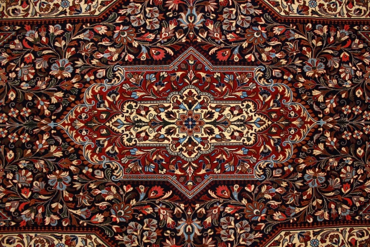 Hochwertiger Perser Teppich Ghom | Knotendichte: 300.000 Knoten/m² | Material: 100% Wolle mit Naturfarben | Größe: 226×145 cm | Zustand: Ausgezeichnet, kaum Gebrauchsspuren | Ursprung: Iran | Design: Vielfältige Motive mit harmonischer Farbpalette in Dunkelblau, Elfenbein und Rot