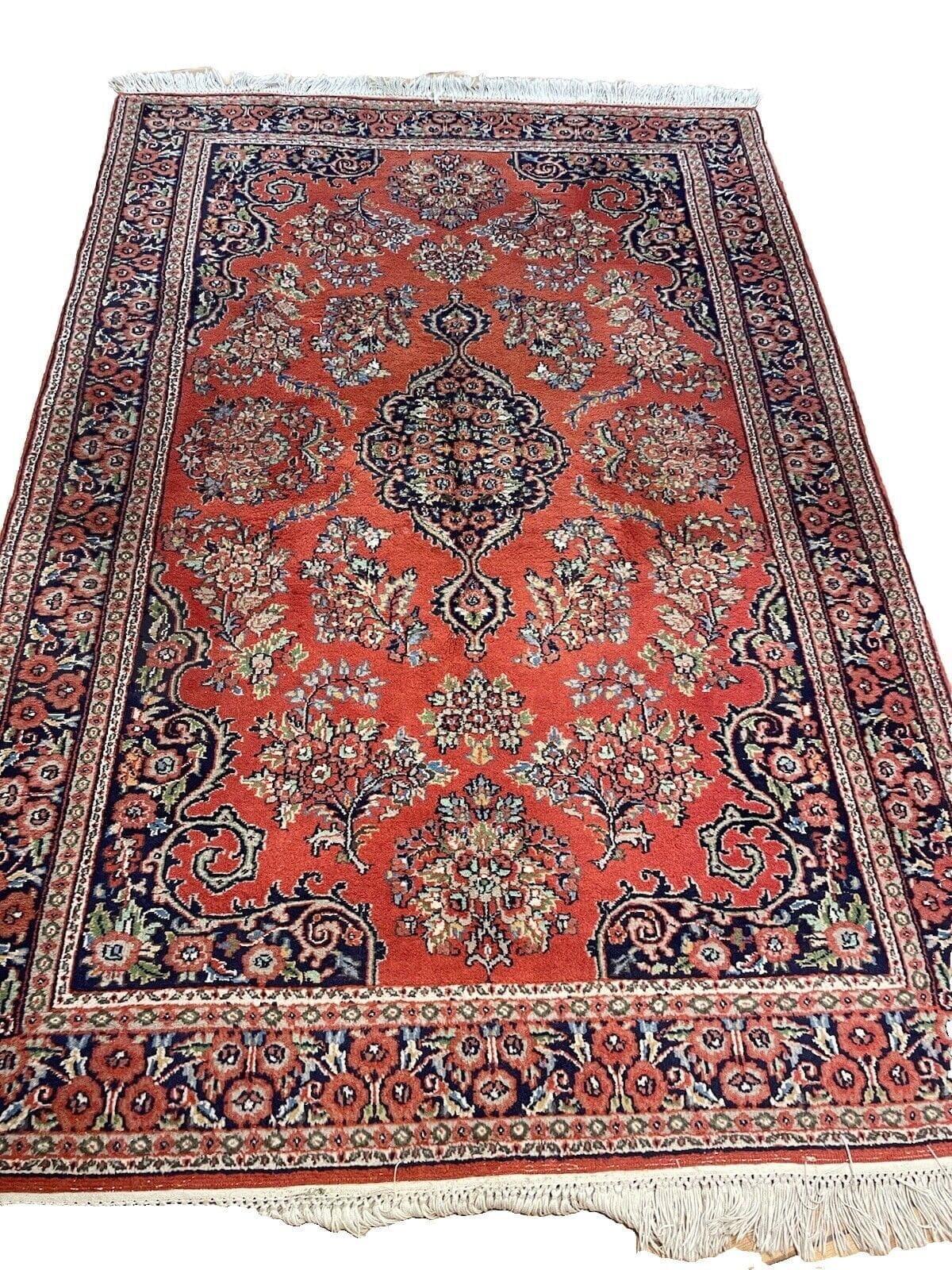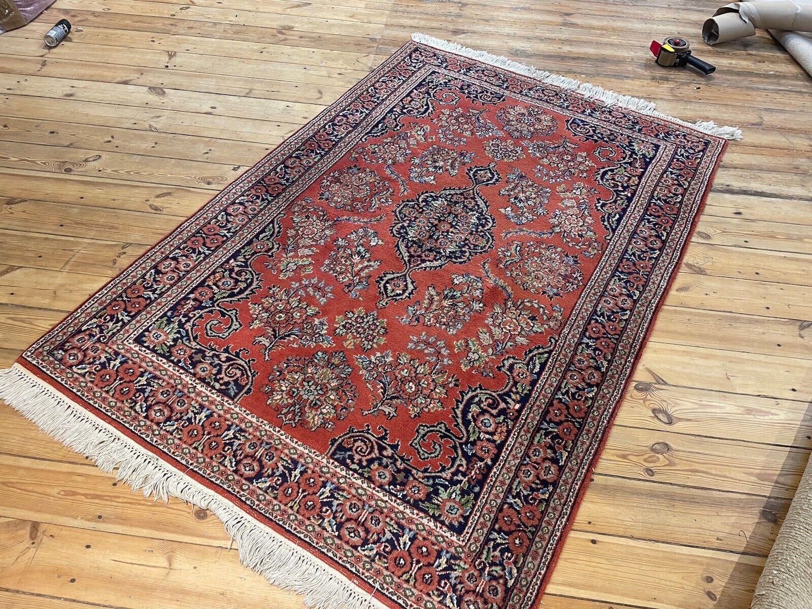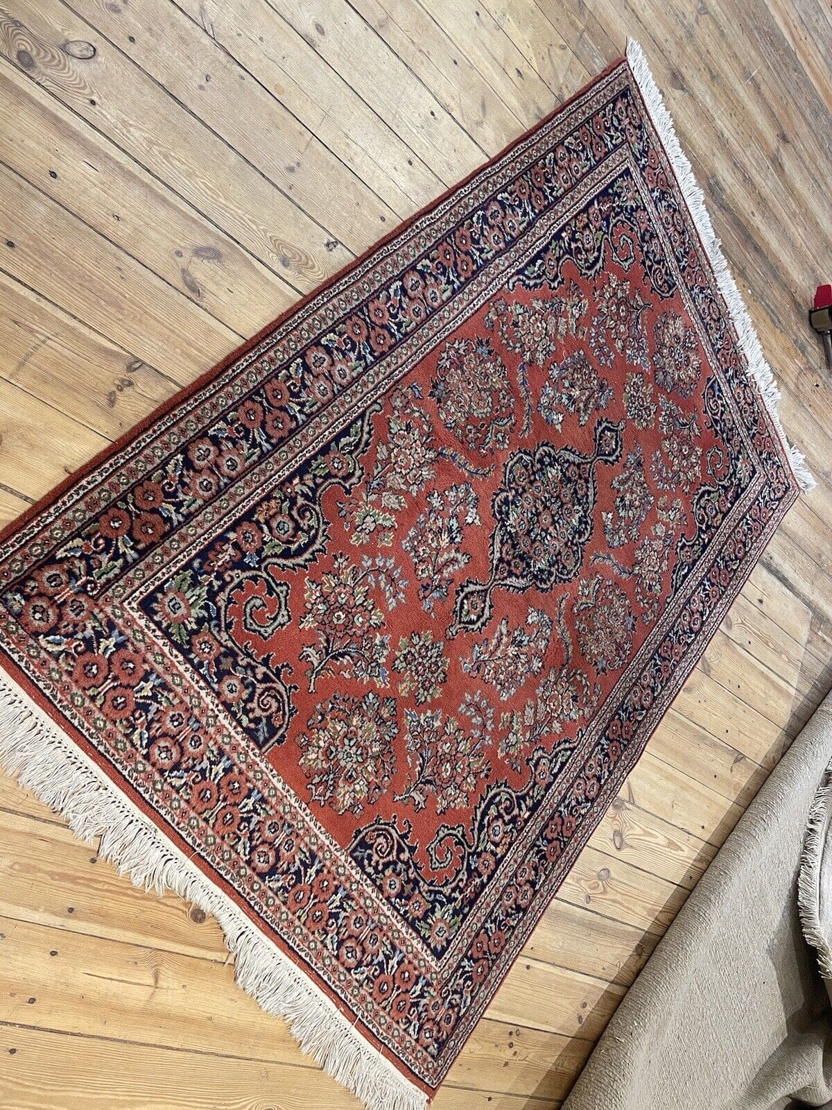 Handgeknüpfter Teppich aus Kaschmir | Größe: 190×130 cm | Florhöhe: 8 mm | Material: Reine Schurwolle mit Baumwollkettfäden | Muster: Traditionell geblümt in Rosa | Zustand: Generalüberholt | Für Fußbodenheizung geeignet | Regionales Design: Kaschmir | Stil: Traditionell Persisch/Orientalisch | Form: Rechteckig