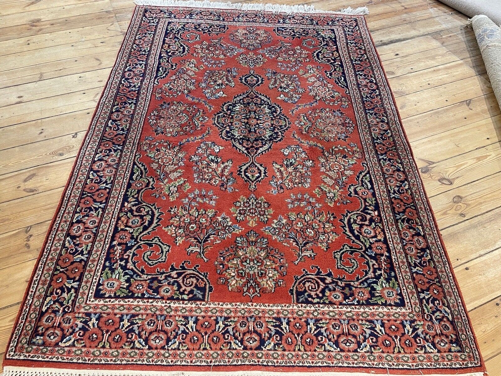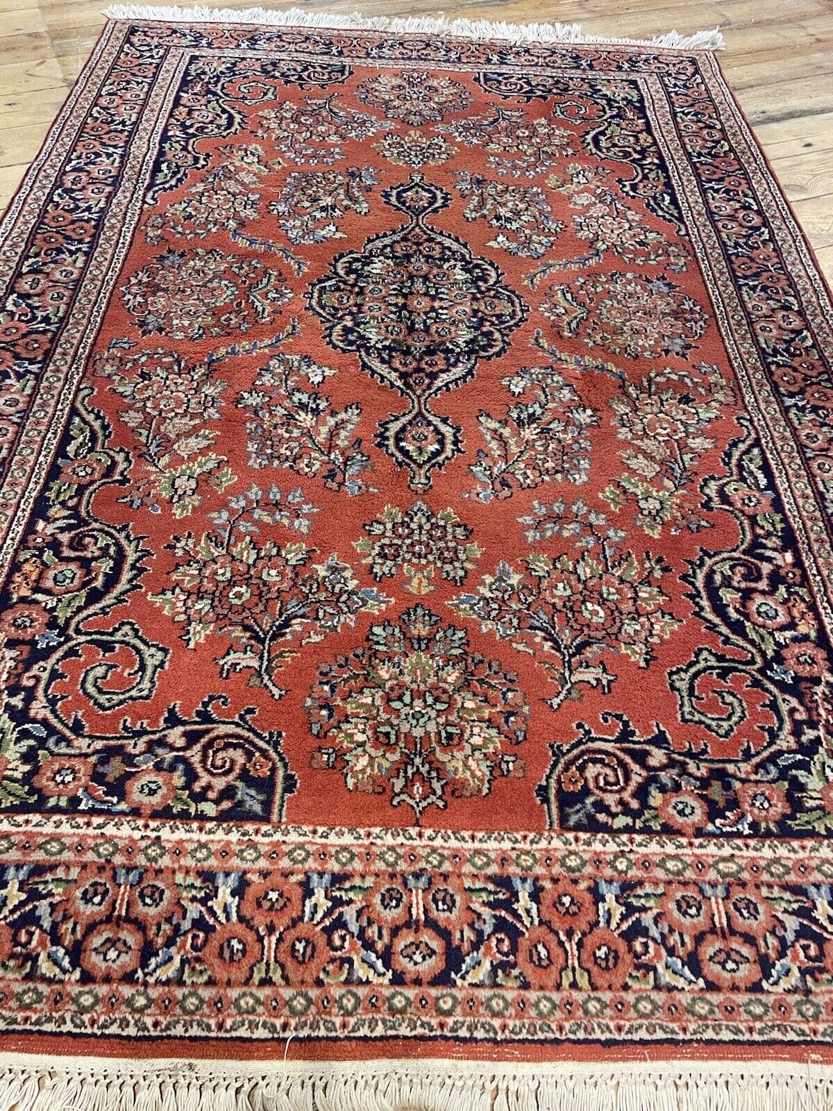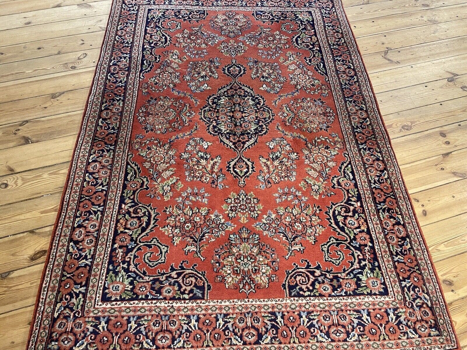Handgeknüpfter Teppich aus Kaschmir | Größe: 190×130 cm | Florhöhe: 8 mm | Material: Reine Schurwolle mit Baumwollkettfäden | Muster: Traditionell geblümt in Rosa | Zustand: Generalüberholt | Für Fußbodenheizung geeignet | Regionales Design: Kaschmir | Stil: Traditionell Persisch/Orientalisch | Form: Rechteckig
