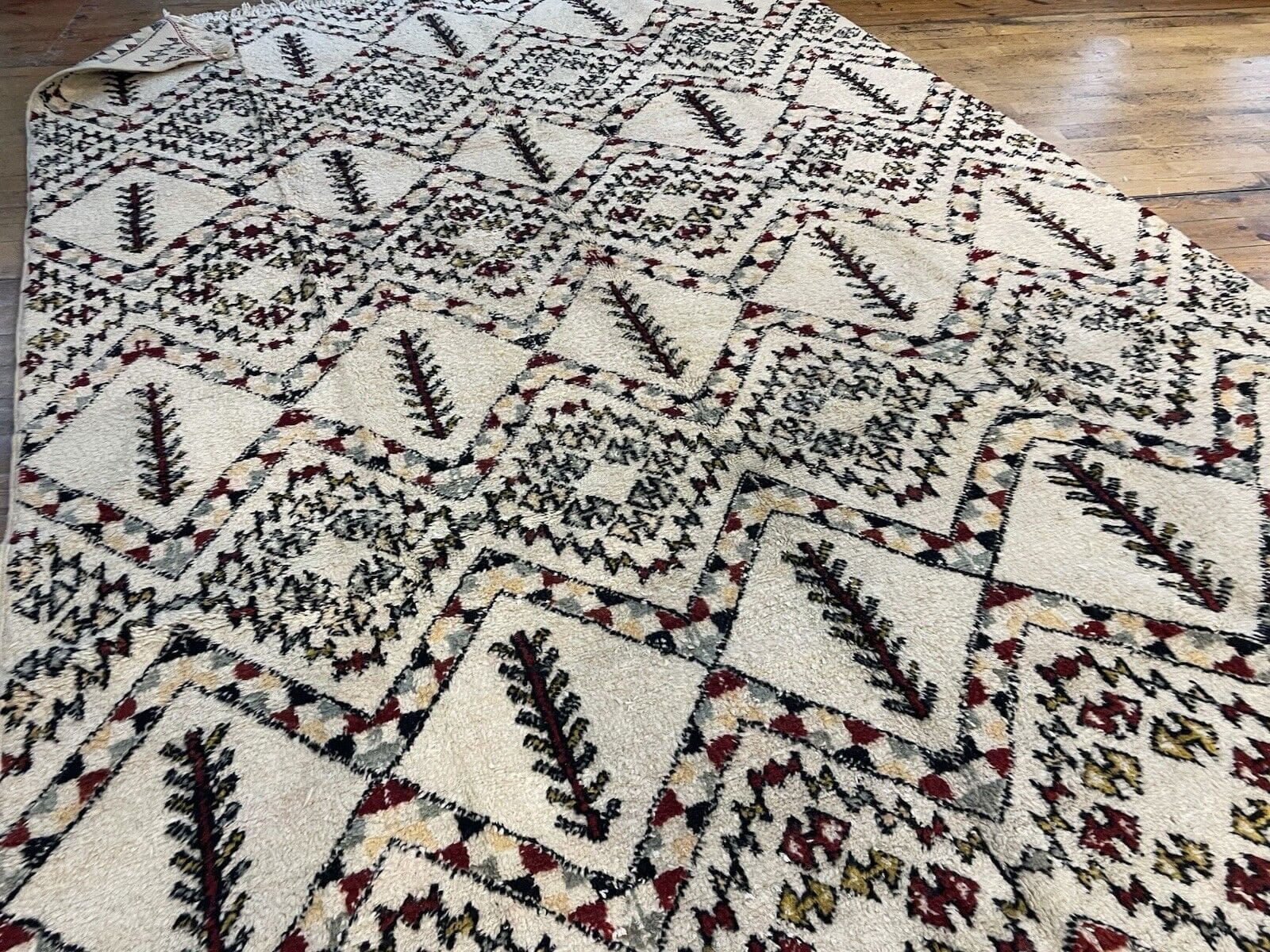 Die Designs, die in den Teppich eingewebt sind, erzählen oft Geschichten und Legenden aus der Region. Typisch für marokkanische Teppiche sind geometrische Muster und stylisierte Darstellungen der Natur und des täglichen Lebens. Ein solcher Teppich wird zum Mittelpunkt des Raumes und strahlt eine besondere Magie und Anziehungskraft aus. Die Farben sind meist intensiv und lebhaft, wobei die Kombination aus warme Erdtöne und kräftige Akzente harmonisch aufeinander abgestimmt sind.