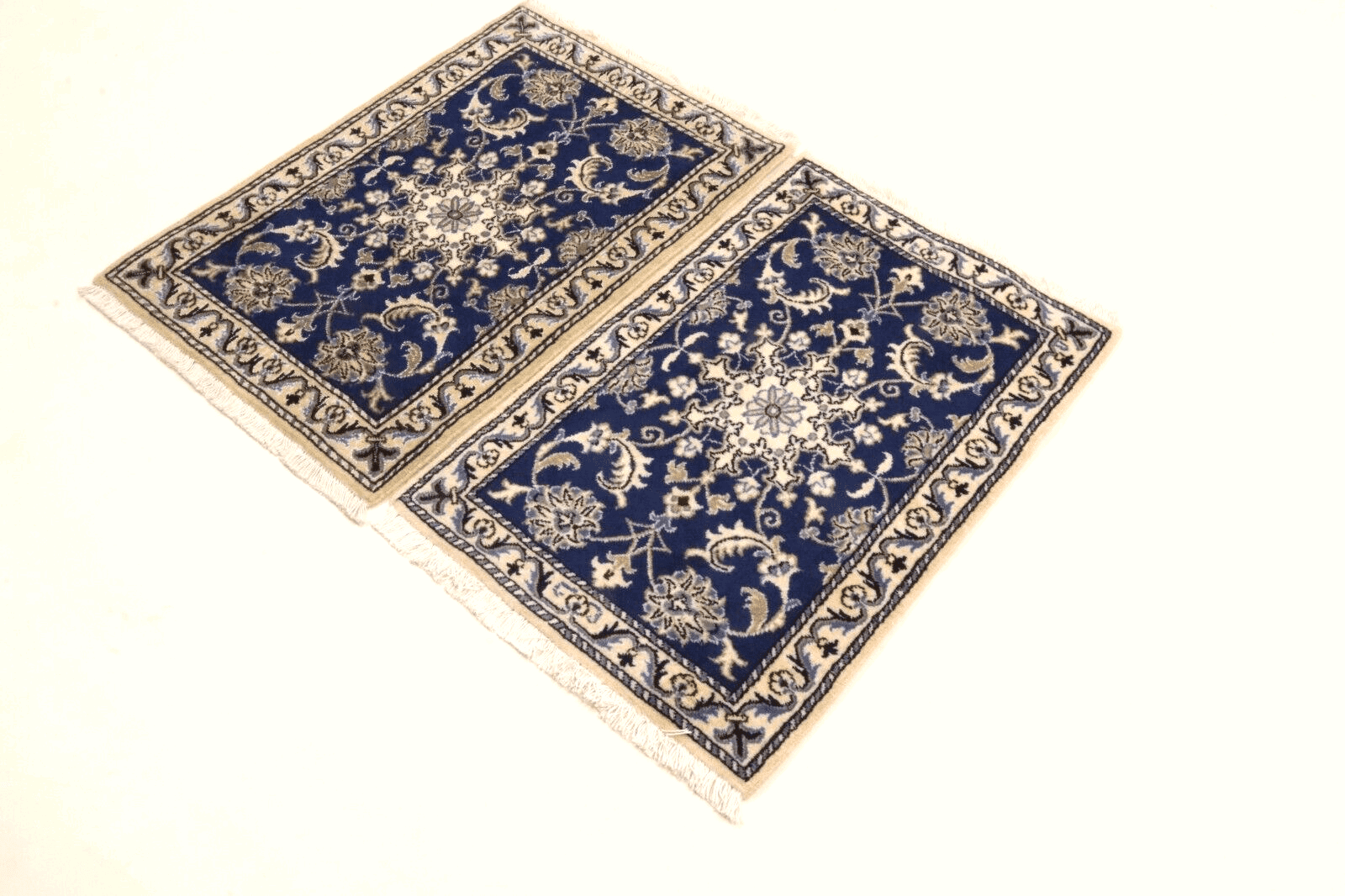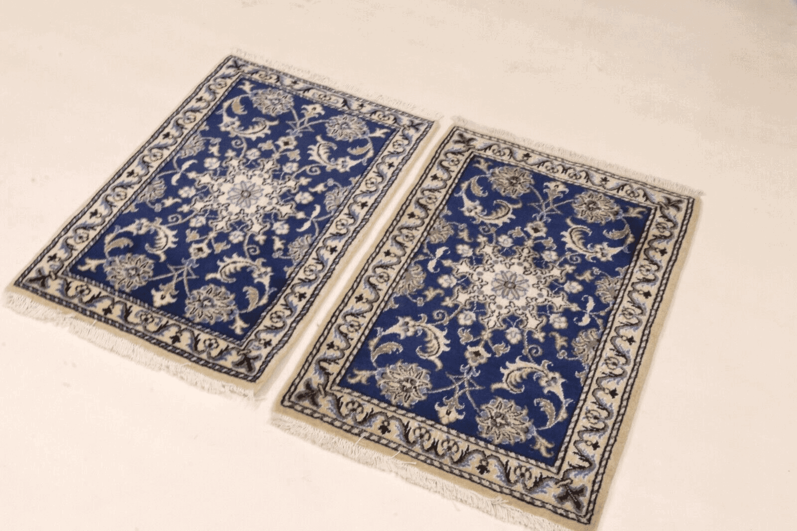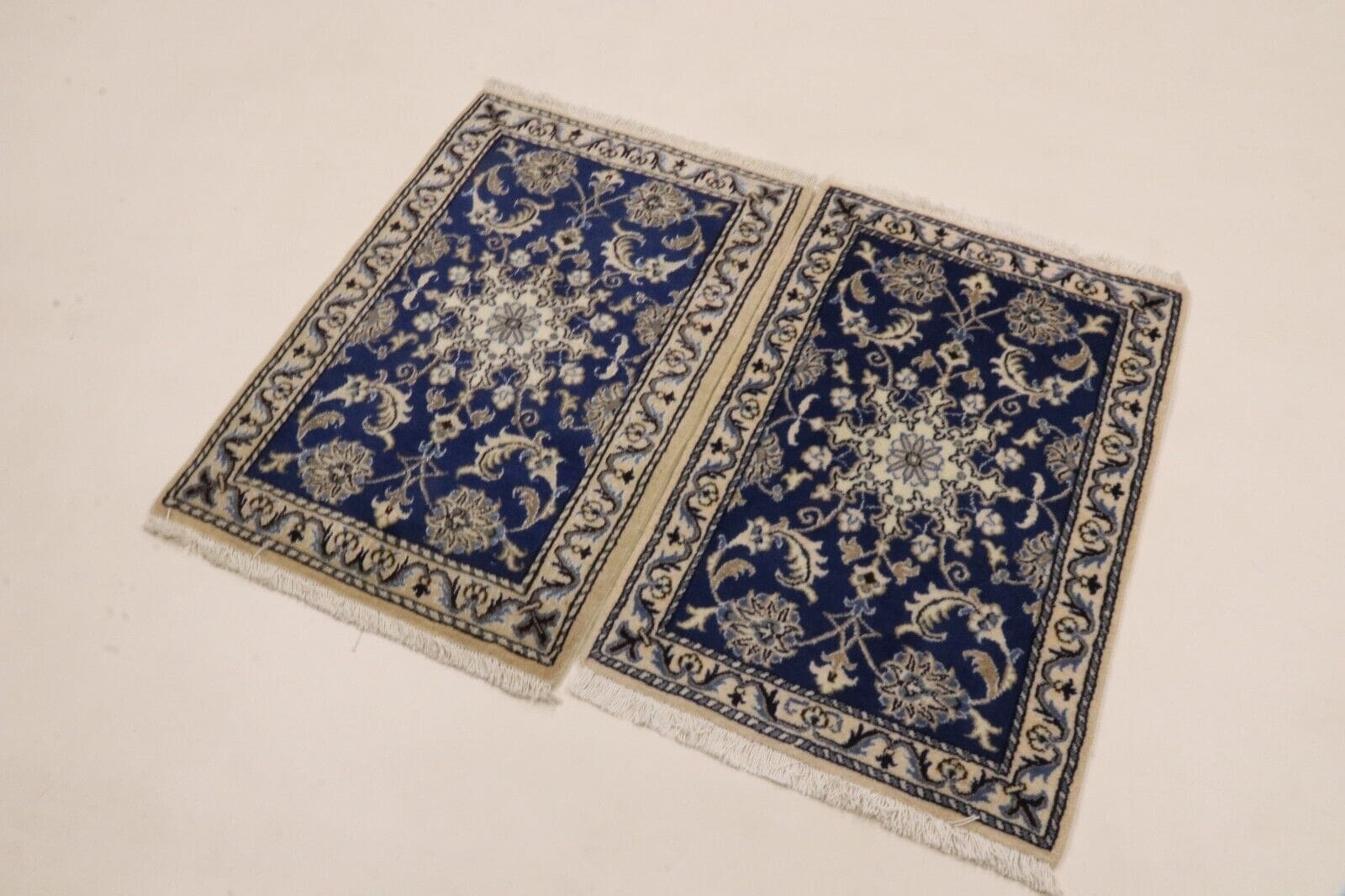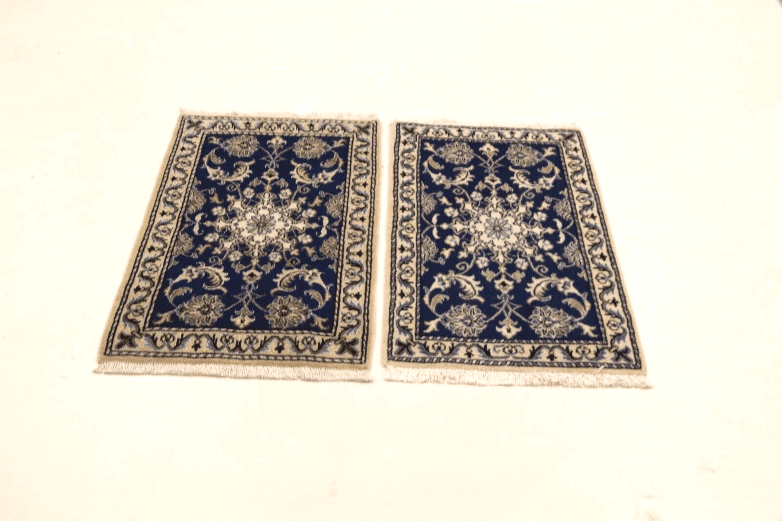 Handgeknüpfter Orientteppich | Größe: 90 x 60 cm | Knotendichte: ca. 300.000 Knoten/m² | Material: 90% Schurwolle, 10% Seide | Zustand: Neu, sehr gut | Herkunft: Persien | Dicke: ca. 8 mm | Stil: Traditionell Orientalisch/Persisch | Für Fußbodenheizung geeignet | Haustierfreundlich | Farbe: Blau | Regionale Design: Persisch