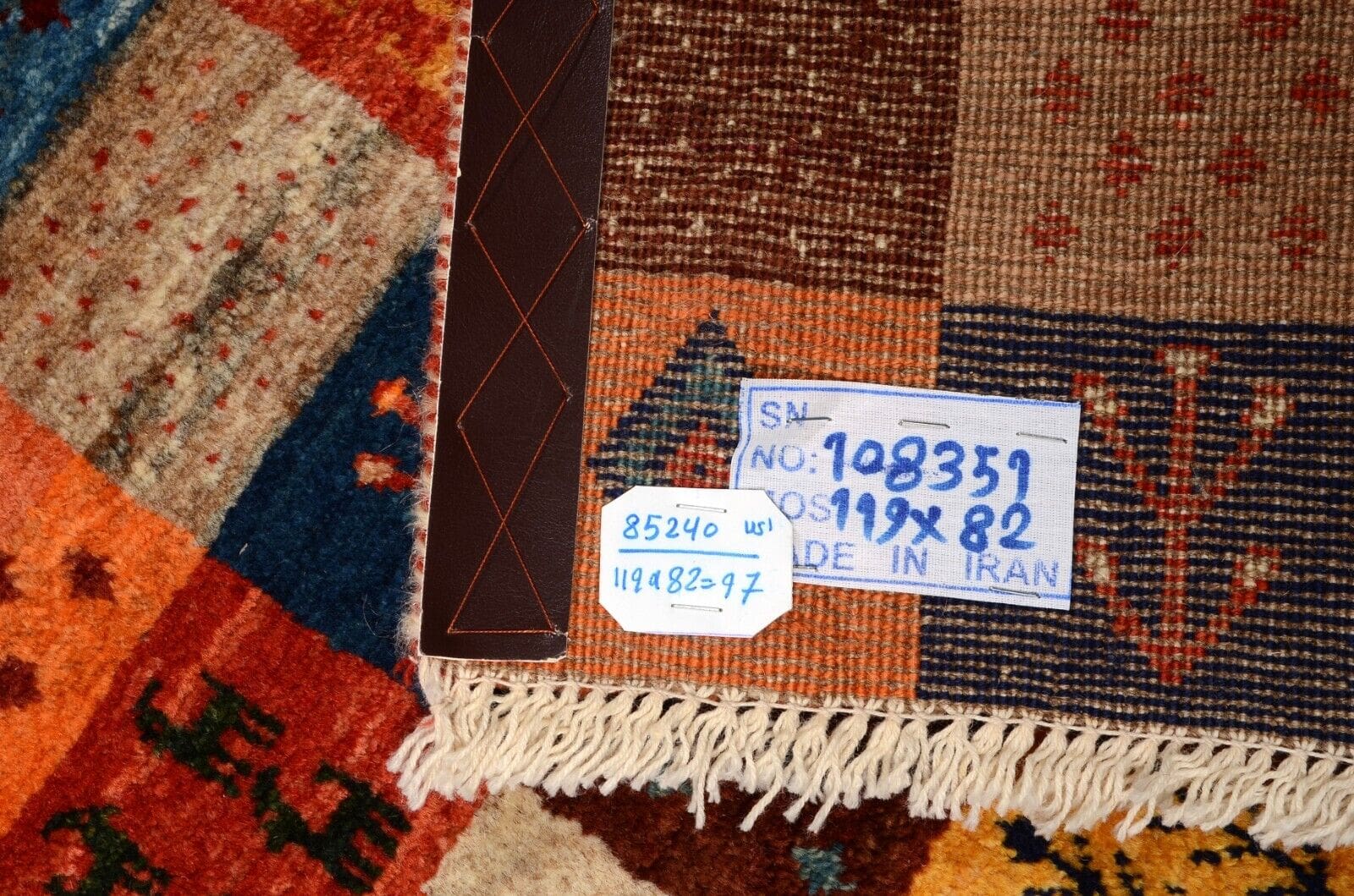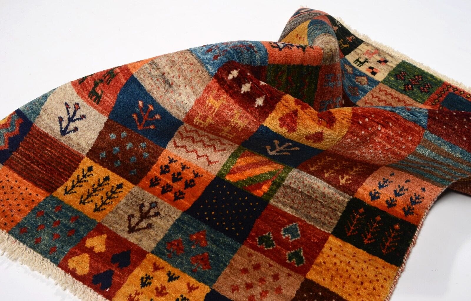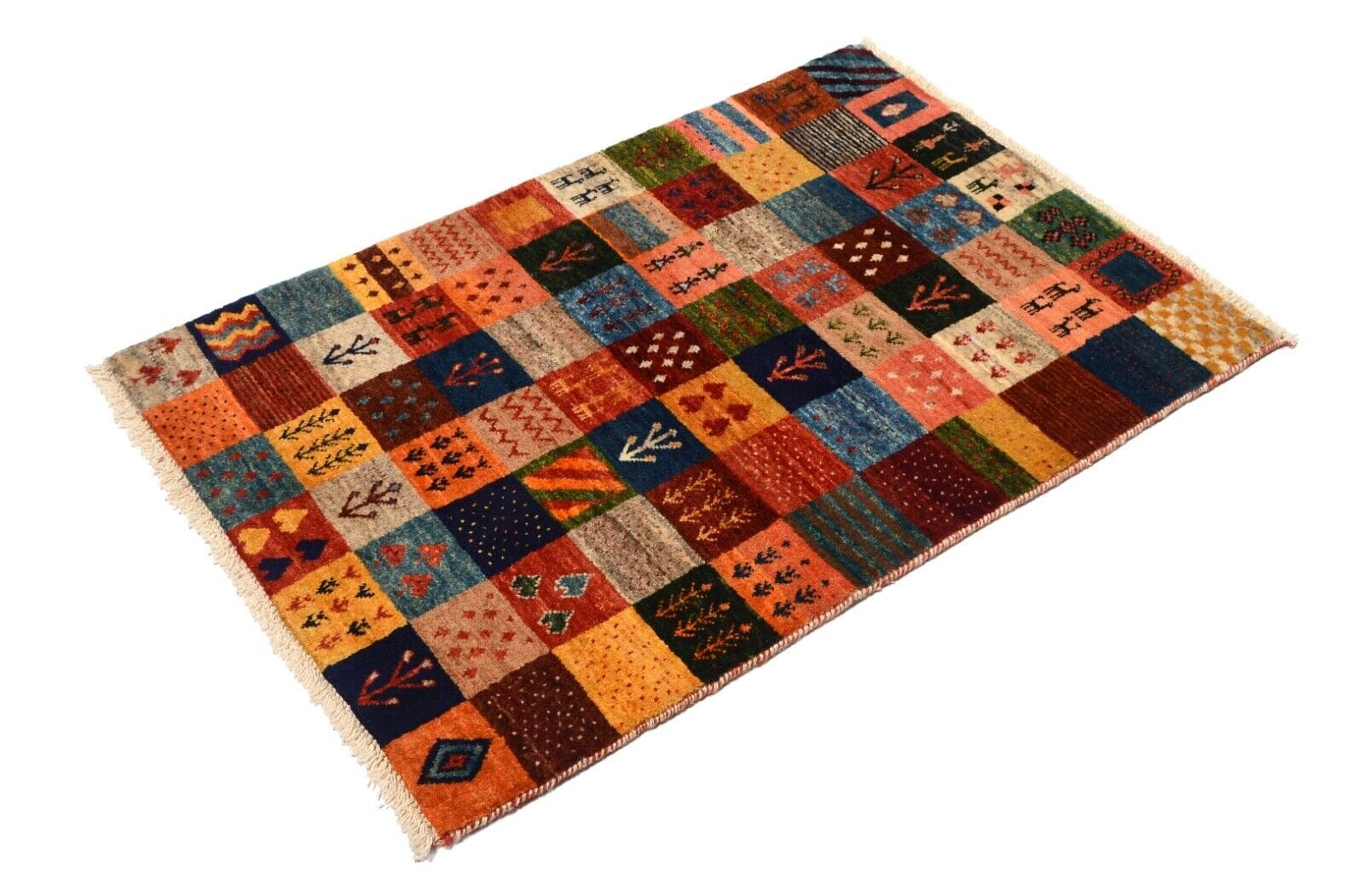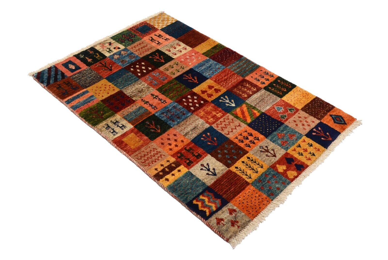 Handgeknüpfter Gabbeh Teppich | Knotendichte: 300.000 Knoten/m² | Material: 100% Schurwolle | Größe: 121×83 cm | Zustand: Neu und unbenutzt | Herkunft: Persien | Florhöhe: ca. 12 mm | Stil: Modern | Besonderheiten: Hohe Farbbeständigkeit, abriebfest, für Fußbodenheizung geeignet | Design: Patchwork, regionales Design Qashqai