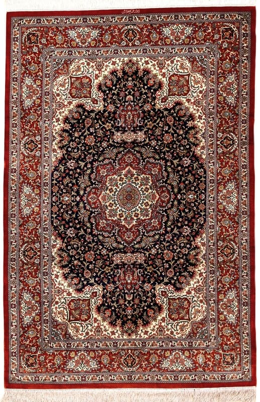 Der Teppich stammt aus Ghom, einer Stadt im Iran, die für ihre Teppichproduktion berühmt ist. Ghom-Teppiche sind bekannt für ihre exquisite Handwerkskunst und die Verwendung von edlen Materialien wie Seide und Wolle. Die Tradition des Teppichknüpfens hat in dieser Region eine lange Geschichte, die bis in die Antike zurückreicht. Ghom ist nicht nur für die Qualität seiner Teppiche bekannt, sondern auch für die charakteristischen Designs, die oft von islamischer Kunst und Architektur inspiriert sind. Diese Teppiche sind ein Symbol für persische Kultur und Handwerkskunst und werden oft als Erbstücke weitergegeben.