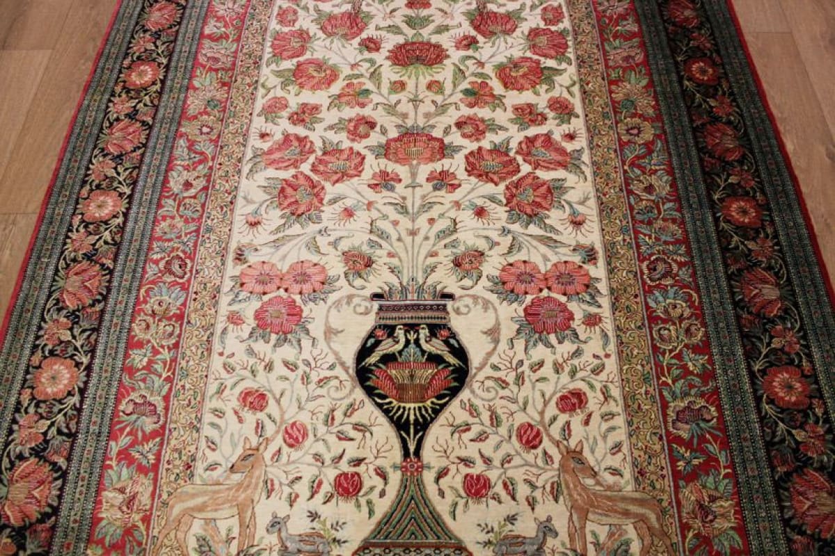 • Perserteppich Ghom | Knotendichte: sehr hoch | Material: 100% Seide | Größe: 209×140 cm | Zustand: Unikat, in ausgezeichnetem Zustand | Ursprung: Iran | Muster: Quadratisch unterteilte Gartenteppiche, Jagdarien, Botteh-Motive, zentrale Medaillons und Vasenmuster | Farbpalette: Naturfarben in Rot, Türkis, Lichtblau, Grün, Braun und Elfenbein
