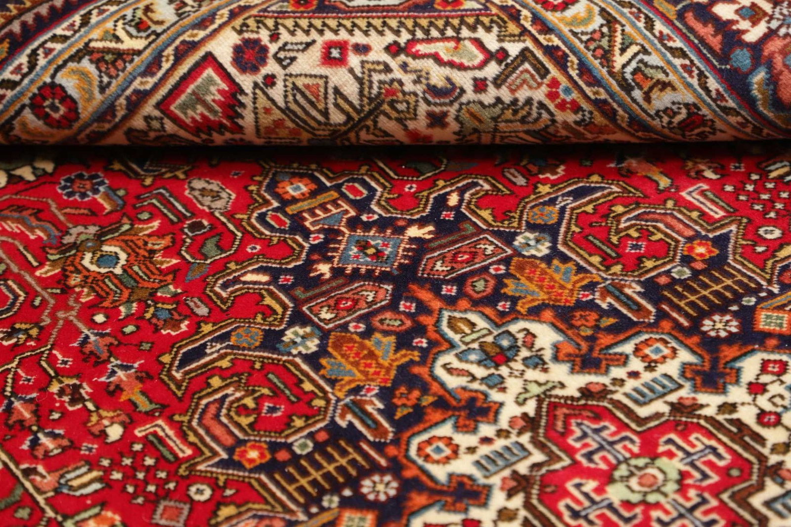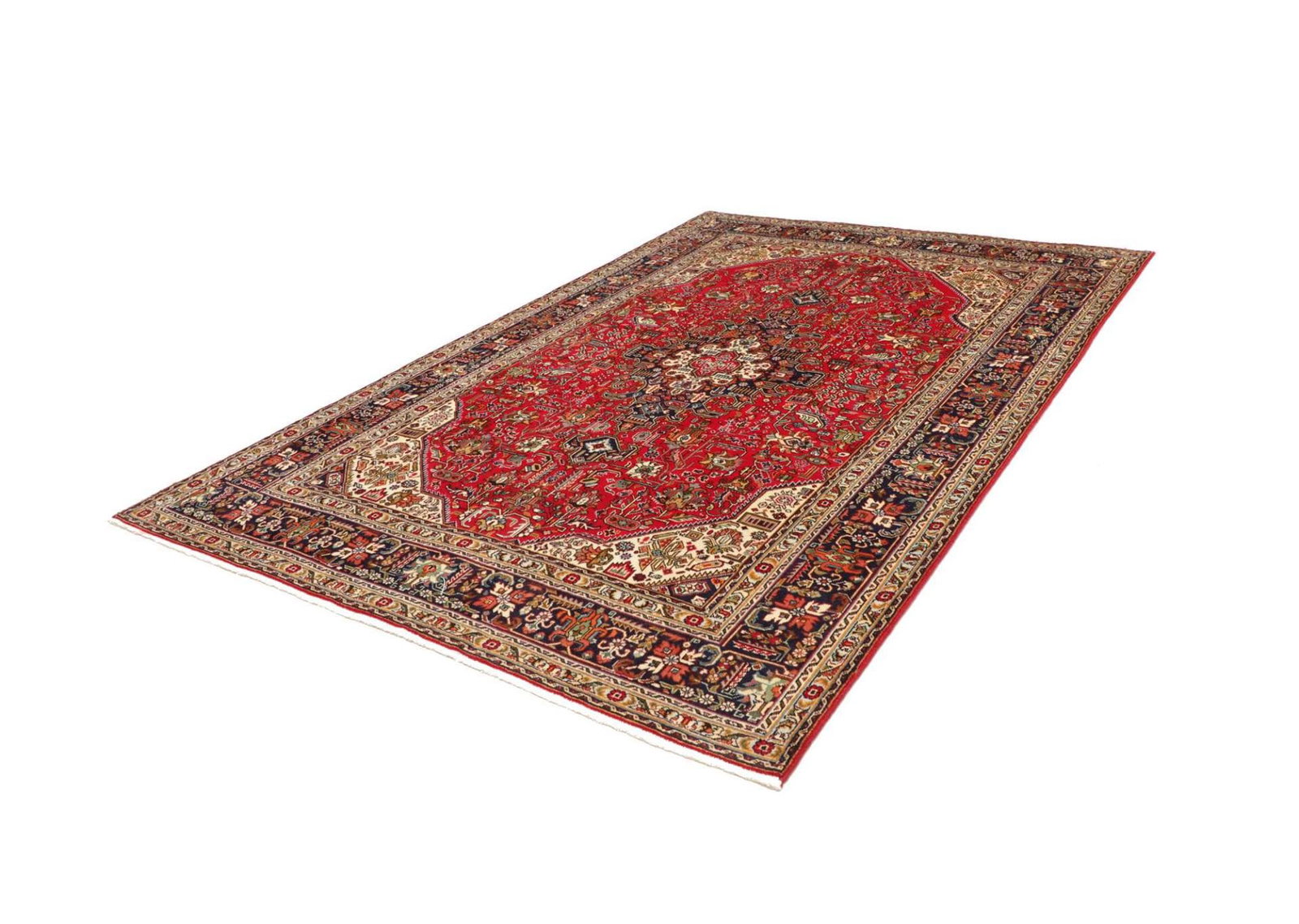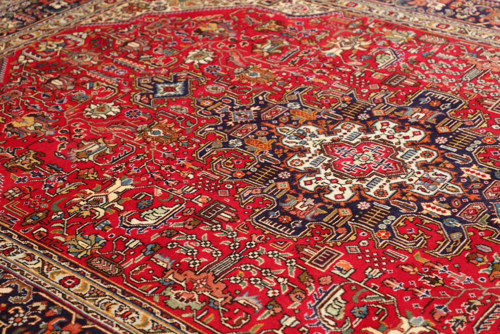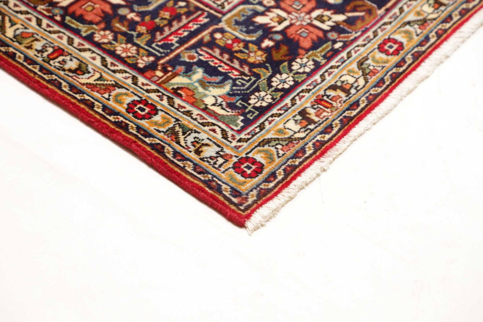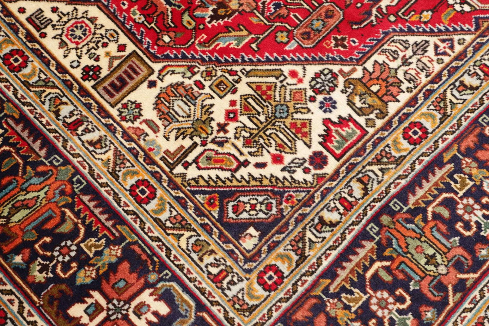 Das Design dieses Teppichs ist ein hervorragendes Beispiel für die kunstvolle Teppichgestaltung aus Täbriz. Die Farben sind sowohl lebendig als auch harmonisch, mit einer Kombination aus tiefen Rottönen, eleganten Blauen und sanften Beigetönen, die zusammen ein beeindruckendes Gesamtbild ergeben. Die komplexen Muster sind von traditionellen Motiven inspiriert und weisen florale sowie geometrische Elemente auf, die in einer symmetrischen Anordnung präsentiert werden. Diese Vielfalt an Mustern macht den Teppich nicht nur zu einem Blickfang, sondern integriert sich auch perfekt in verschiedene Einrichtungsstile.