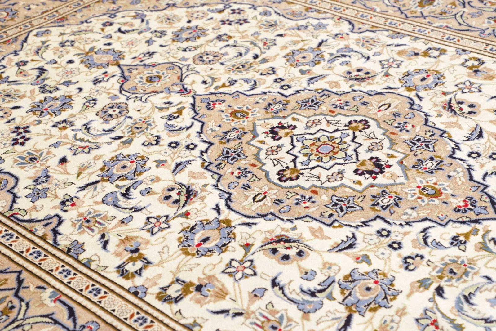 Kashan ist eine Region im Iran, die für ihre traditionellen Teppichknüpftechniken bekannt ist. Die Teppiche dieser Region sind geprägt von aufwendigen Mustern und einer hohen Knotendichte, die oft um die 200.000 Knoten pro Quadratmeter beträgt. Diese hohe Knotendichte ist ein Indikator für die Qualität und die Detailgenauigkeit der Teppiche. Typische Muster in Kashan Teppichen sind florale und geometrische Designs, die von der reichen Kultur und Geschichte des Iran inspiriert sind. Die Knüpfung erfolgt in Handarbeit, was jedem Teppich eine individuelle Note verleiht und ihn zu einem Unikat macht.