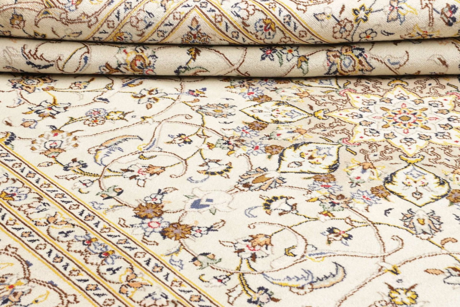 Kashan Teppiche sind für ihre Strapazierfähigkeit und Langlebigkeit bekannt. Die Verwendung von 100% Schurwolle im Flor sowie 100% Baumwolle in der Kette trägt zur hohen Qualität und Alltagstauglichkeit bei. Die handgeknüpfte Verarbeitung sorgt für eine feine Struktur und einen hohen Grad an Detailgenauigkeit. Mit einer Knotendichte von etwa 200.000 Knoten pro Quadratmeter stehen diese Teppiche für exquisite Handwerkskunst und sind eine wertvolle Bereicherung für jedes Zuhause.