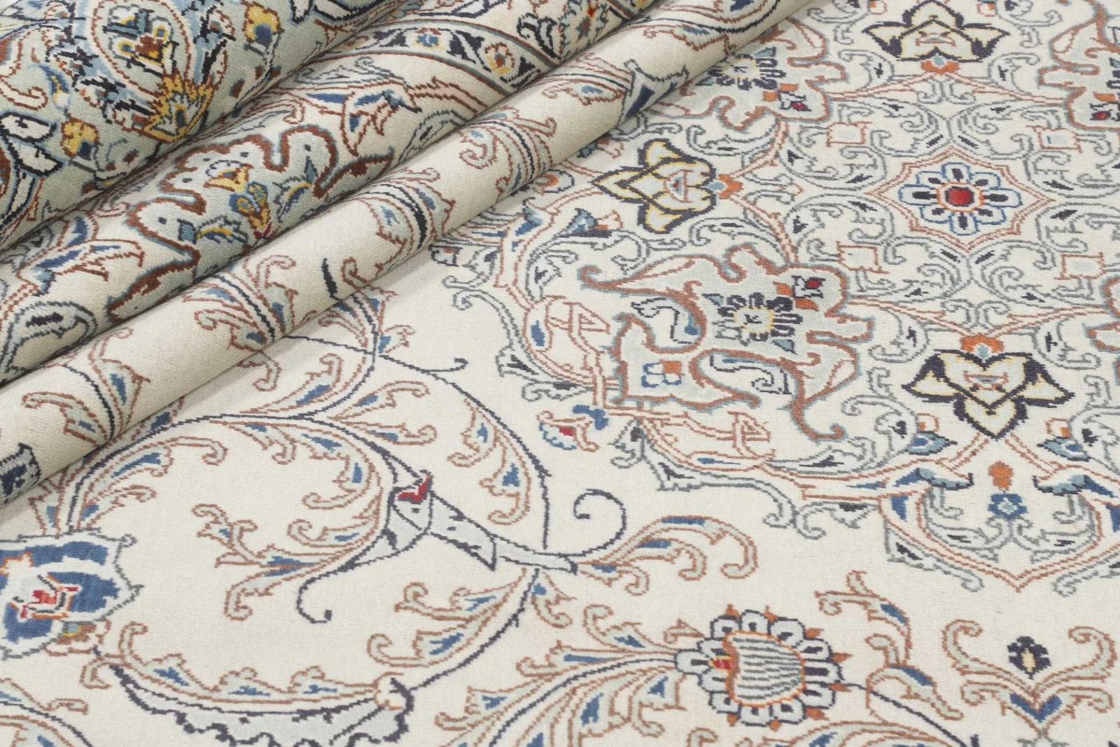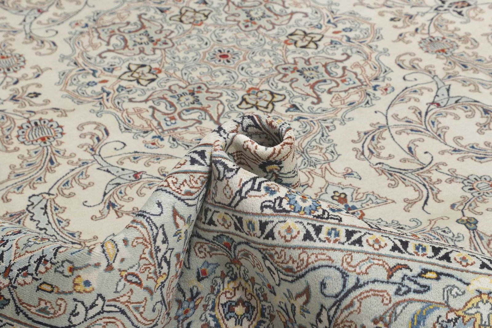 Der Kashan Teppich ist ein herausragendes Beispiel für die Kunst der Teppichknüpfung aus der berühmten persischen Stadt Kashan im Iran. Diese Teppiche sind bekannt für ihre Strapazierfähigkeit und erhalten ihre Schönheit über Jahrzehnte. Der Flor besteht aus 100% Schurwolle, die nicht nur eine angenehme Haptik bietet, sondern auch schallabsorbierende Eigenschaften hat und die Luftfeuchtigkeit im Raum reguliert. Die Kette besteht aus 100% Baumwolle, die aufgrund ihrer Strapazierfähigkeit und feinen Struktur ideal für handgeknüpfte Teppiche geeignet ist. Die Verarbeitung erfolgt in Handarbeit, was jedem Teppich eine einzigartige Qualität verleiht. Die Knotendichte des Kashan Teppichs beträgt ca. 200.000 Knoten pro Quadratmeter, was auf eine hohe Detailgenauigkeit und Qualität hinweist.