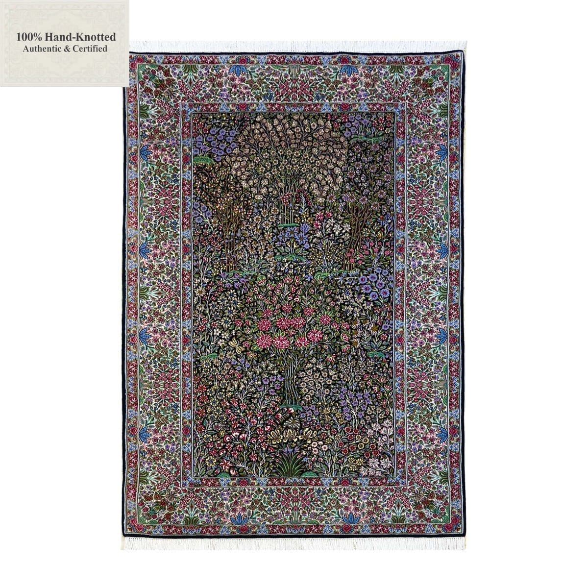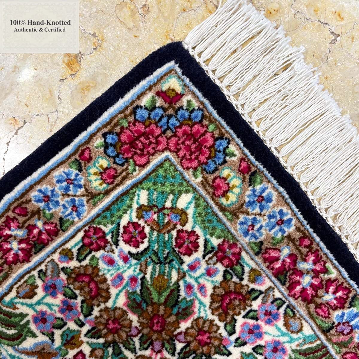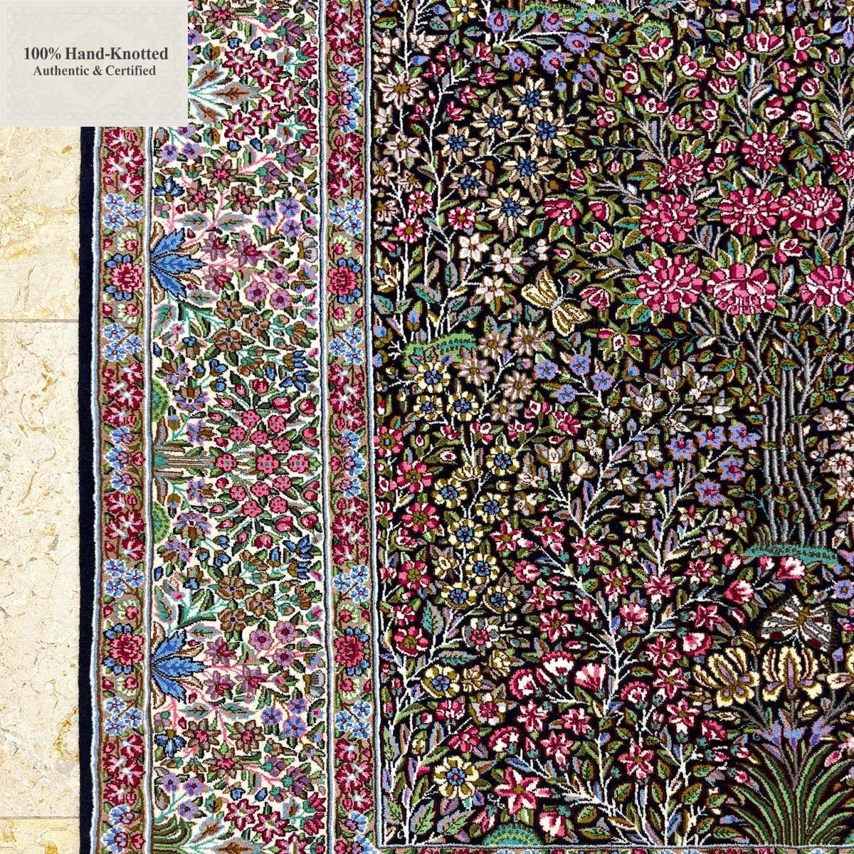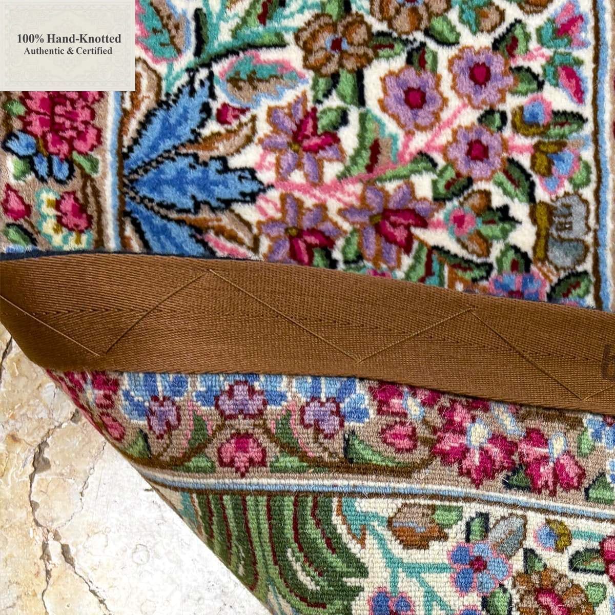 Die Feinheit von 100 Jift entspricht einer Knotendichte von (ca. 500.000 Knoten / m²). Das Material wird als Schurwolle aus Sirjan spezifiziert. Die Herstellung erfolgt handgeknüpft in der Region Kerman.