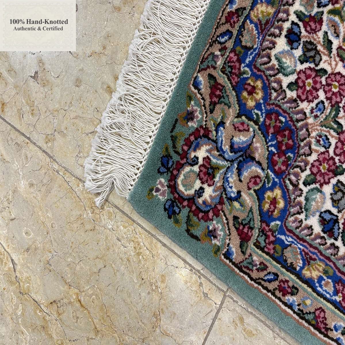 Die Feinheit von 70 Jift entspricht einer Knotendichte von (ca. 350.000 Knoten / m²). Das Material wird als Schurwolle aus Sirjan spezifiziert. Die Herstellung erfolgt handgeknüpft in der Region Kerman.