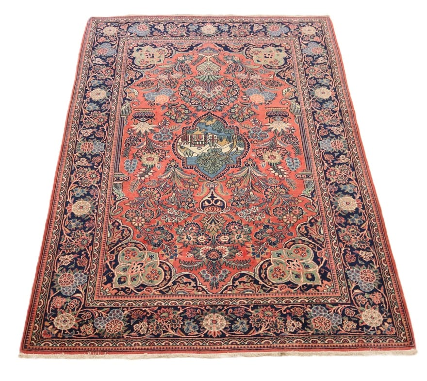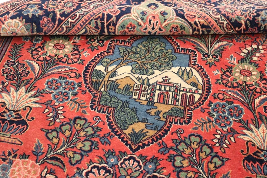 Dieser Teppich ist ca. 90 Jahre alt und befindet sich in einem guten Zustand, was ihn zu einem interessanten Sammlerstück macht. Die hohe Knotendichte von ca. 200.000 bis 250.000 Knoten pro Quadratmeter spricht für die Detailgenauigkeit und die aufwendige Handarbeit, die in seine Herstellung geflossen sind. Die Verwendung von Wolle im Flor sorgt für einen luxuriösen Eindruck und erhöht die Haltbarkeit des Teppichs im Alltag.