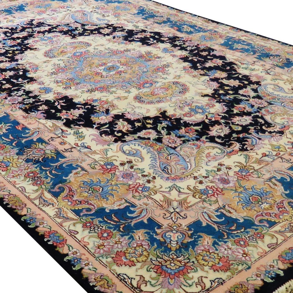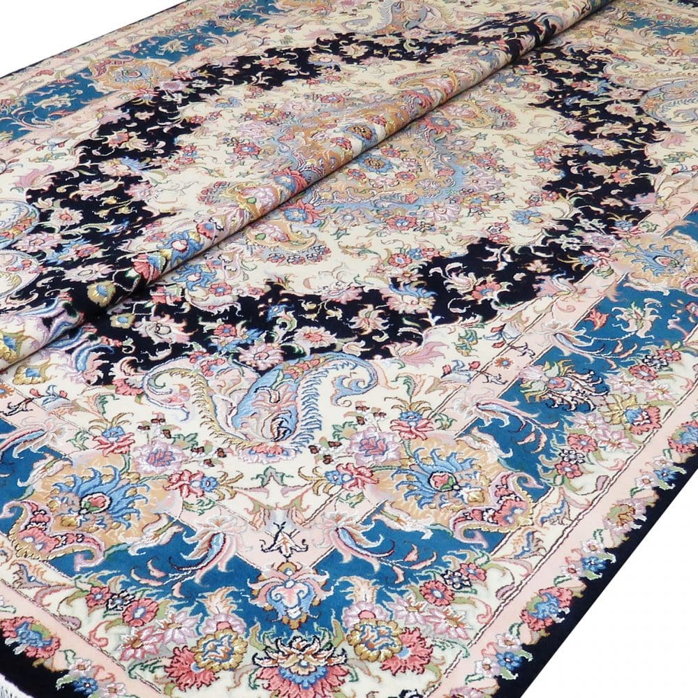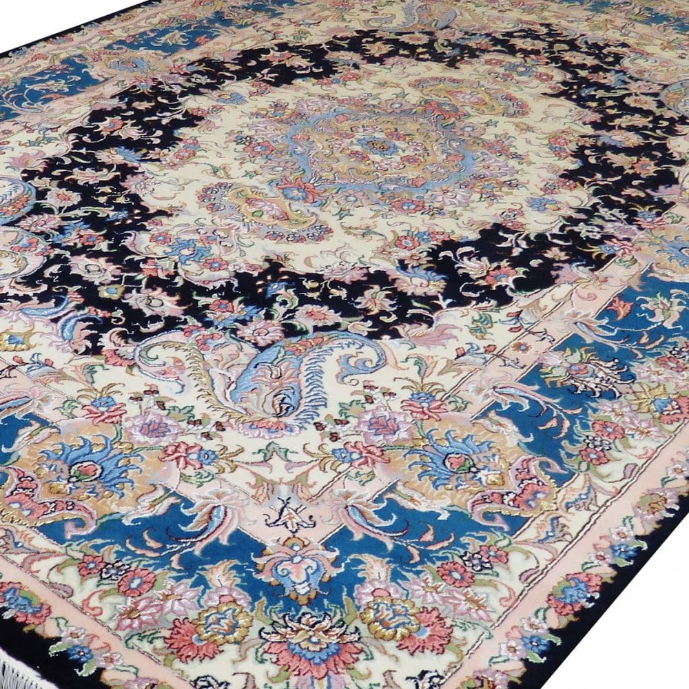 Der Teppich weist ein tiefes, schimmerndes Dunkelblau (سرمه ای سیر) als Grundfarbe auf, das mit einem zarten, bläulich-grünen Rand verziert ist. Das Muster, bekannt als „خطیبی تبریز“, ist charakteristisch für die Teppiche dieser Region und bietet eine harmonische Symmetrie. Die Verwendung von Seidenblüten in der Florstruktur sorgt für einen eleganten Glanz und eine feine Textur, die den Teppich besonders ansprechend macht. Die Kombination dieser Farben und Muster verleiht dem Teppich eine zeitlose Eleganz, die in verschiedenen Einrichtungsstilen harmoniert.