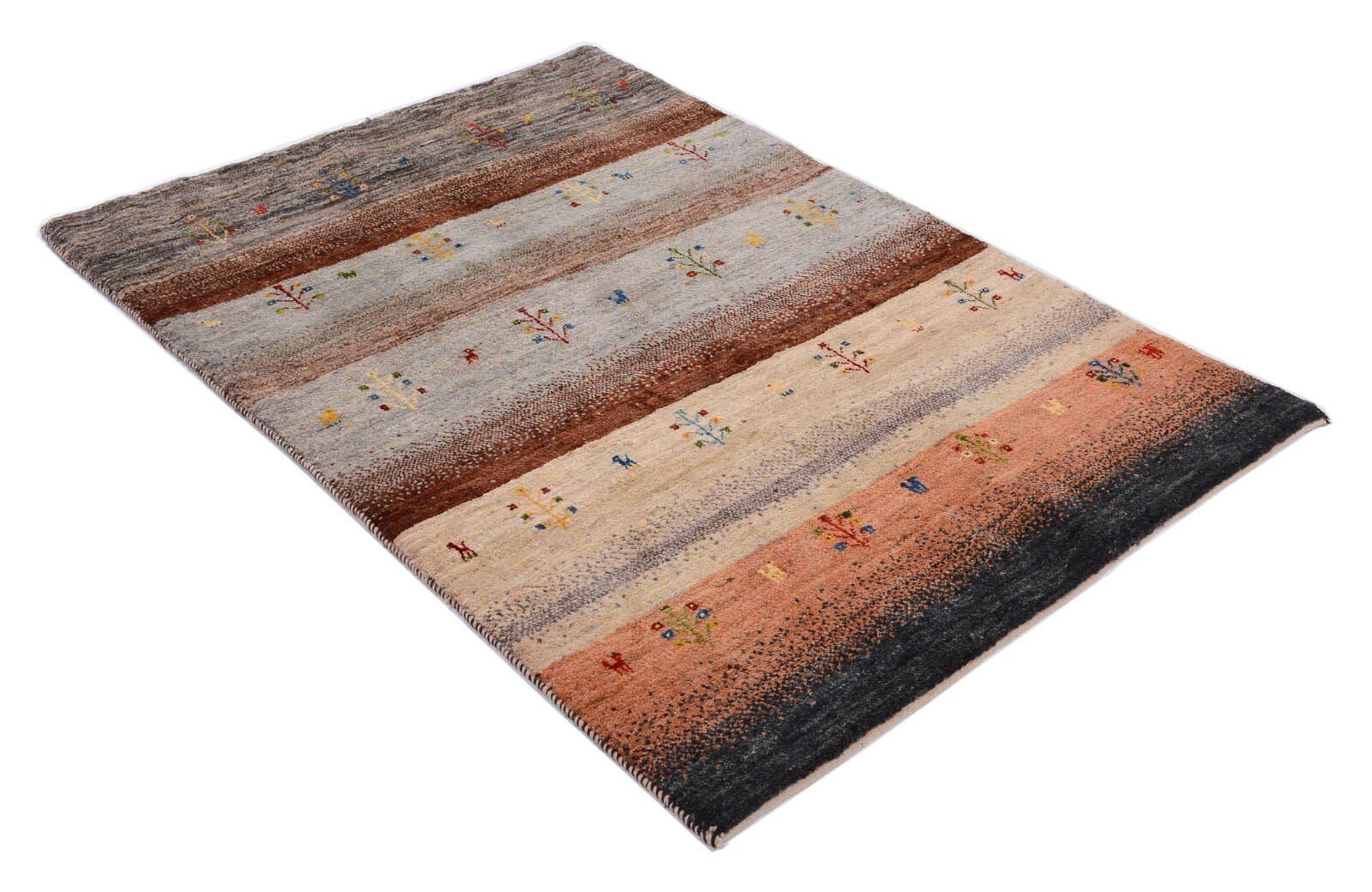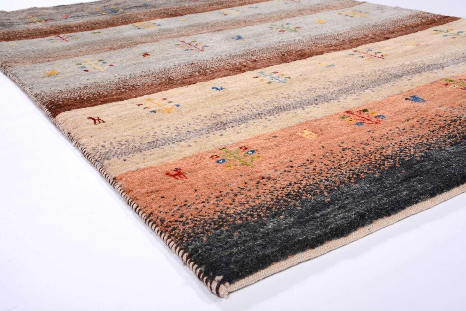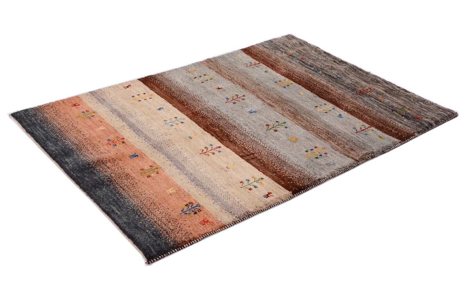 Handgeknüpfter Perserteppich Gabbeh Loribaft | Größe: 175 x 117 cm | Knotendichte: 300.000 Knoten/m² | Material: 100% Schurwolle, handgesponnen und handgefärbt | Zustand: Neu, perfekt | Herkunft: Persien | Dicke: ca. 12 mm | Für Fußbodenheizung geeignet | Modernes, gestreiftes Design | Gewicht: ca. 4 kg/m²