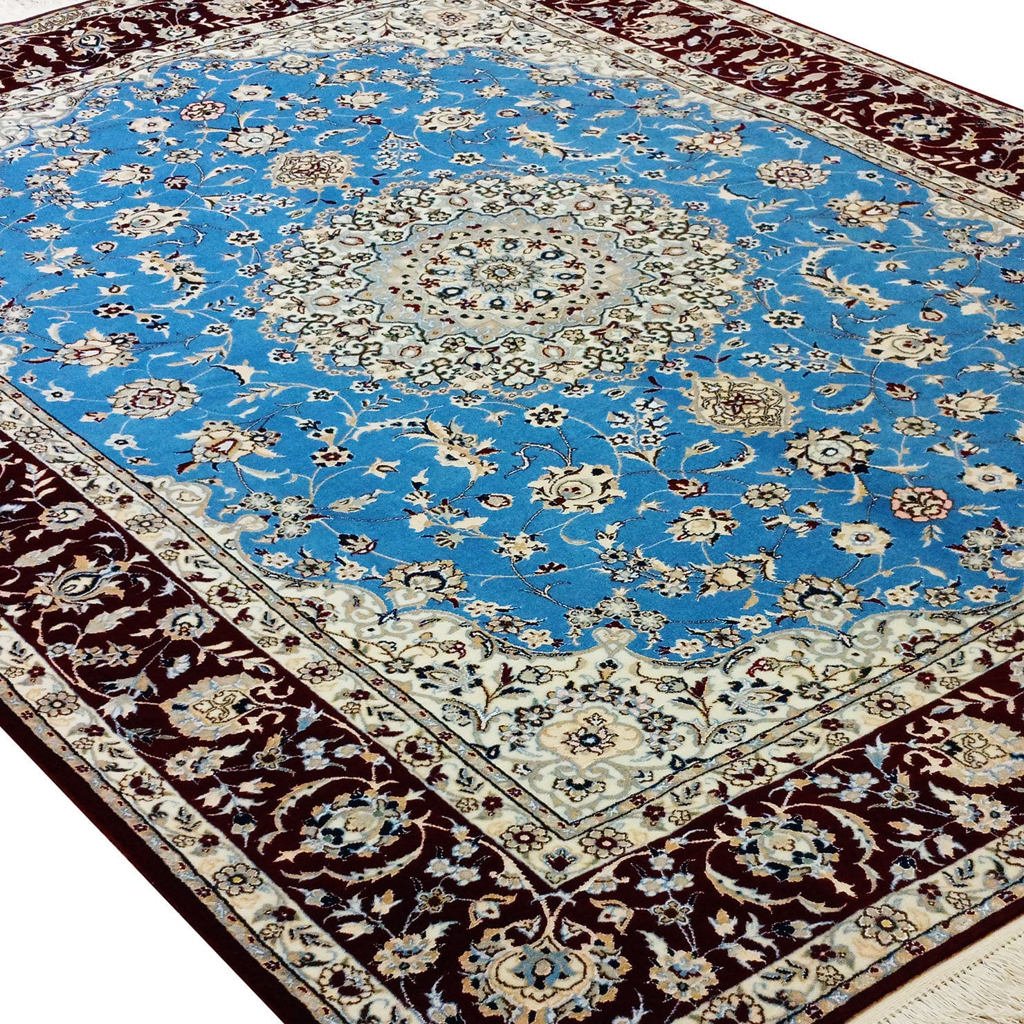 Der Nain-Teppich präsentiert ein klassisches Design mit dem Muster Lachak und Toranj, das reich an kulturellen Symbolen ist. Der Hintergrund ist in einem tiefen Blau gehalten, welches durch einen burgunderfarbenen Rand ergänzt wird. Diese Farbkombination sorgt für eine edle und zeitlose Optik. Die Muster sind symmetrisch angeordnet und fügen sich harmonisch in das Gesamtbild ein. Die feinen Details und die sorgfältige Anordnung der Motive sind Belege für die hohe Handwerkskunst der Teppichknüpfer aus Nain.