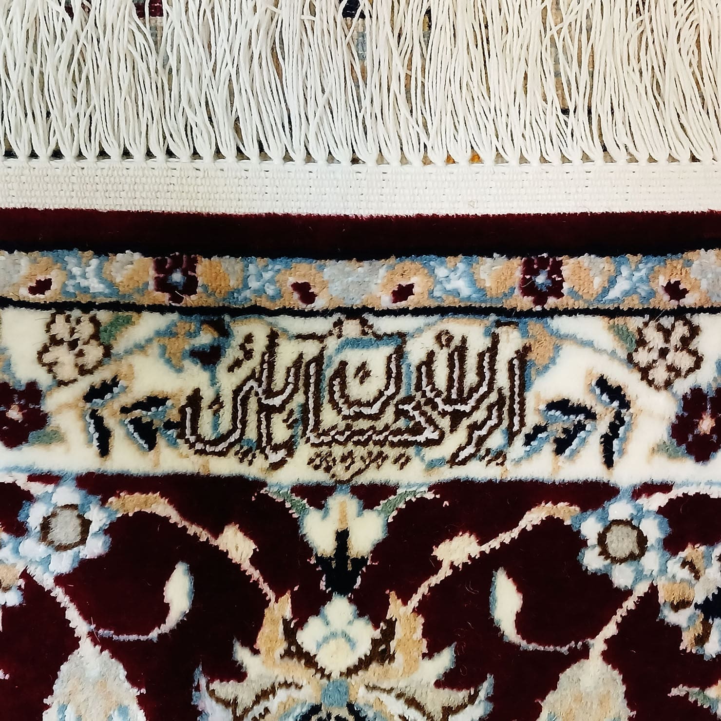 Der Teppich ist in neuem Zustand und wurde unter Berücksichtigung traditioneller Knüpftechniken hergestellt. Die Knotendichte von 60 Raj zeigt die hohe Qualität der Verarbeitung, die typisch für Nain-Teppiche ist. Die Verwendung von etwa 15 % Seide im Flor verleiht dem Teppich zusätzlichen Glanz und macht ihn besonders ansprechend. Diese Eigenschaften machen ihn nicht nur zu einem dekorativen Element für jedes Zuhause, sondern auch zu einer wertvollen Investition in Kunsthandwerk und Kultur.