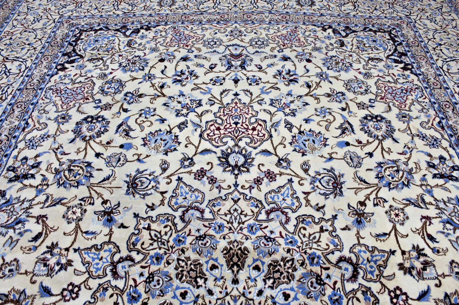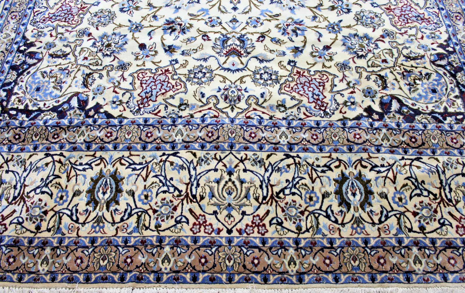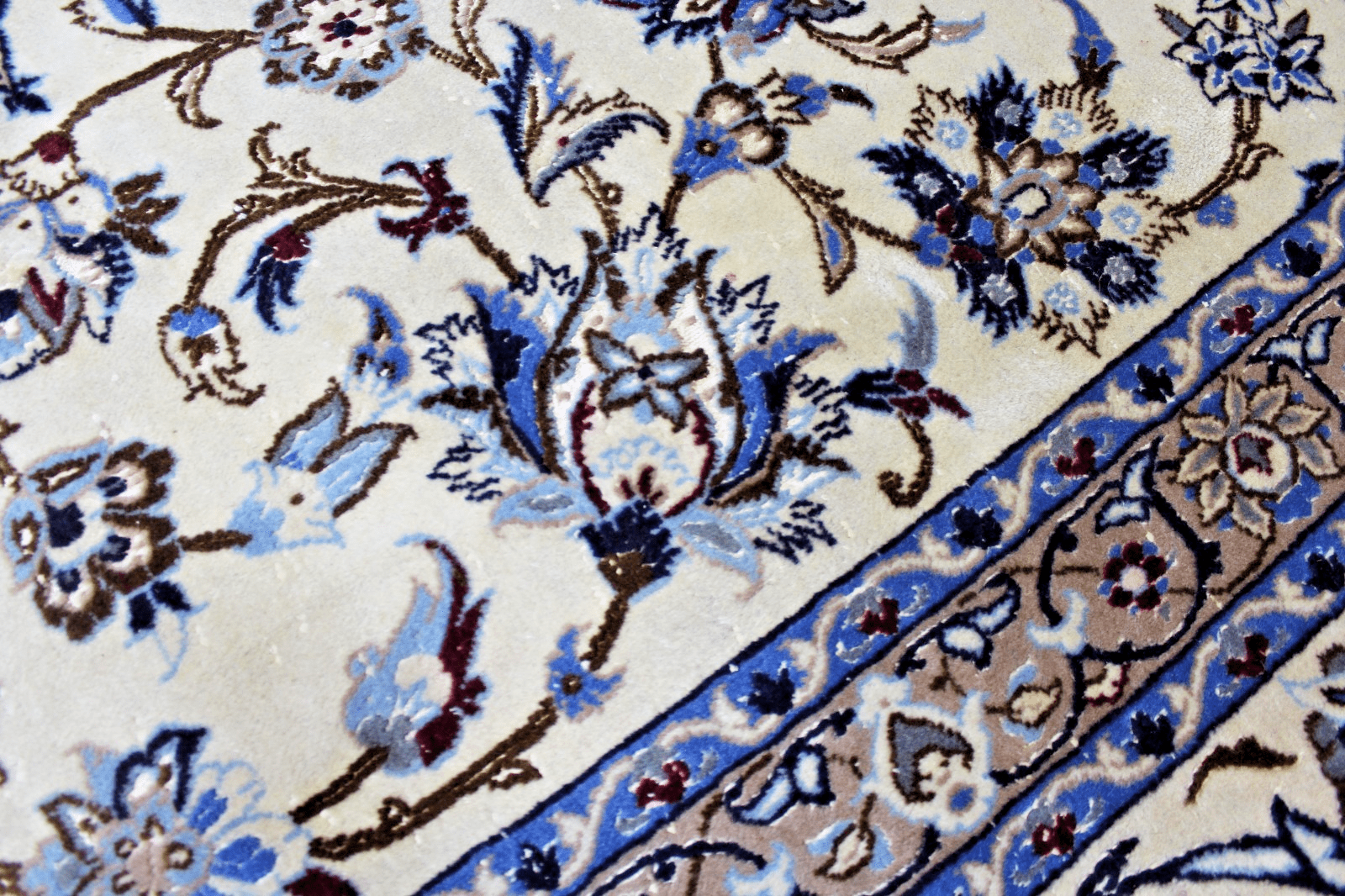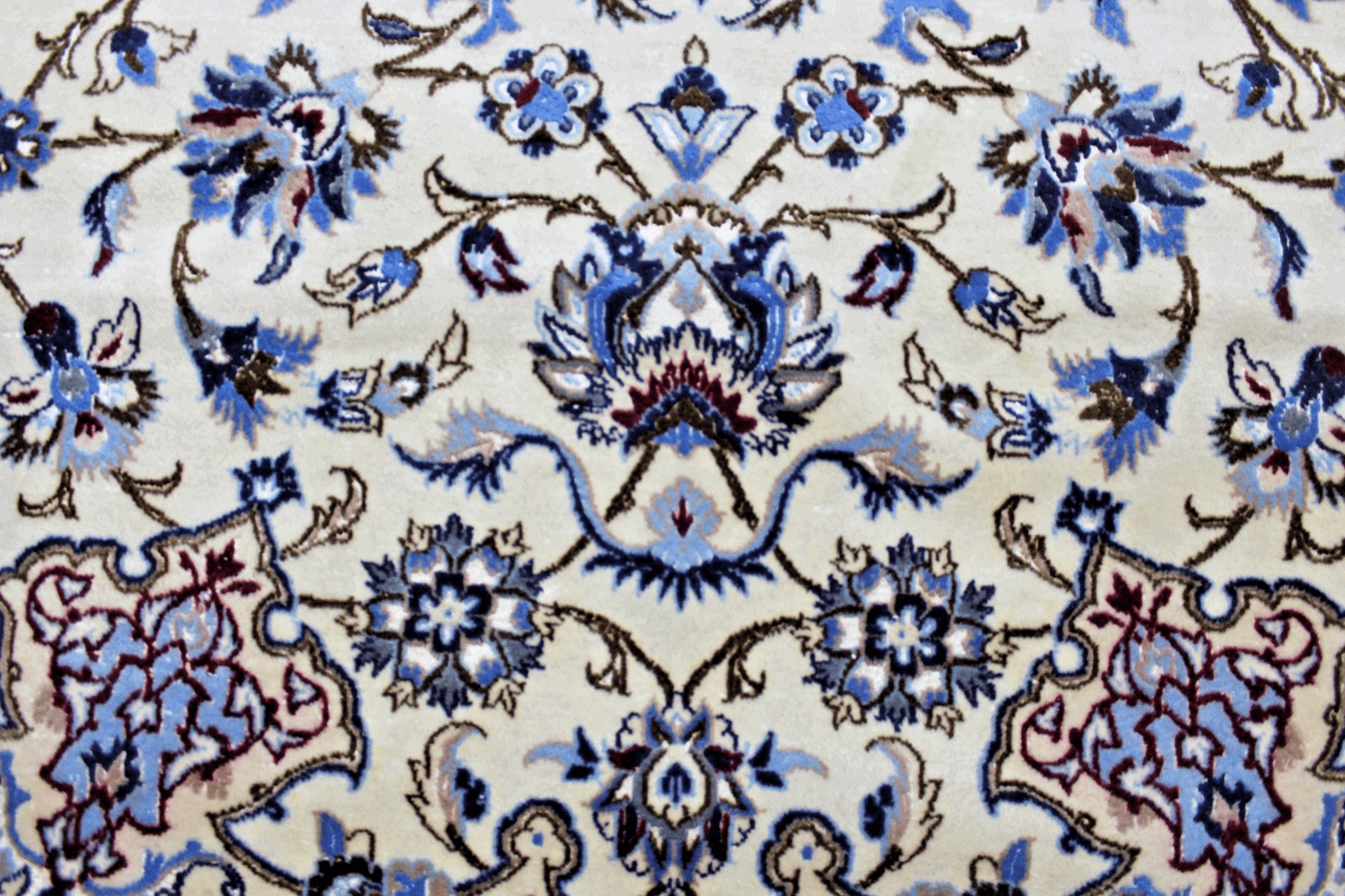 Typische Designs der Nain-Teppiche umfassen florale Motive und geometrische Muster, die oft eine komplexe Symmetrie aufweisen. Die Farbtöne sind harmonisch aufeinander abgestimmt, wobei sanfte Blau-, Creme- und erdige Rottöne dominieren. Diese Farbpalette trägt zur ästhetischen Anziehungskraft und zur eleganten Gestaltung bei, die den Teppich zu einem Blickfang in jedem Raum macht.