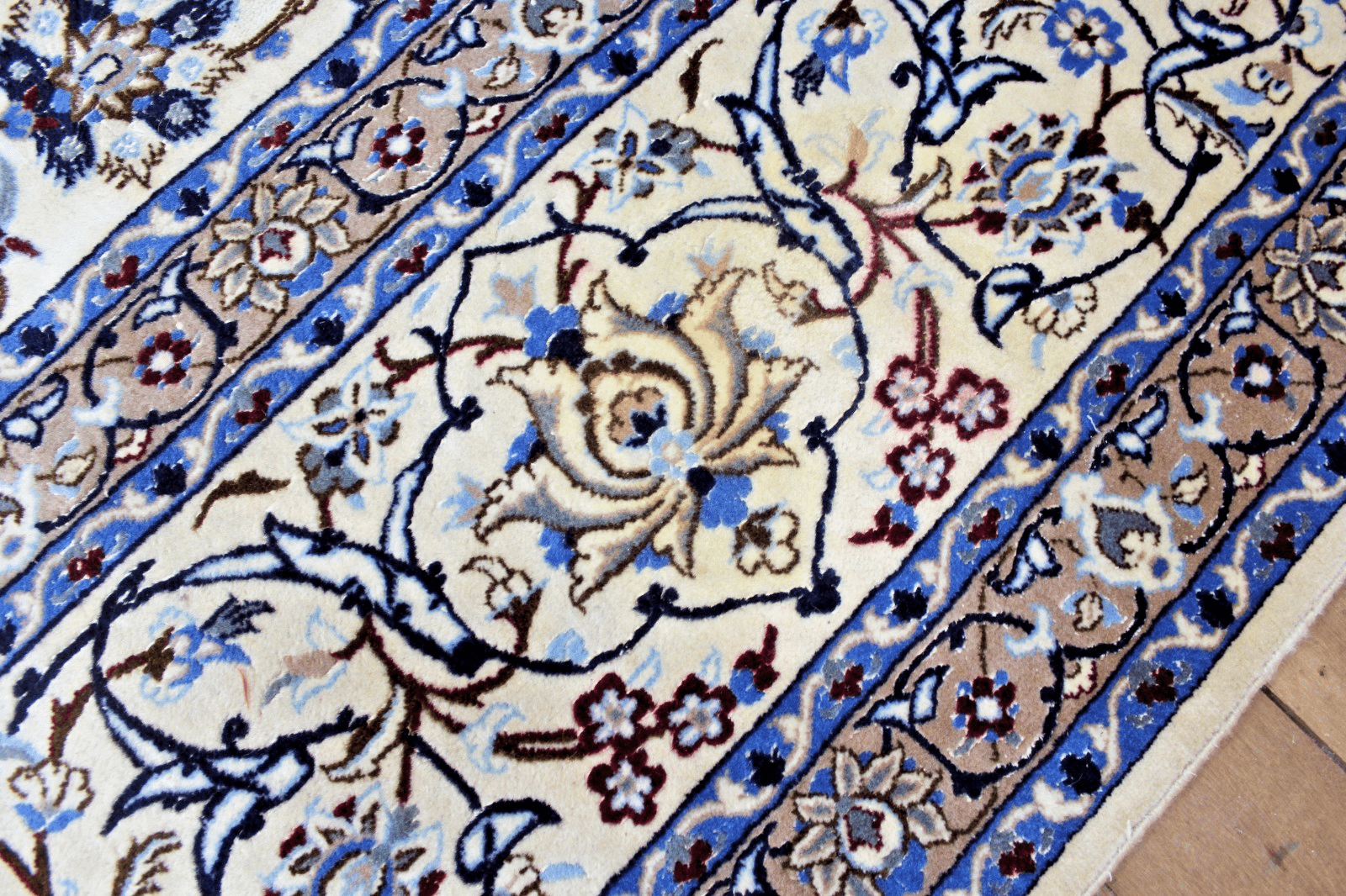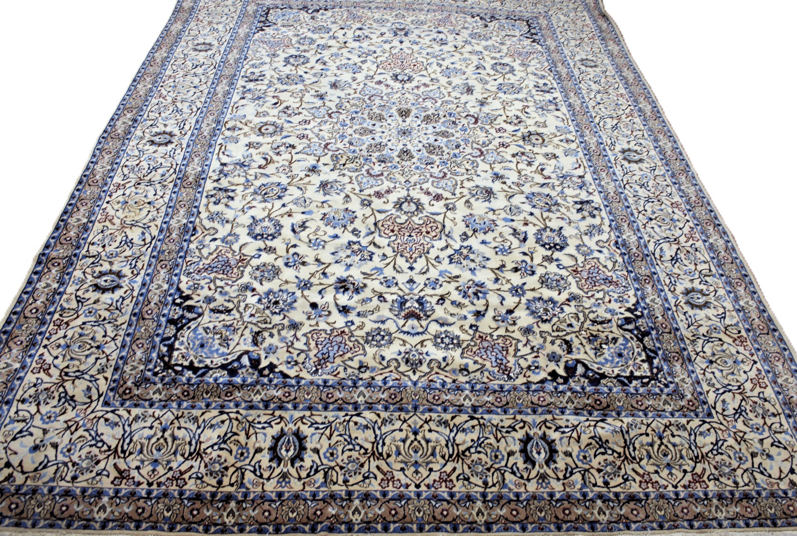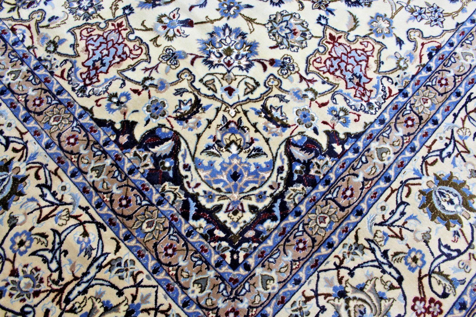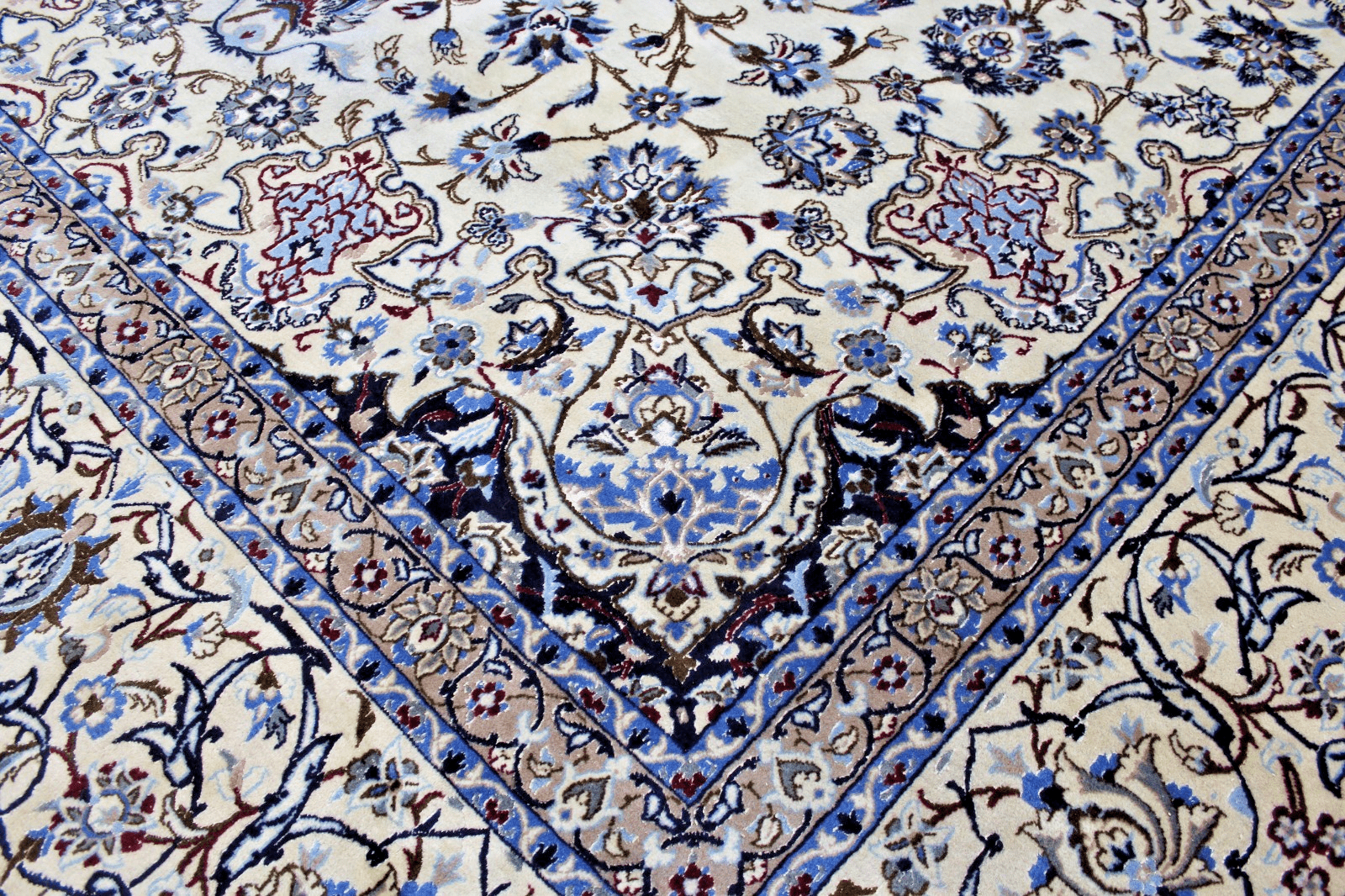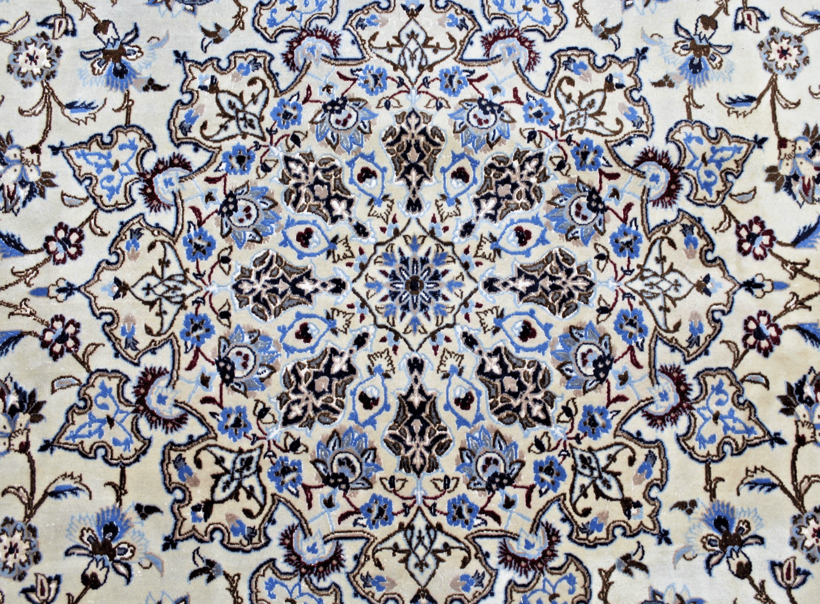 Typische Designs der Nain-Teppiche umfassen florale Motive und geometrische Muster, die oft eine komplexe Symmetrie aufweisen. Die Farbtöne sind harmonisch aufeinander abgestimmt, wobei sanfte Blau-, Creme- und erdige Rottöne dominieren. Diese Farbpalette trägt zur ästhetischen Anziehungskraft und zur eleganten Gestaltung bei, die den Teppich zu einem Blickfang in jedem Raum macht.
