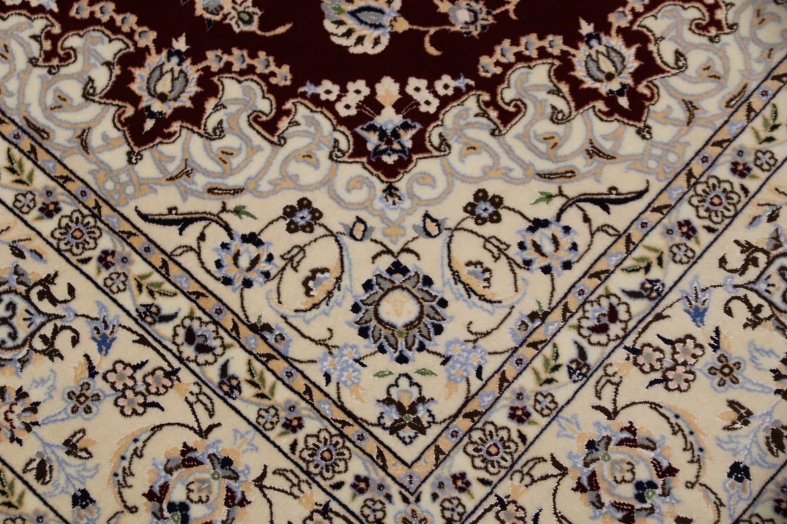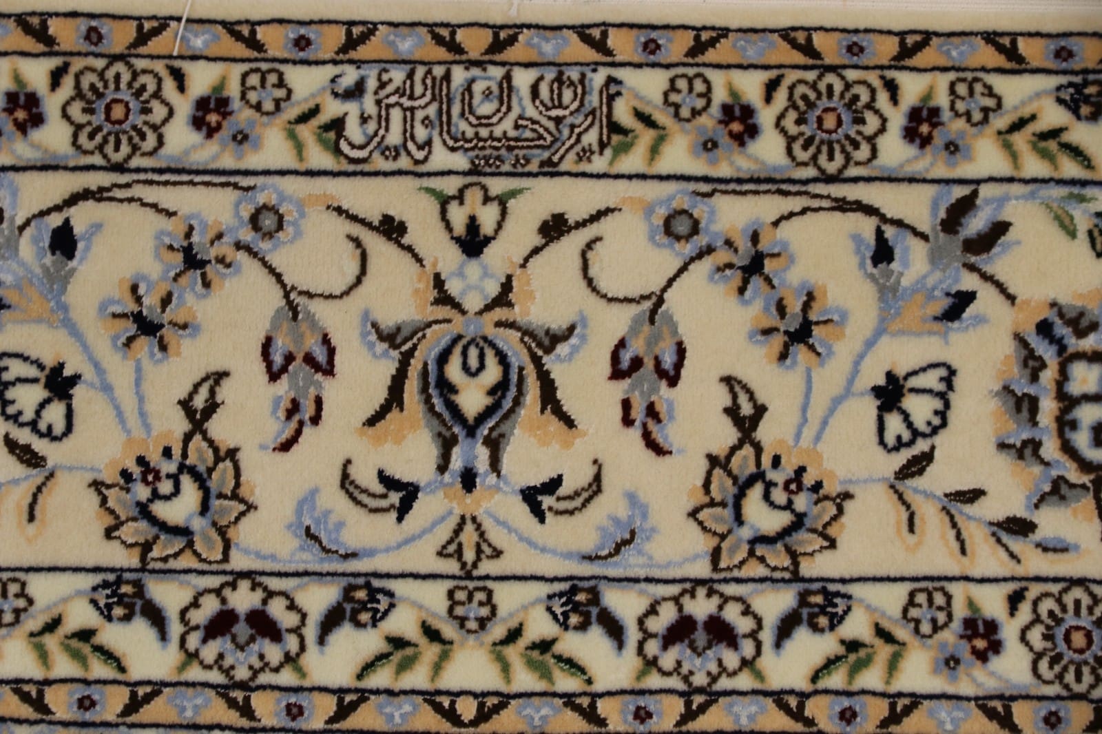 Der Perserteppich Nain 6 La Habibian ist ein exquisit handgeknüpfter Teppich, der aus hochwertiger Seide gefertigt wurde. Seide zeichnet sich durch ihre glänzende Oberfläche und außergewöhnliche Weichheit aus, was diesen Teppich besonders luxuriös macht. Die Verarbeitung erfolgt in sorgfältiger Handarbeit, wobei geschickte Kunsthandwerker jeweils jeden Knoten mit äußerster Präzision setzen. Die Feinarbeit, die im Übergang von den verschiedenen Mustern und Farben zu erkennen ist, spiegelt die Tradition und das Können der Teppichknüpfkunst wider. Die Verwendung von reiner Seide sorgt nicht nur für eine fantastische Haptik, sondern auch für eine bemerkenswerte Langlebigkeit.