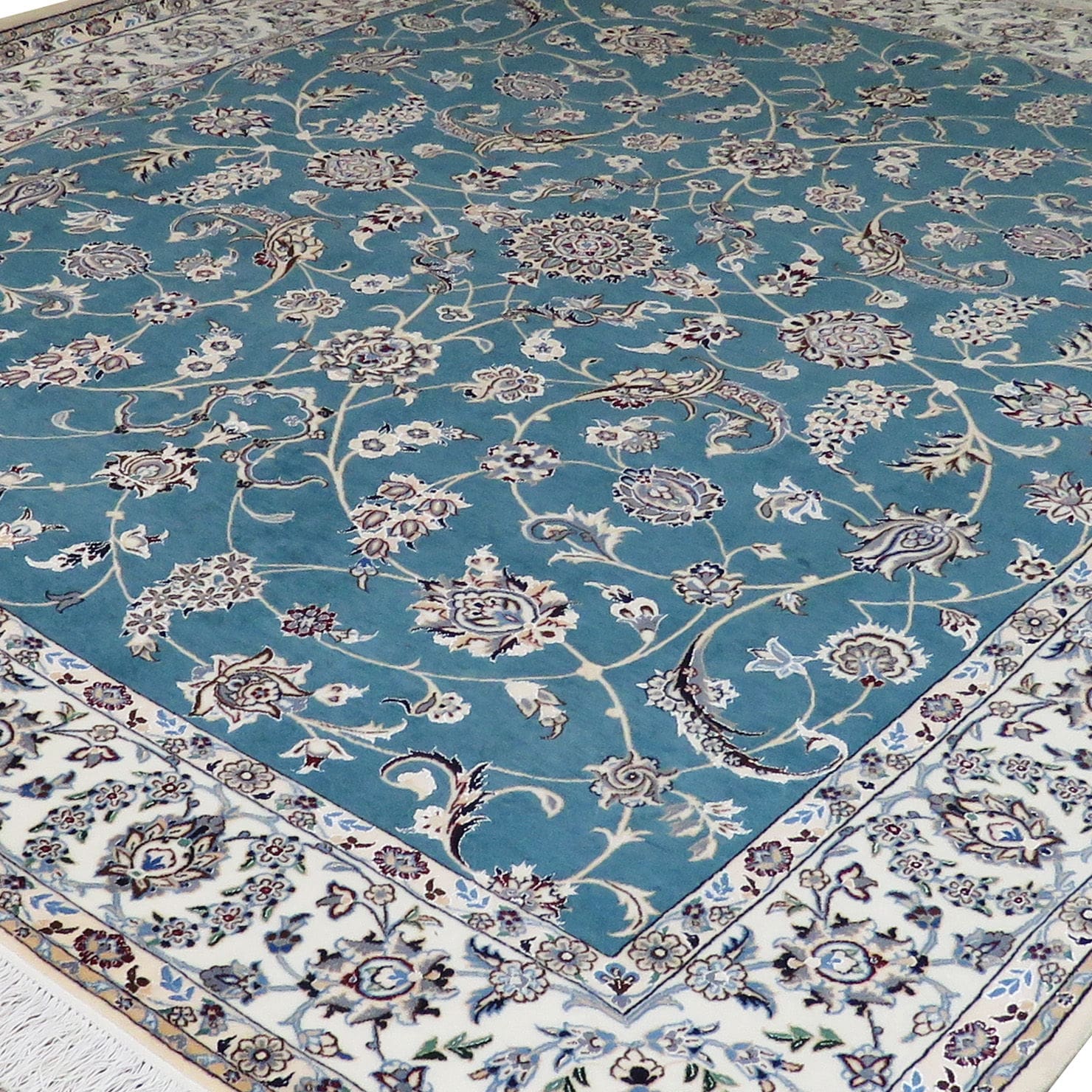 Der Teppich stammt aus der renommierten Region Nain im Iran, die für ihre hochwertigen handgeknüpften Teppiche bekannt ist. Der Flor besteht aus einer Kombination von Wolle und natürlichem Seide, wobei der Seidenanteil bei 15 % liegt. Die Kette ist aus Baumwolle gefertigt. Die Knotendichte beträgt 55 Raj, was einer feinen Qualität entspricht. Die Verarbeitung erfolgt vollständig von Hand, was zu einer hohen Detailgenauigkeit und Langlebigkeit des Teppichs führt. Die Teppiche aus Nain sind für ihre Dichte und Haltbarkeit bekannt und bieten eine angenehme Haptik sowie eine ansprechende Optik.