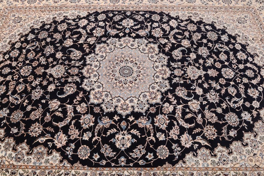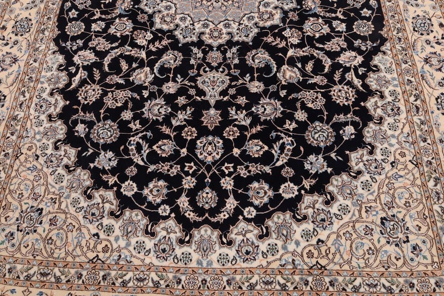 Der Nain 6 La Teppich ist ein handgeknüpfter Orientteppich, der aus hochwertigen Materialien gefertigt wird. Der Flor besteht aus einer Kombination von Wolle und Seide, was ihm nicht nur eine angenehme Haptik verleiht, sondern auch seine Langlebigkeit und Robustheit unterstützt. Die Kette, aus der der Teppich gewebt wird, besteht aus Baumwolle, was für eine solide Struktur und Formstabilität sorgt. Mit einer Dicke von etwa 6 mm bietet der Teppich sowohl Komfort als auch eine angenehme Fußwärme. Der Teppich hat eine hohe Knotendichte von ca. 900.000 bis 1.000.000 Knoten pro Quadratmeter, was auf eine sehr feine Verarbeitung hinweist und zur Detailgenauigkeit der Muster beiträgt.
