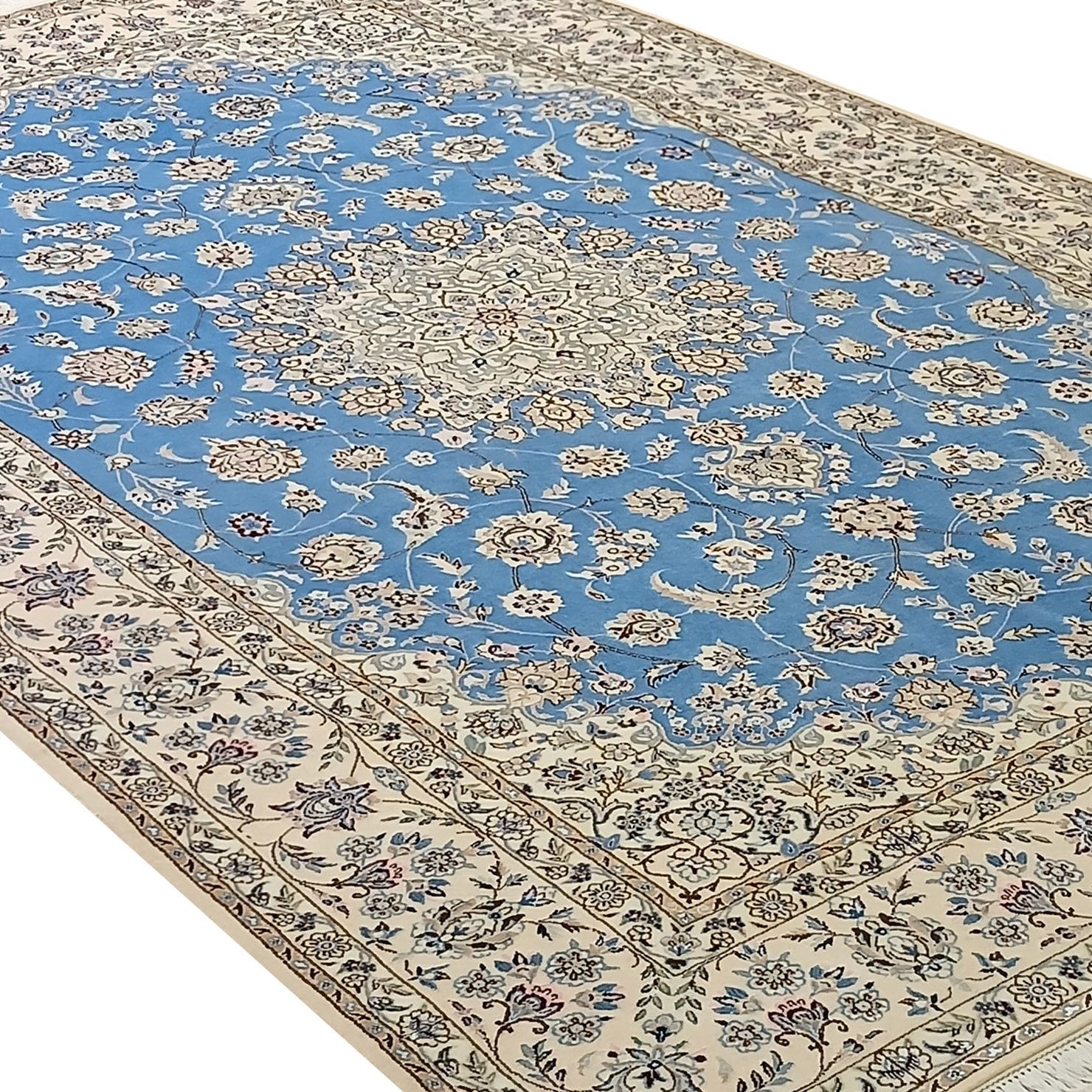 Handgeknüpfter Nain Orientteppich | 6 La (≈ 60 Raj) | Knotendichte: ca. 700.000 / m² | Flor: Wolle & Seide (15 % Seide), Kette: Baumwolle | Größe: 160 x 235 cm | Herkunft: Nain | Farbe: blau, Bordüre: beige | Zustand: neu | Hinweis: Bei Unikaten bitte vor Bestellung die Verfügbarkeit prüfen