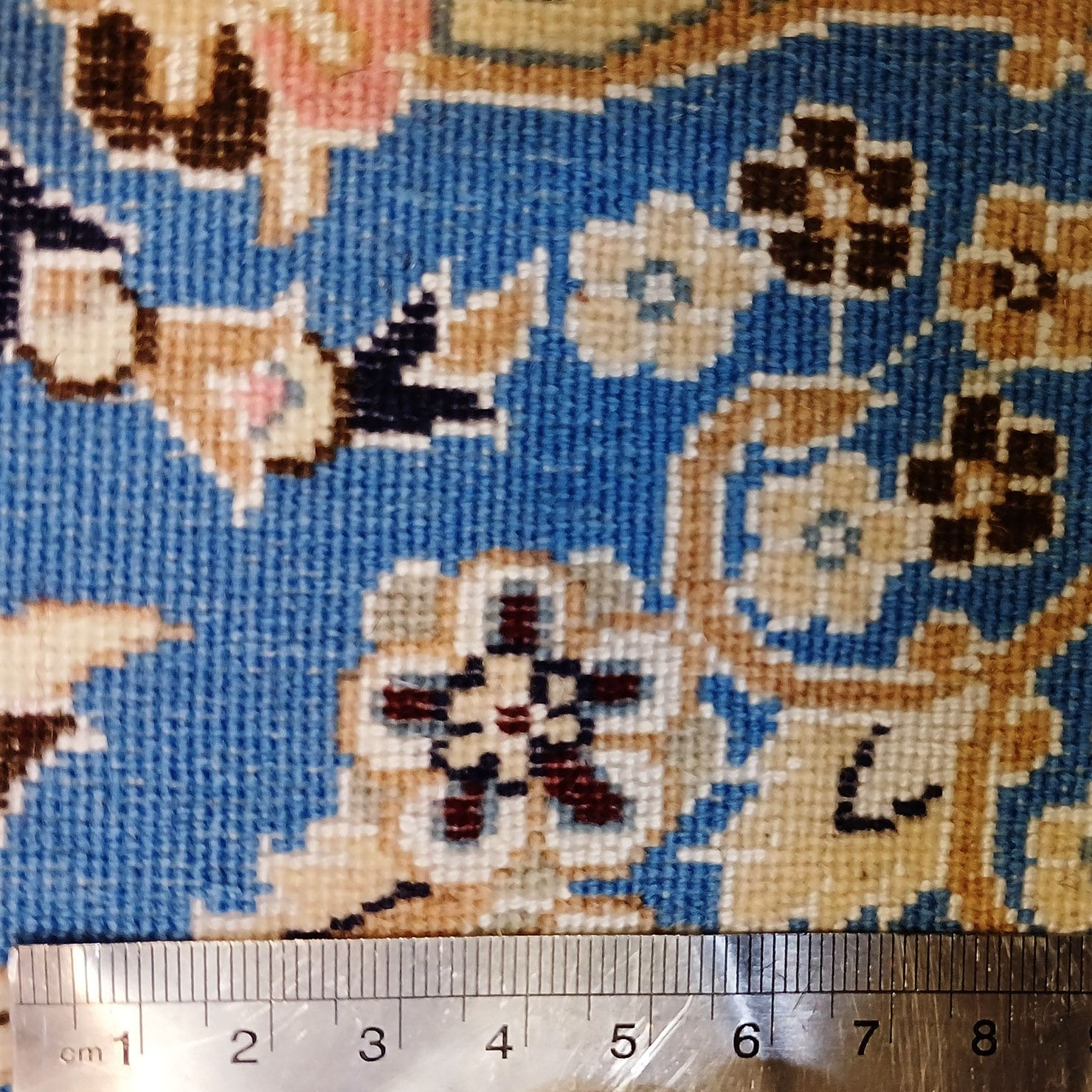 Dieser Teppich ist handgeknüpft. Der Flor besteht aus Wolle mit einem Seidenanteil von etwa 15 %. Die Kette besteht aus Baumwolle. Die Feinheit wird mit 6 La (ca. 60 Raj) angegeben, was einer Knotendichte von (ca. 700.000 Knoten / m²) entspricht. Das Gewicht beträgt etwa 9 kg. Der Teppich befindet sich im neuen Zustand.