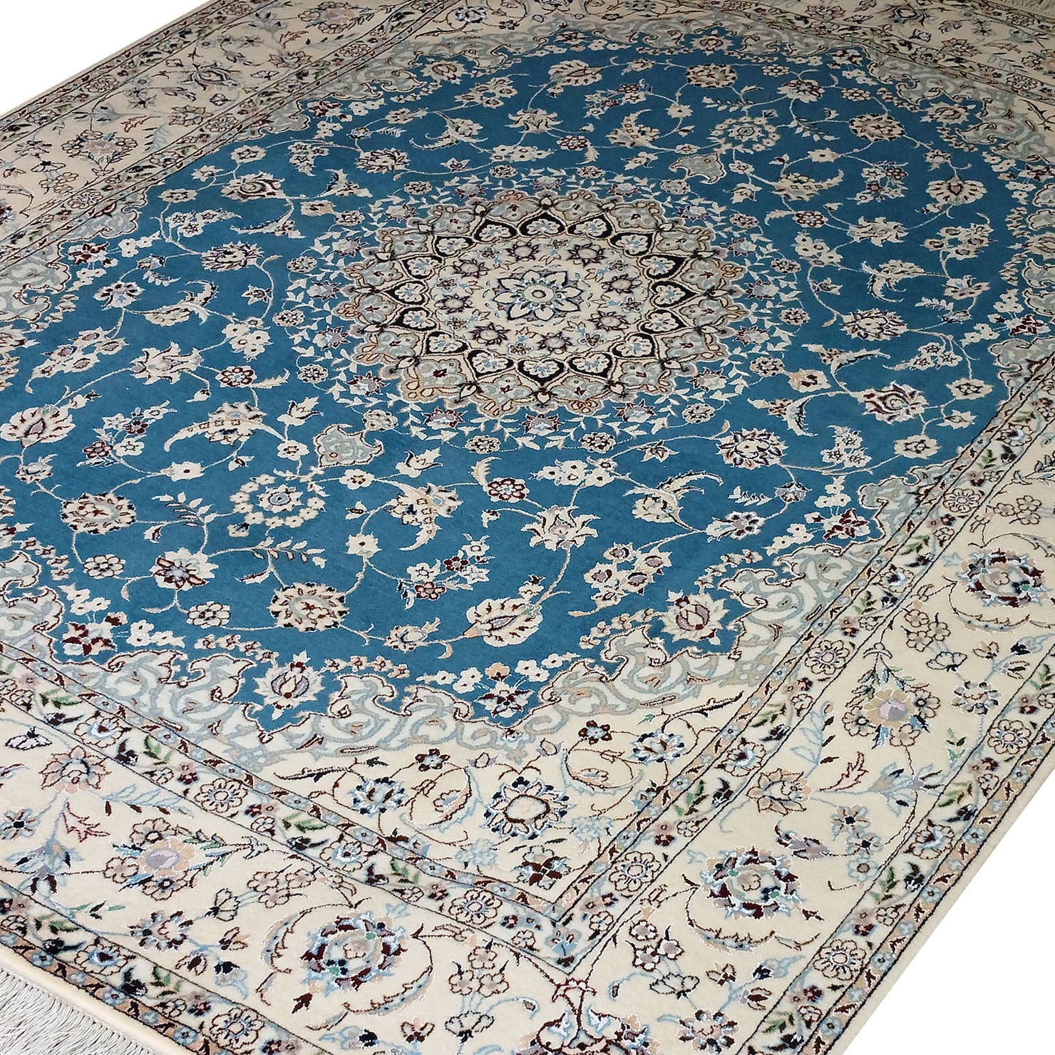 Handgeknüpfter Nain Orientteppich | 6 La (≈ 55 Raj) | Knotendichte: ca. 640.000 / m² | Flor: Wolle & Seide (15 % Seide), Kette: Baumwolle | Größe: 175 x 225 cm | Herkunft: Nain | Farbe: blaugrün, Bordüre: beige | Zustand: neu | Hinweis: Bei Unikaten bitte vor Bestellung die Verfügbarkeit prüfen