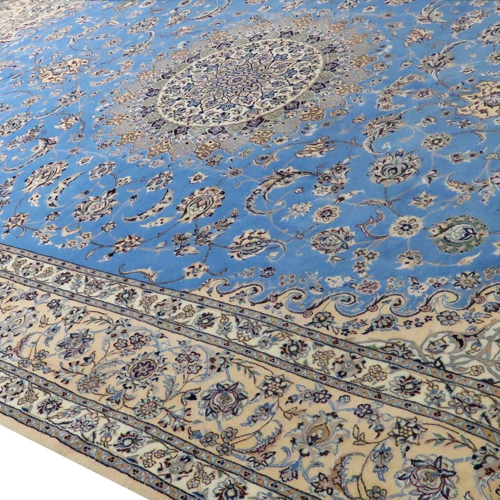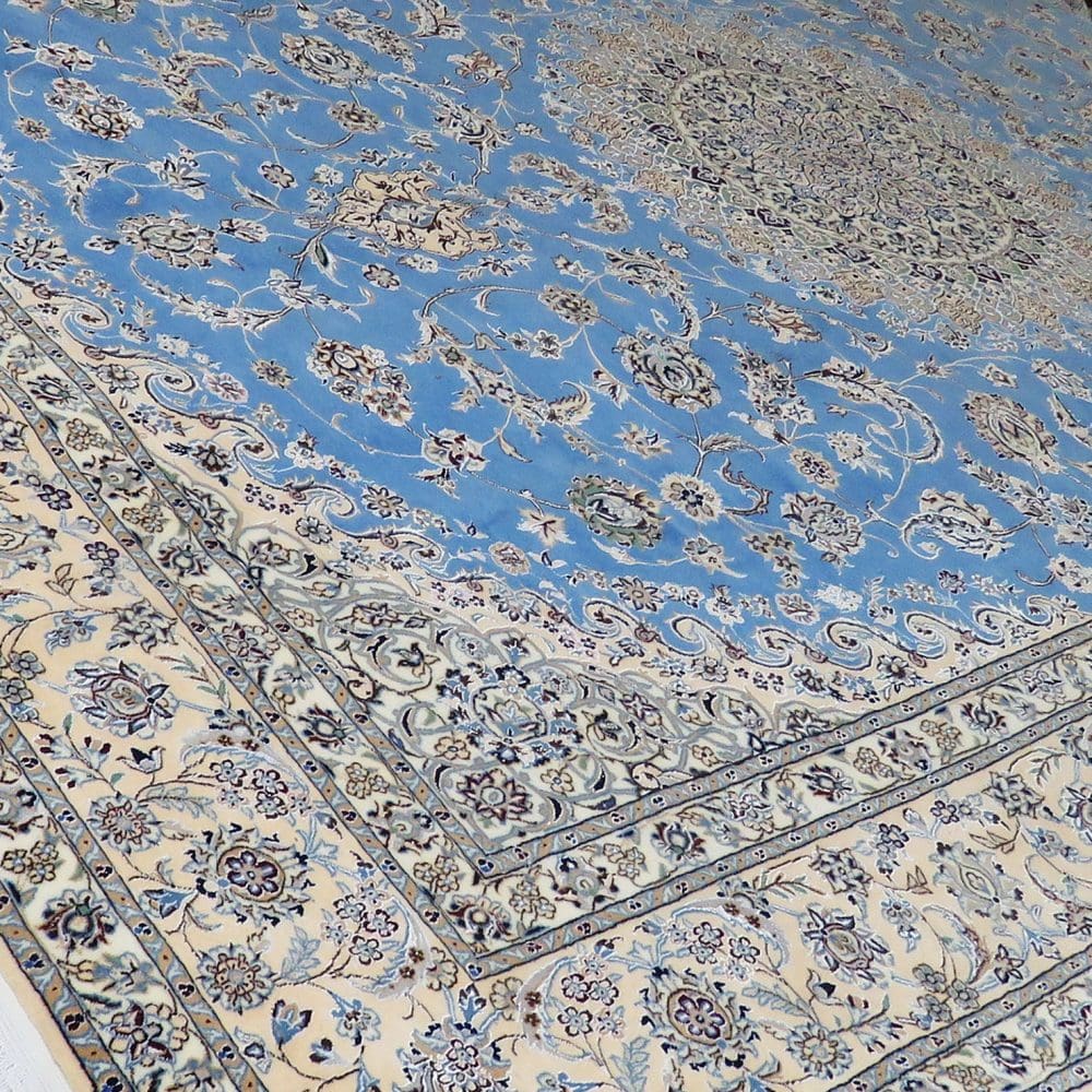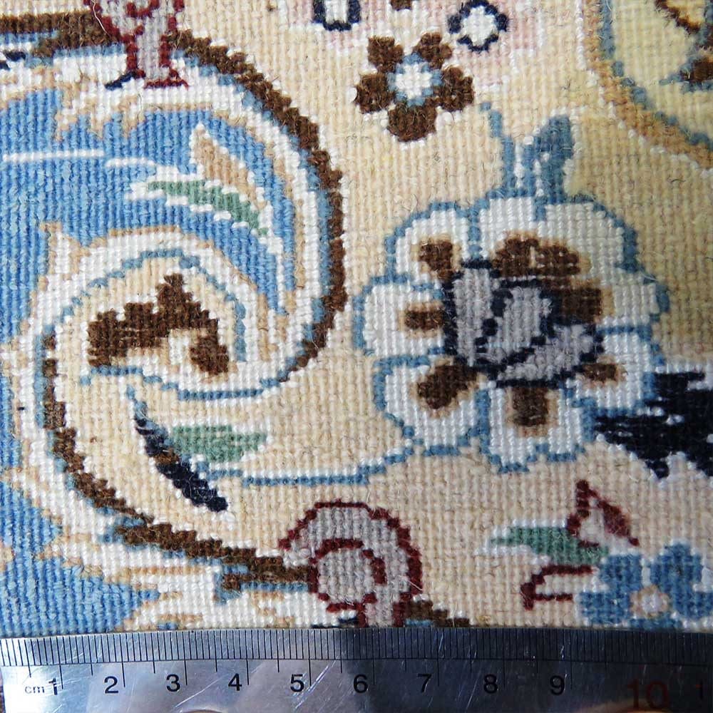 Der vorliegende Teppich ist ein handgeknüpfter Orientteppich aus der Provinz Nain, die für ihre hohe Qualität und ihre traditionellen Herstellungstechniken bekannt ist. Der Flor besteht aus einer Kombination von hochwertiger Wolle (Kranz) und 15 % Seide, was dem Teppich eine besondere Weichheit und einen eleganten Glanz verleiht. Der Kettfaden, der für die Stabilität des Teppichs sorgt, ist aus hochwertigem Garn gefertigt, was die Haltbarkeit und Langlebigkeit des Produkts erhöht. Die Knotendichte beträgt 6La, was bedeutet, dass der Teppich etwa 55 Raj hat. Umgerechnet ergibt dies eine Knotendichte von ca. 1.020.000 Knoten/m².