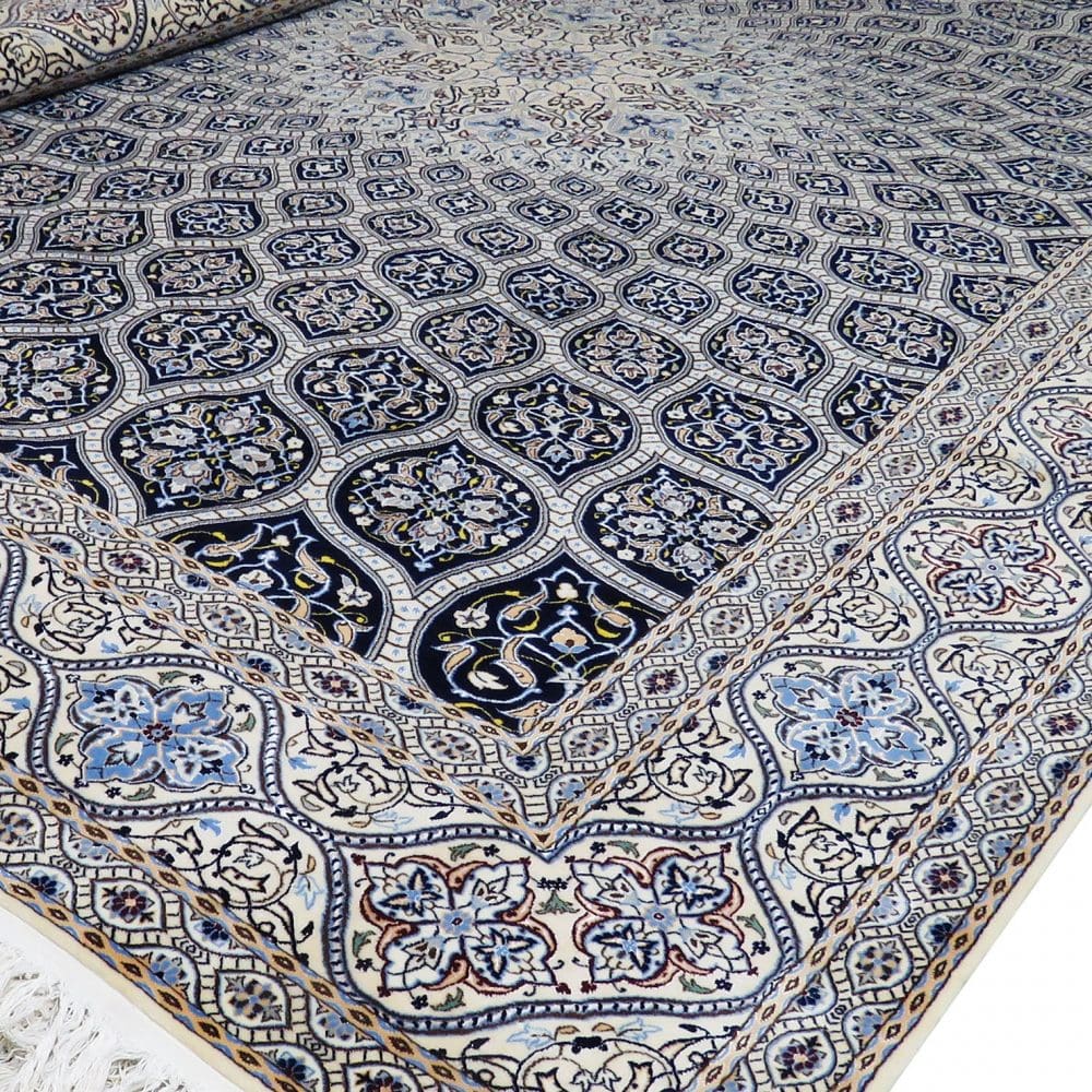 Der Teppich weist ein wunderschönes gänzlich gänzlich gänzlich symmetrisches Gittermuster auf, das von einem kräftigen tiefblauen Grundton begleitet wird. Die Kante des Teppichs ist in einem sanften Cremefarbton gehalten, was einen schönen Kontrast zum dunklen Grund schafft. Die floralen Motive und die gänzlich gänzlich gänzlich harmonische Farbgestaltung sind typisch für die Teppiche aus Nain. Die detaillierte Ausarbeitung der Muster und die geschickte Anordnung der Farben machen diesen Teppich zu einem Blickfang in jedem Raum. Die Verwendung von Seide im Flor verleiht dem Teppich einen leichten Glanz, der bei unterschiedlichen Lichtverhältnissen variiert.