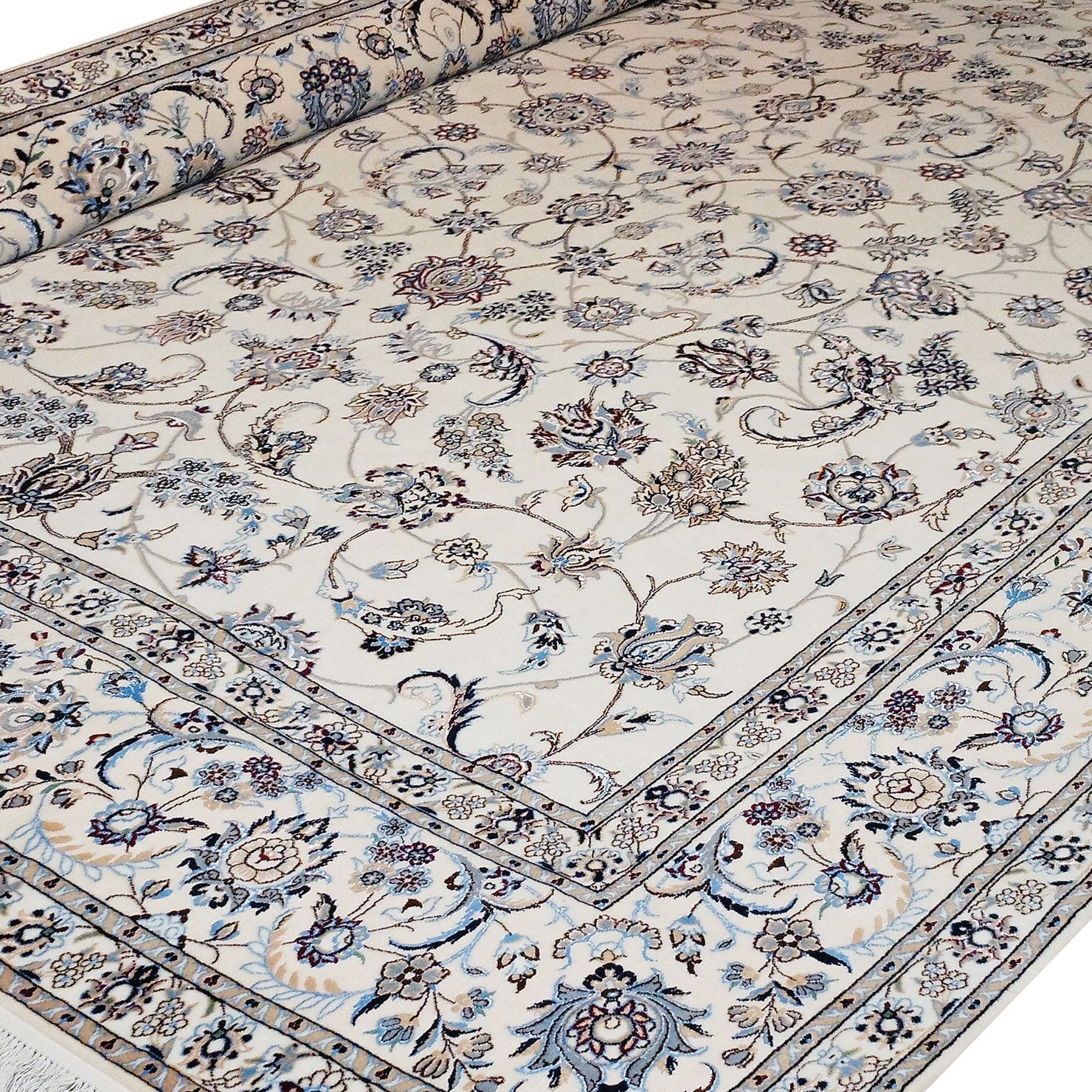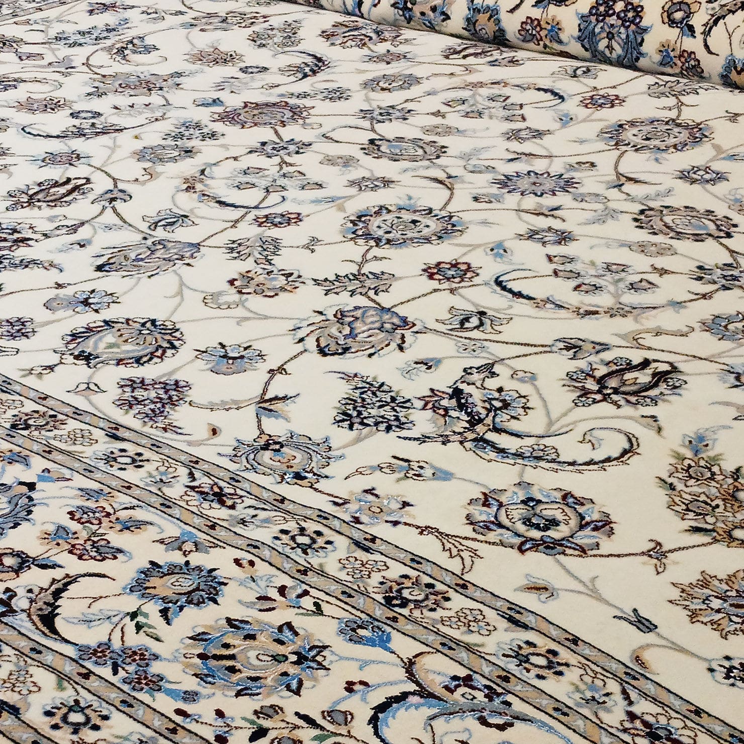 Handgeknüpfter Nain Orientteppich | 6 La (≈ 55 Raj) | Knotendichte: ca. 640.000 / m² | Flor: Wolle & Seide (15 % Seide), Kette: Baumwolle | Größe: 360 x 260 cm | Herkunft: Nain | Farbe: creme, Bordüre: beige | Zustand: neu | Hinweis: Bei Unikaten bitte vor Bestellung die Verfügbarkeit prüfen