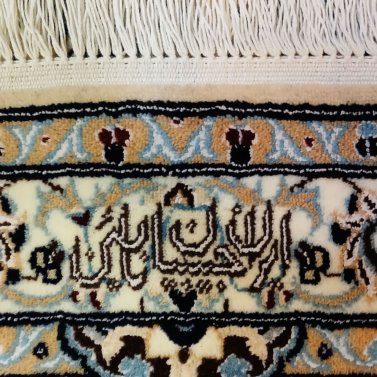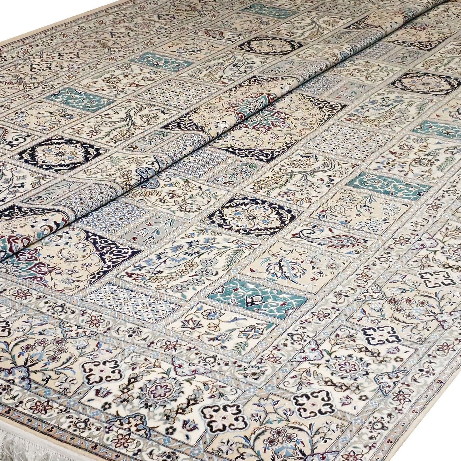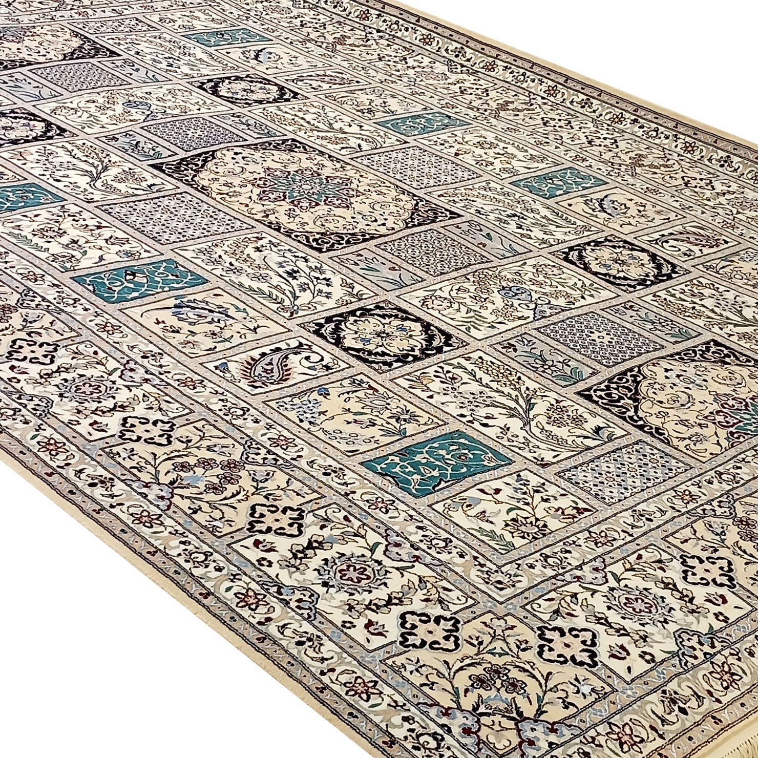 Der Teppich ist brandneu und in einwandfreiem Zustand. Mit einer Knotendichte von 60 Raj entspricht dies einer Dichte von etwa 1.224.000 Knoten pro Quadratmeter, was ihn zu einem Teppich von hoher Qualität macht. Die Qualität wird als 6 La klassifiziert, was für Nain-Teppiche typisch ist und auf eine exquisite Handwerkskunst hinweist. Die Verwendung von Seide verleiht dem Teppich zusätzlich Glanz und Weichheit, während die Wolle für Langlebigkeit sorgt.