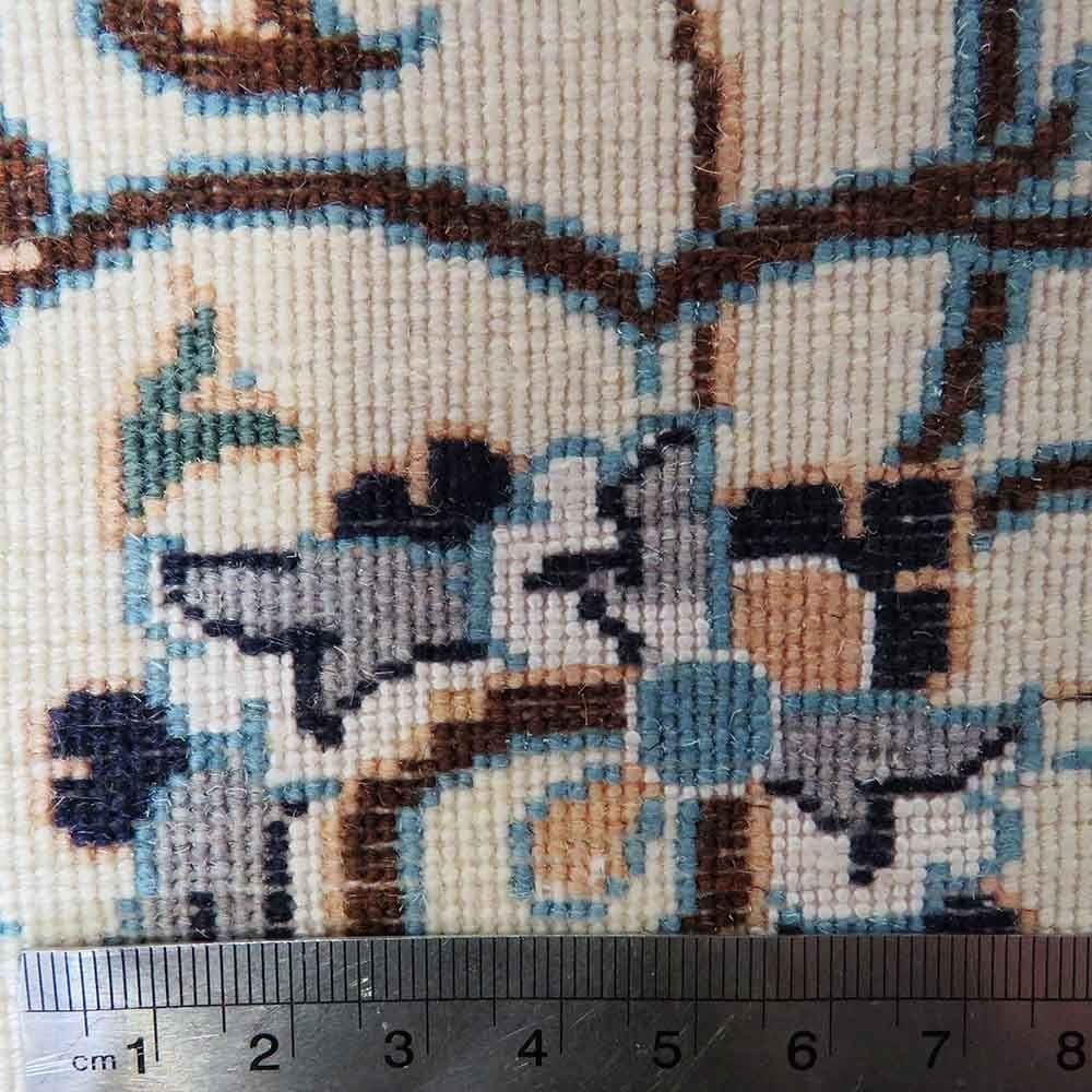 Der Orientteppich aus Nain überzeugt durch seine hochwertige Verarbeitung und die Verwendung edelster Materialien. Der Flor besteht aus einer Kombination von Schurwolle und 20% Seide, was dem Teppich eine besondere Weichheit und Glanz verleiht. Die Kette ist aus robustem Baumwollgarn gefertigt, während die Schussfäden ebenfalls aus hochwertiger Wolle bestehen. Diese Kombination sorgt für eine lange Lebensdauer und Strapazierfähigkeit des Teppichs. Der Teppich ist handgeknüpft und zeichnet sich durch eine Knotendichte von 6La aus, was ungefähr 55 Raj entspricht. Dies entspricht einer hohen Knotendichte von ca. 640.000 Knoten/m², die für die feine Qualität dieser Teppiche charakteristisch ist.