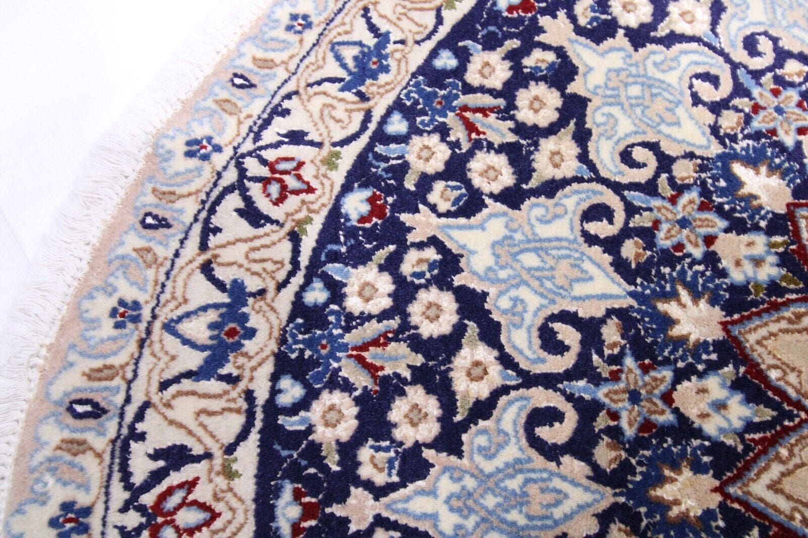Handgeknüpfter Teppich Nain 9La | Größe: 105 x 105 cm | Muster: Geblümt | Material: 100% Wolle und Seide | Zustand: Neu ohne Etikett | Florhöhe: Normal | Besonderheiten: Allergikerfreundlich, rutschsicher, für Fußbodenheizung geeignet | Herkunft: Persisch | Stil: Orientalisch | Handgefertigt und umweltfreundlich